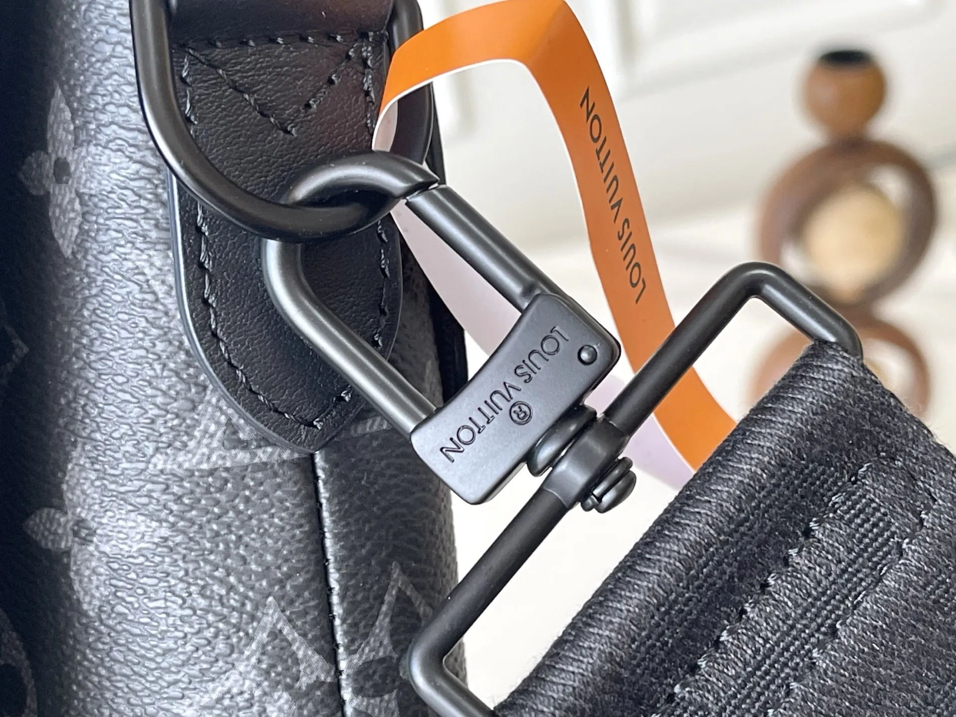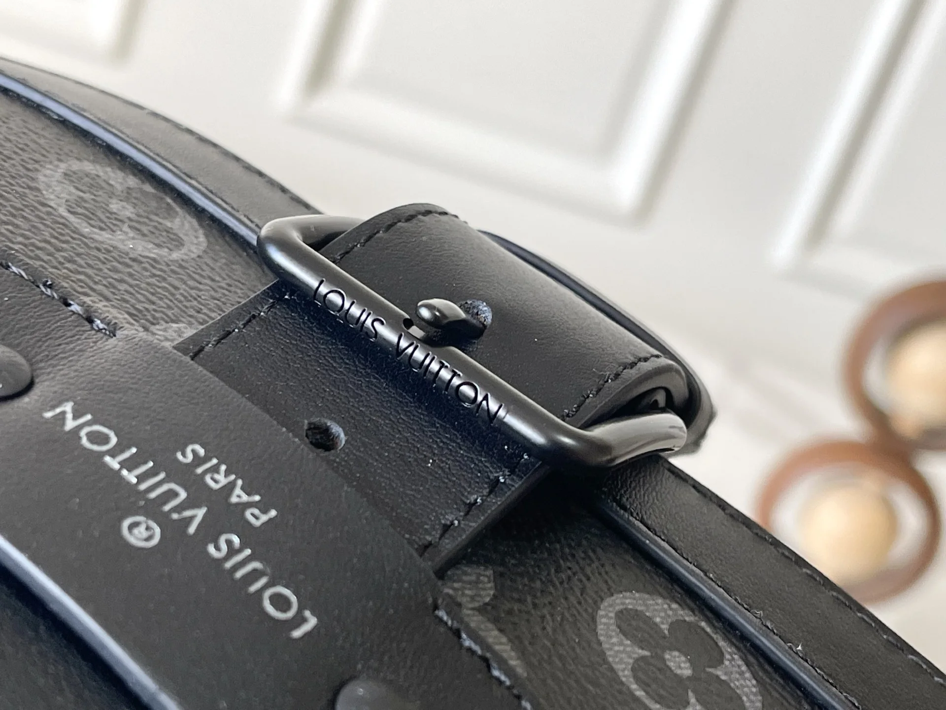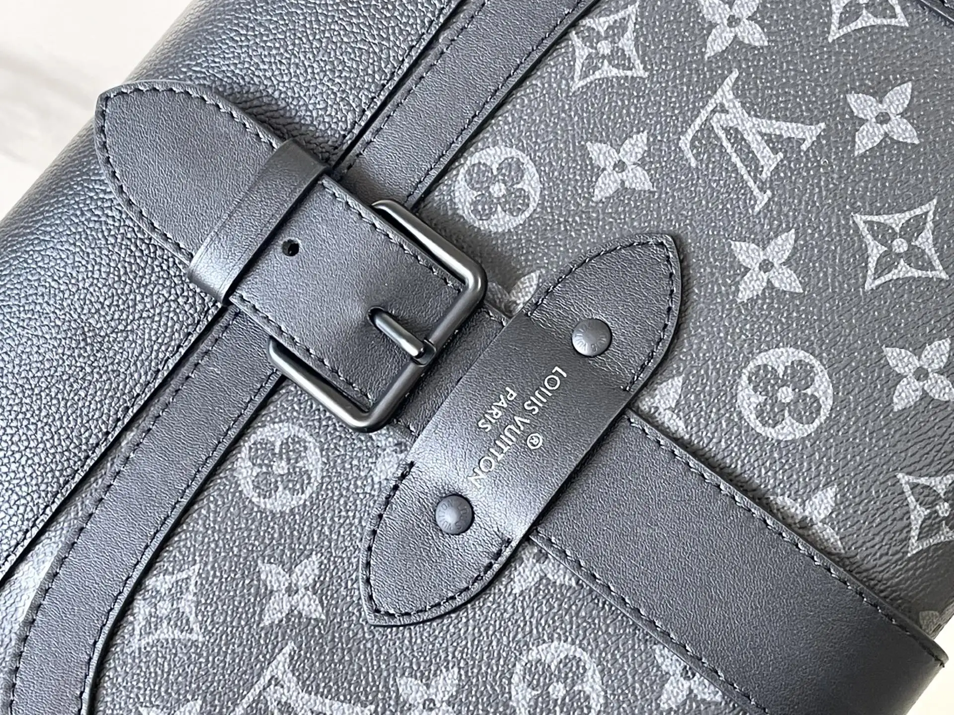 M45911黑花 男士邮差包系列 本款全新邮差包致敬路易威登于 1986 年推出的标志性马术风 Saumur 手袋 以 Monogram Eclipse 帆布和粒面皮革的结合赋予此经典单品摩登气质 搭扣肩带含有磁扣 休闲时尚 适合日常背携 尺寸 36 x 23 x 11 厘米