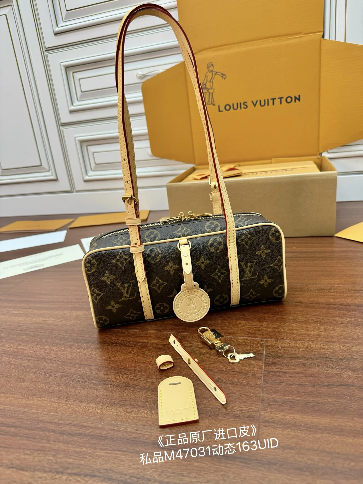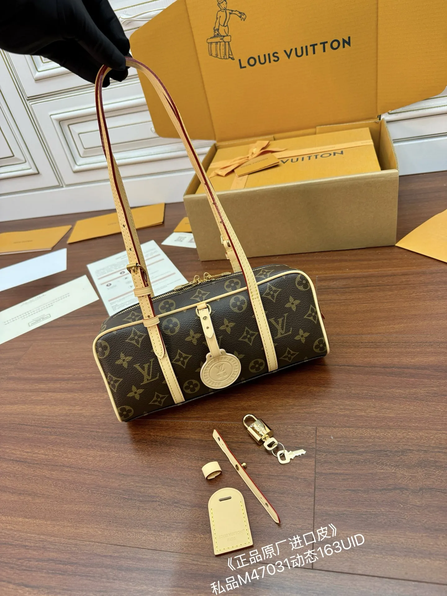独家(正品原厂进口皮)首发型号 M47031私品 163动态UID 进口菱形面料 品质和材料第九次再次升级 专柜同步 动态电子芯片 礼品袋 保护纸 铜版电子标签 合格证 皮料是正品代工厂意大利A级树膏皮 私品 是在于品质 五金 面料 手工 油边 是A级出品 拍摄图跟产品一致丶配图上的全套包装.尺寸 26x11.5x605CM