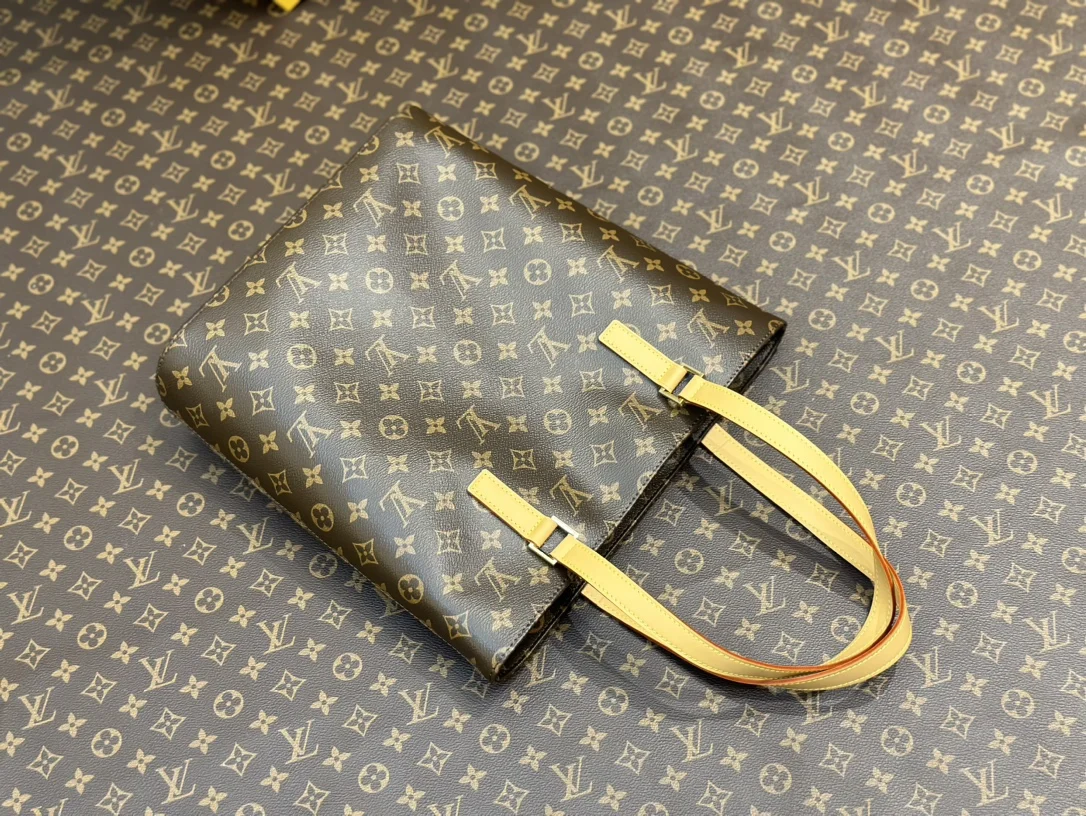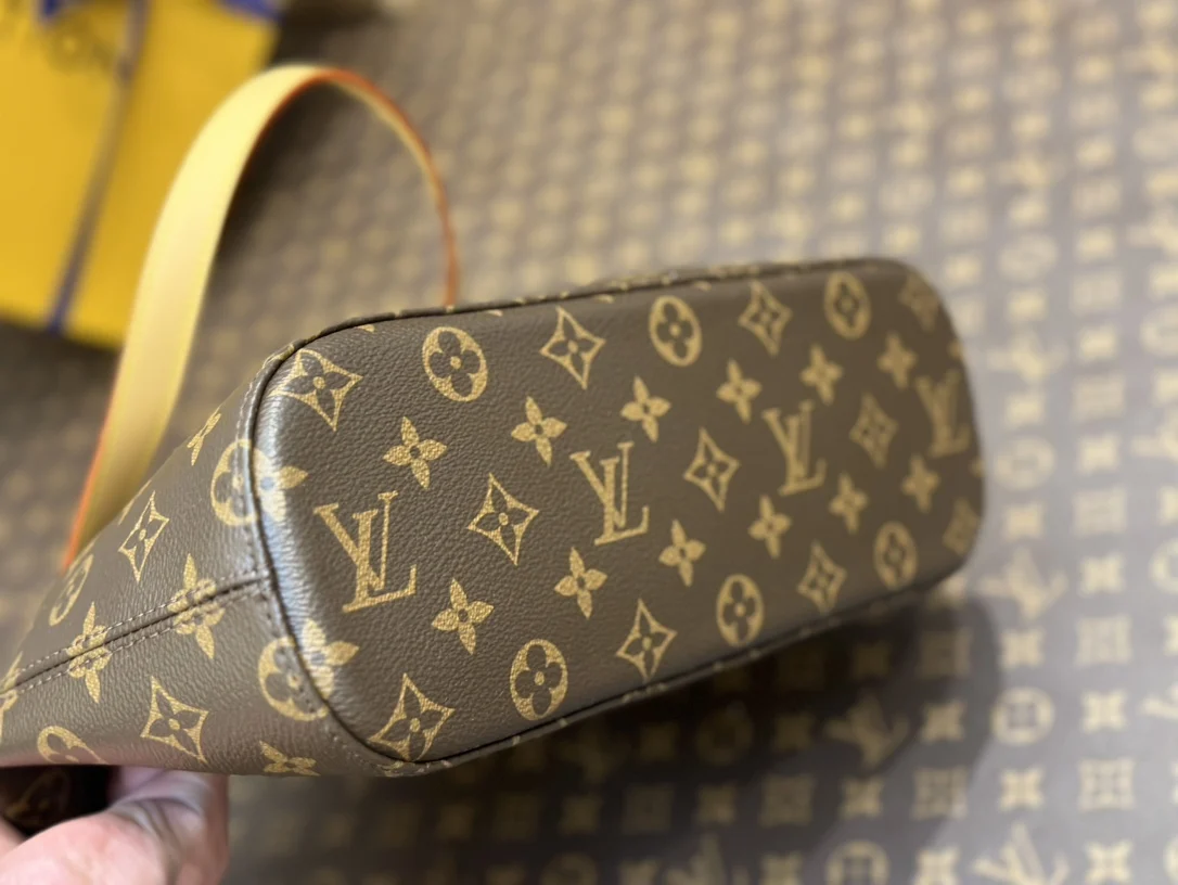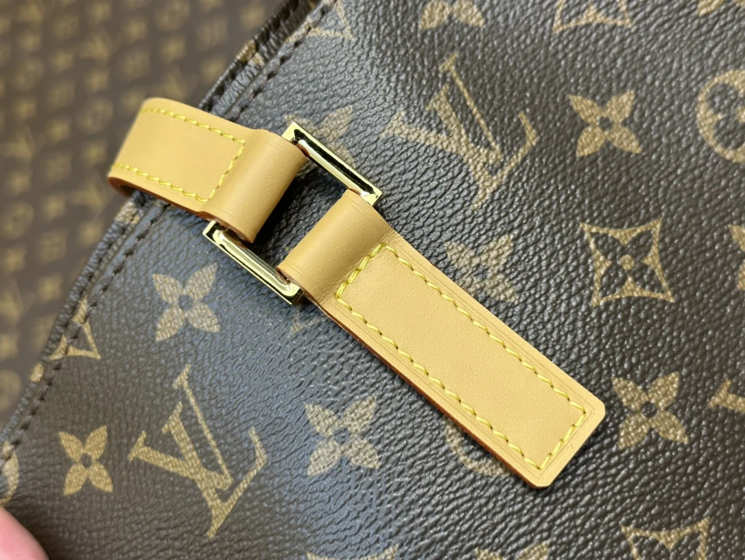 M51170中 Vivian菜篮子外层采用Monogram帆布一织物内衬一天然牛皮饰边 经典柔软Monogram面料搭配变色黄皮饰边 以一个日常购物完会拿到的购物袋为蓝本展开设计 小牛皮做材质制作 配以变色皮手柄及内袋细节 大容量包身 通勤包又一新选择 Size:30*32*11