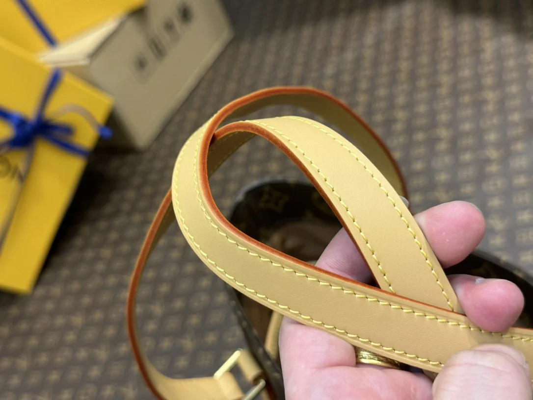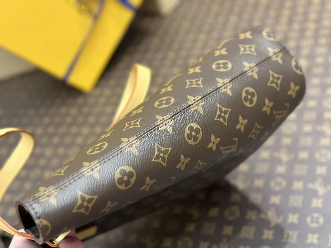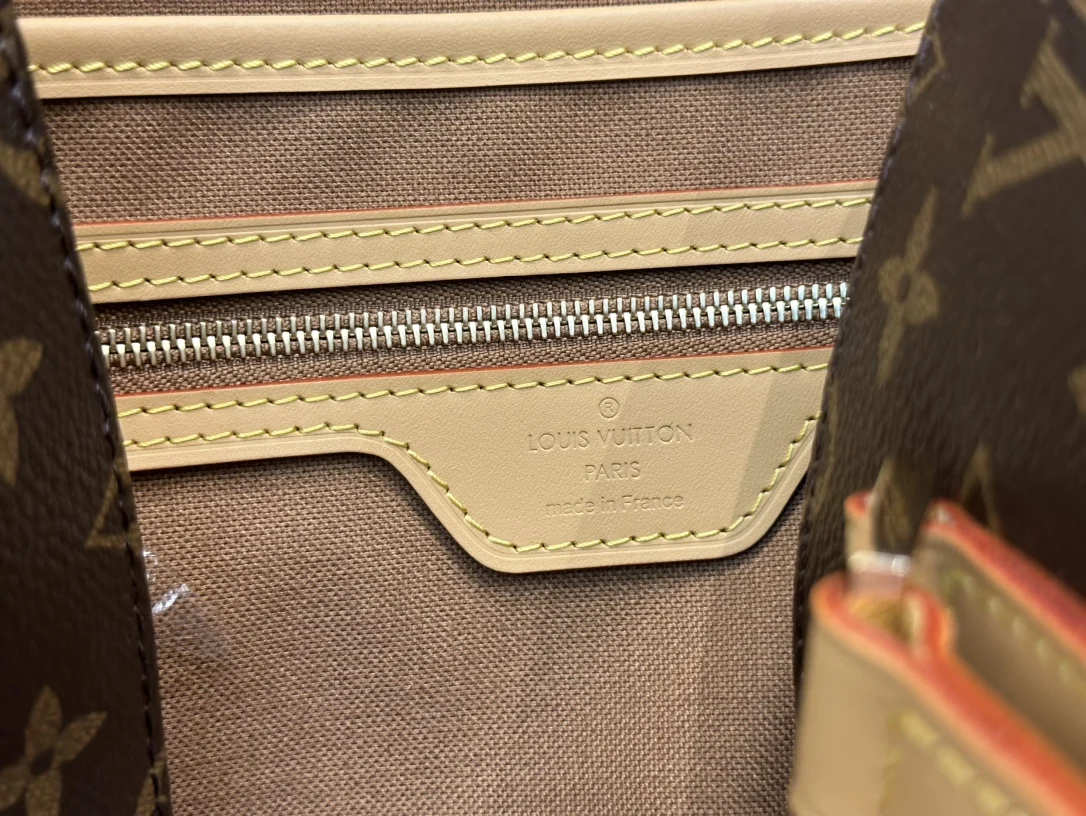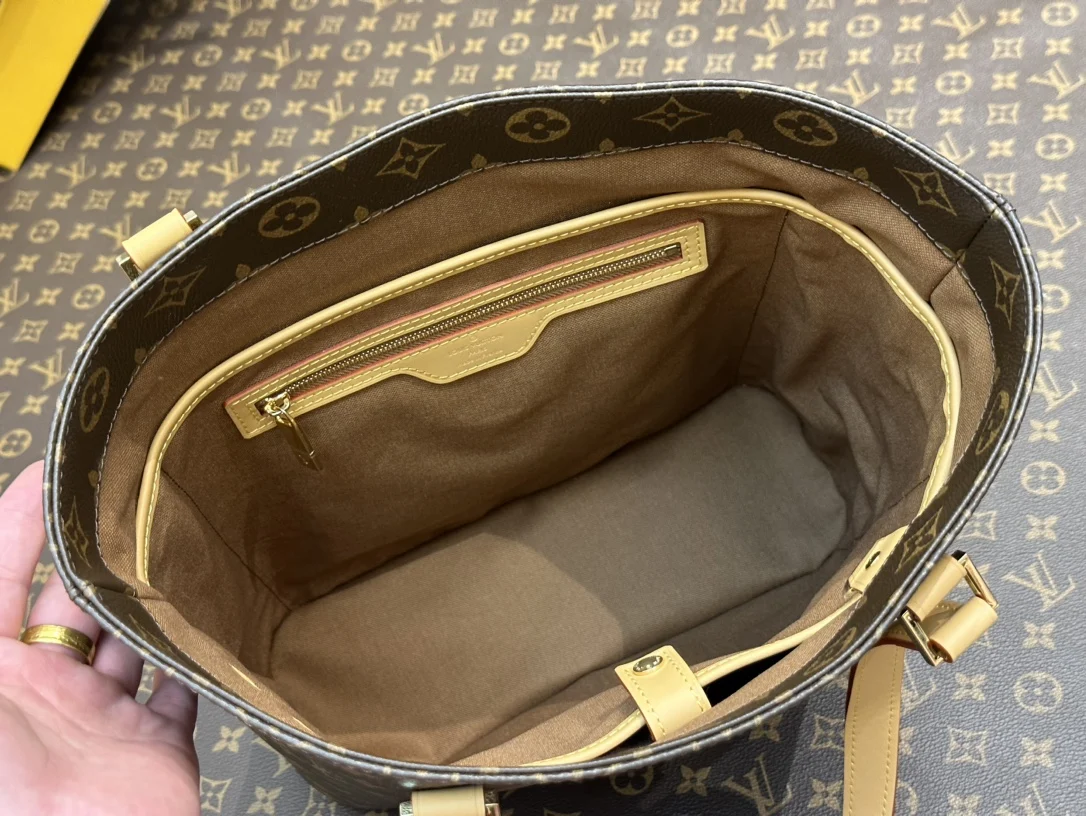 M51170中 Vivian菜篮子外层采用Monogram帆布一织物内衬一天然牛皮饰边 经典柔软Monogram面料搭配变色黄皮饰边 以一个日常购物完会拿到的购物袋为蓝本展开设计 小牛皮做材质制作 配以变色皮手柄及内袋细节 大容量包身 通勤包又一新选择 Size:30*32*11