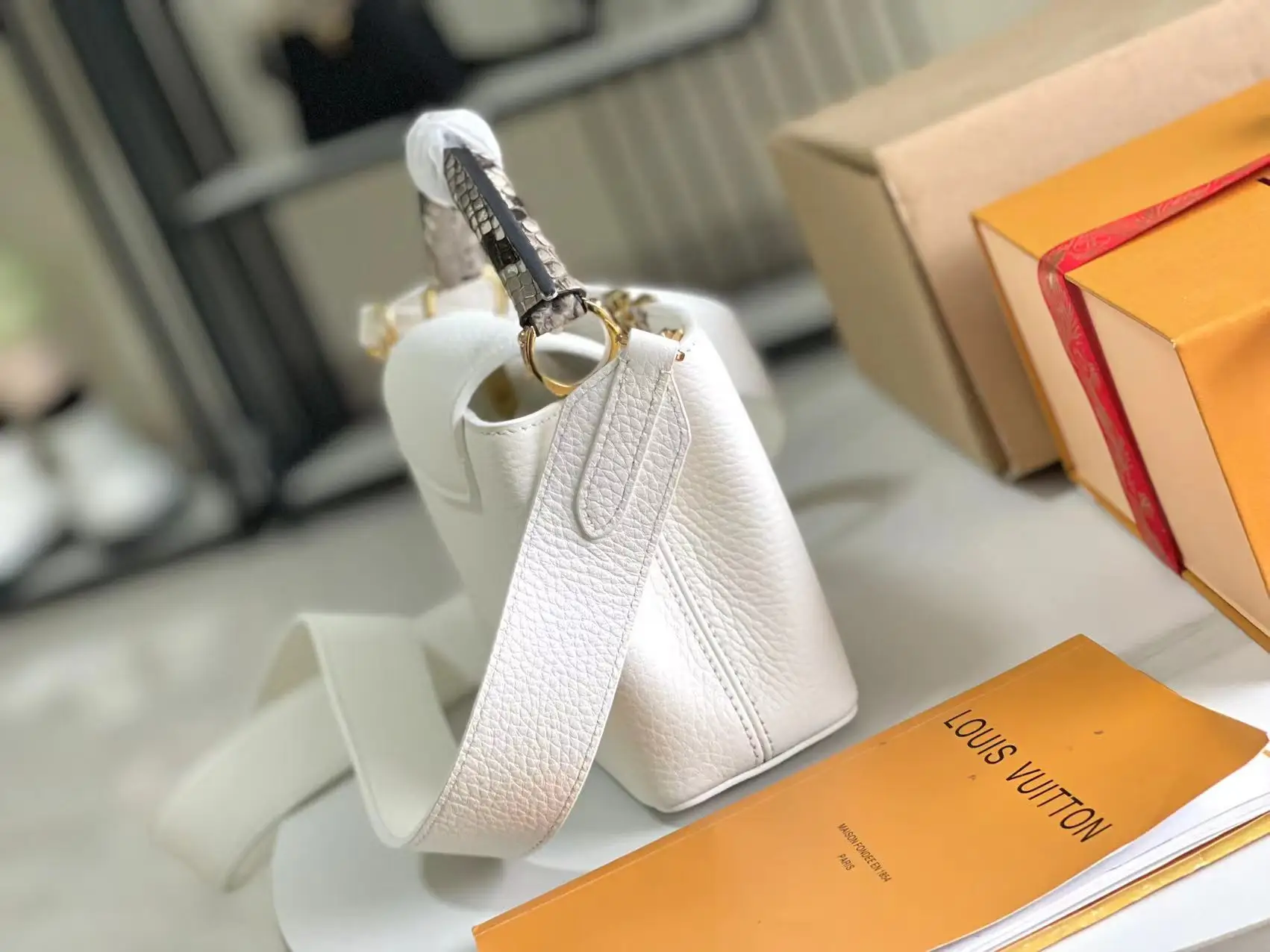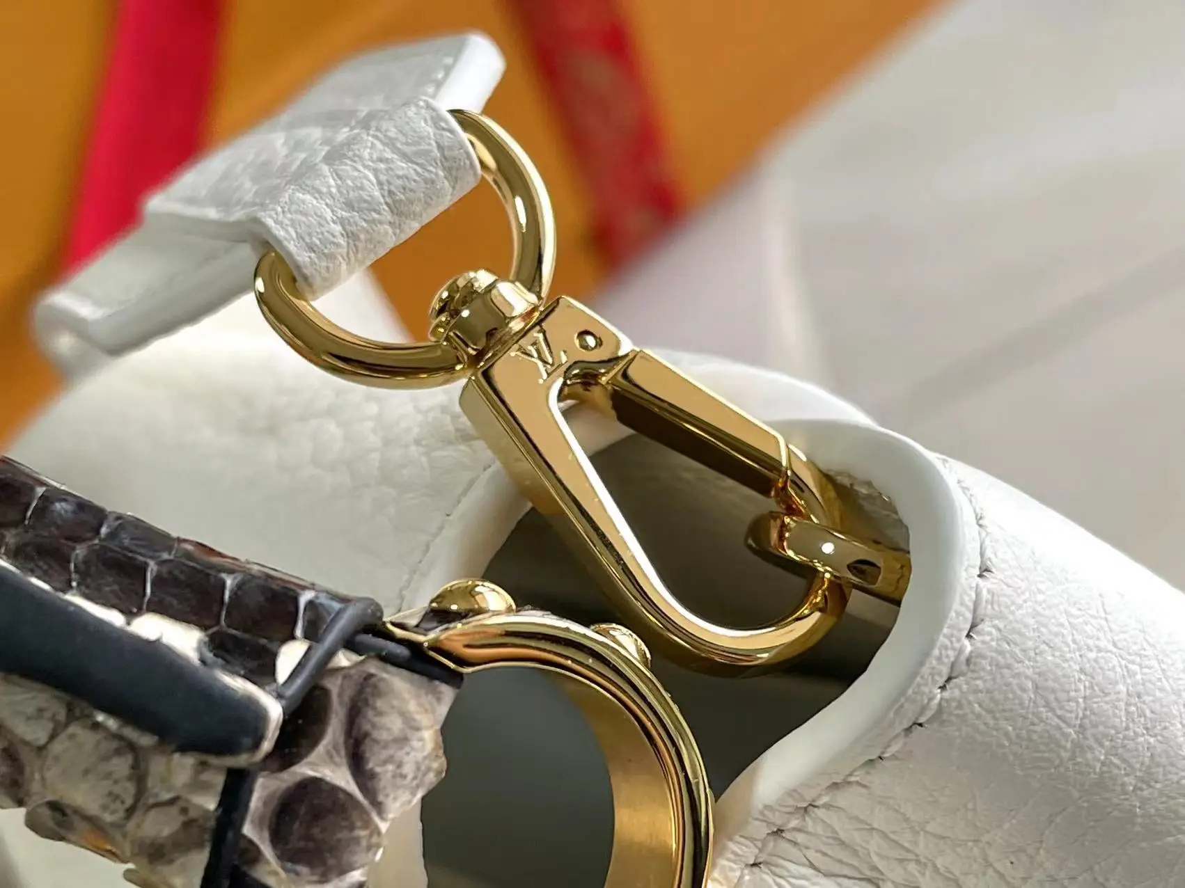 163 芯片 特级配全套包装 特级精品原厂皮M98477升级版蛇皮M55921白色鳄鱼蛇金扣 首款由全粒纹Taurillon小牛皮裁制而成的Capucines迷你手袋 顶部手柄 配有饰钉的侧边圆环以及标识处均裹有对比色蜥蜴皮 展现低调而细腻的奢华质感
