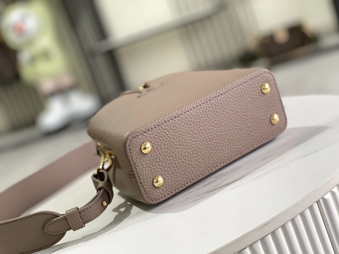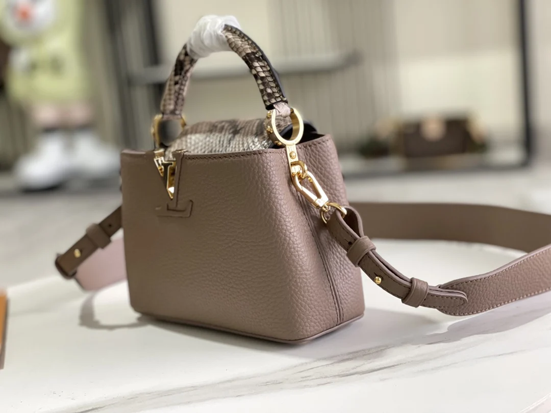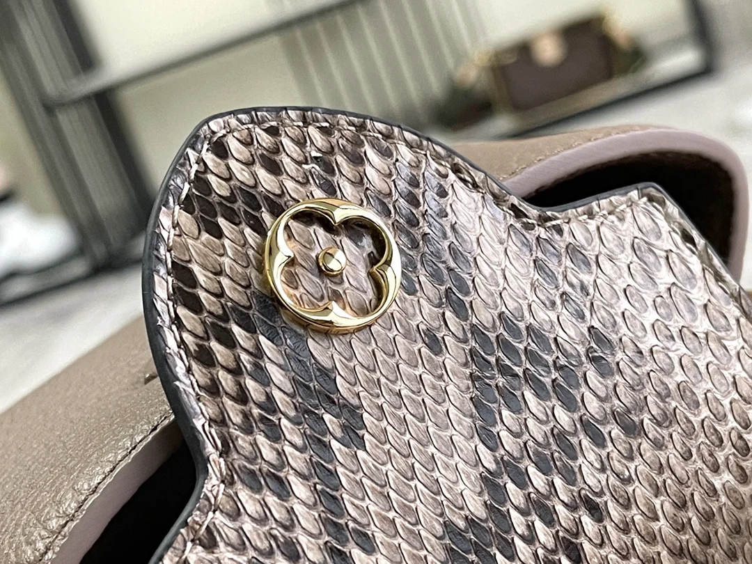 163 芯片 特级精品原厂皮 M80041深咖配蟒蛇金扣 本款 Capucines 迷你手袋取材深染 Taurillon 皮革 以华丽蟒蛇皮点缀手柄和翻盖 无论手提或系上宽肩带肩背 均可在任意场合释放瞩目格调