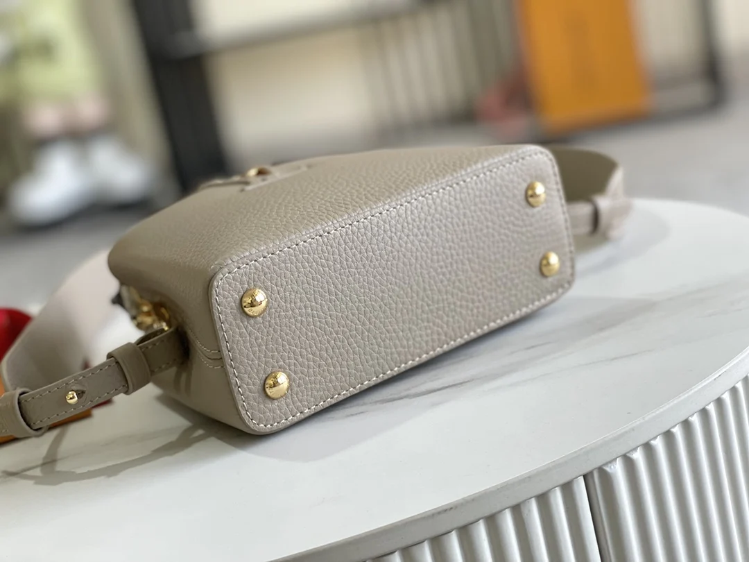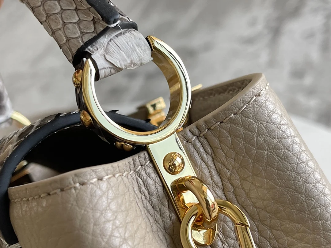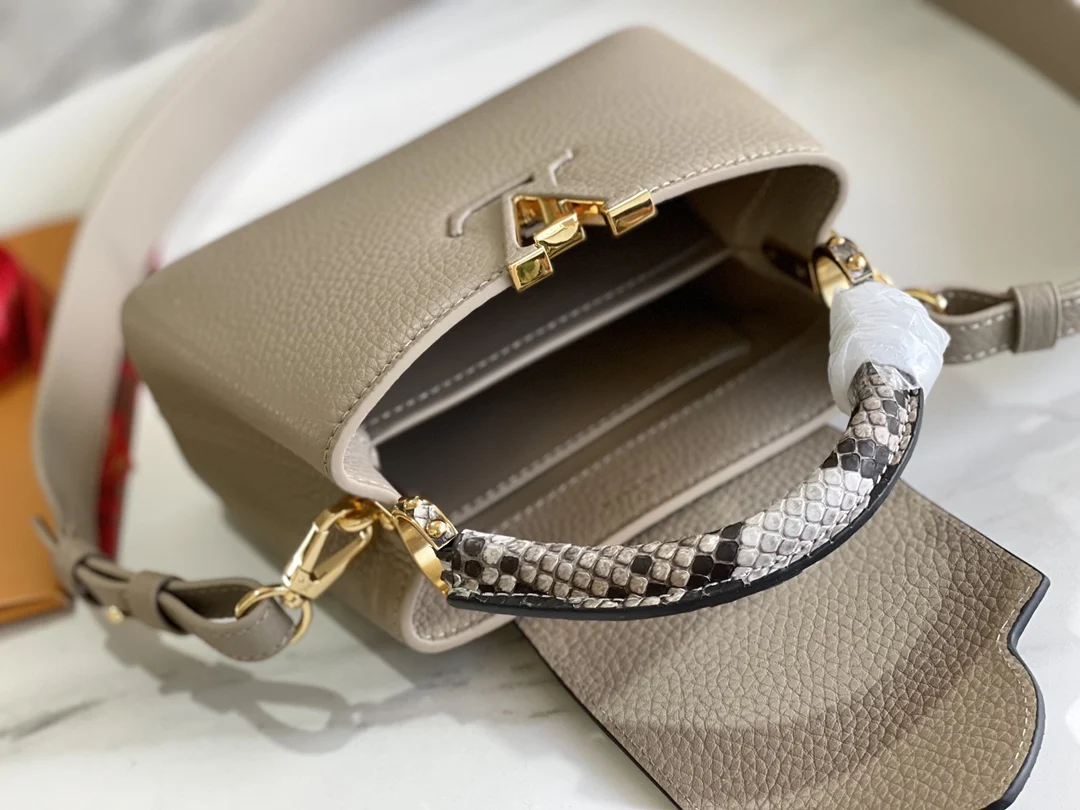 163 芯片 特级精品原厂皮 M80041浅咖配蟒蛇金扣 本款 Capucines 迷你手袋取材深染 Taurillon 皮革 以华丽蟒蛇皮点缀手柄和翻盖 无论手提或系上宽肩带肩背 均可在任意场合释放瞩目格调