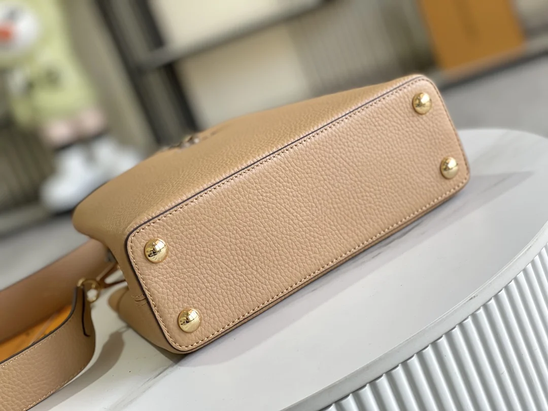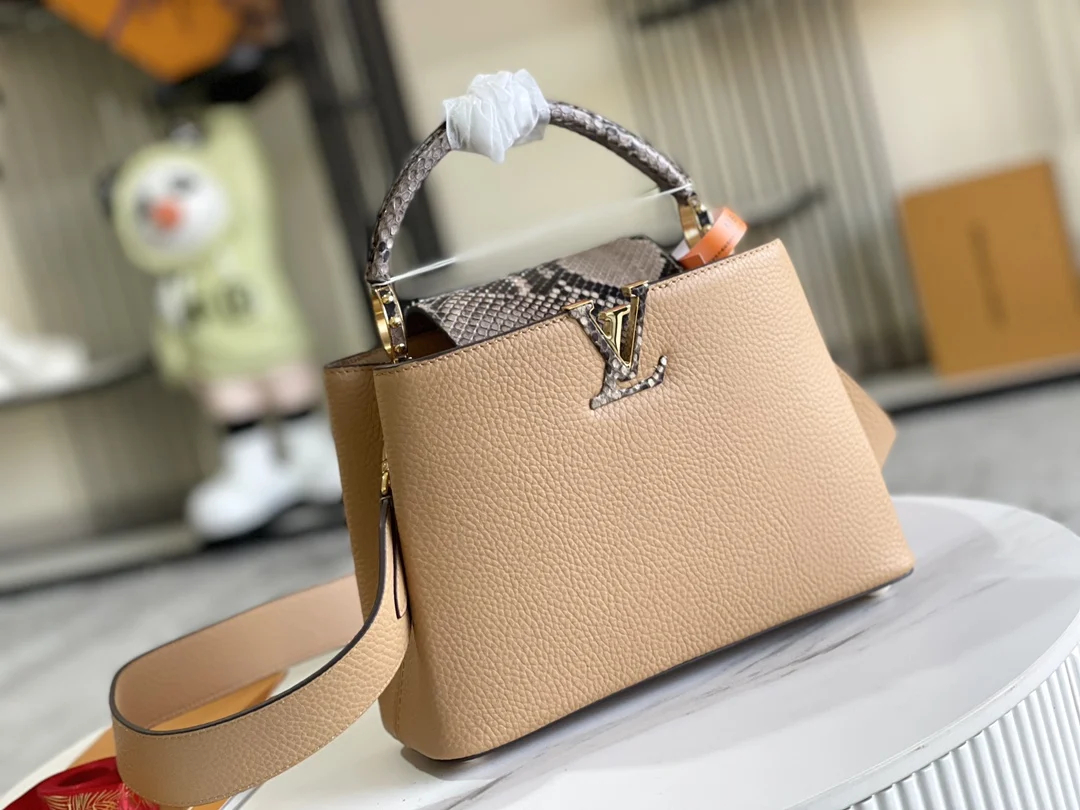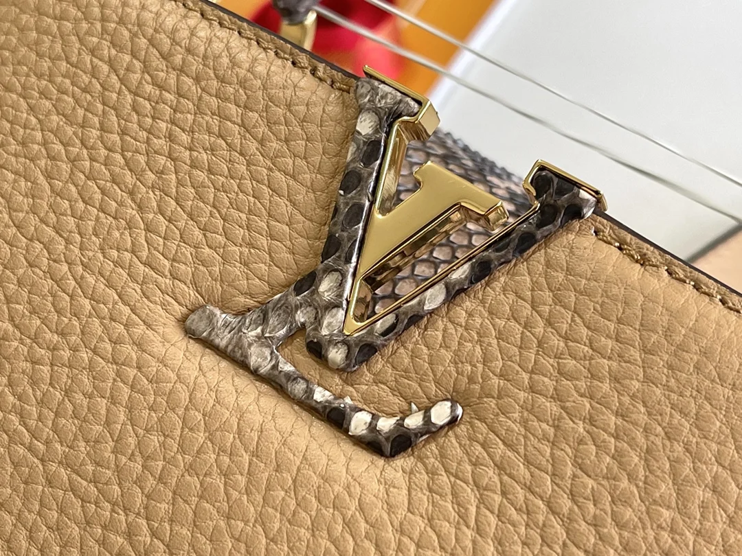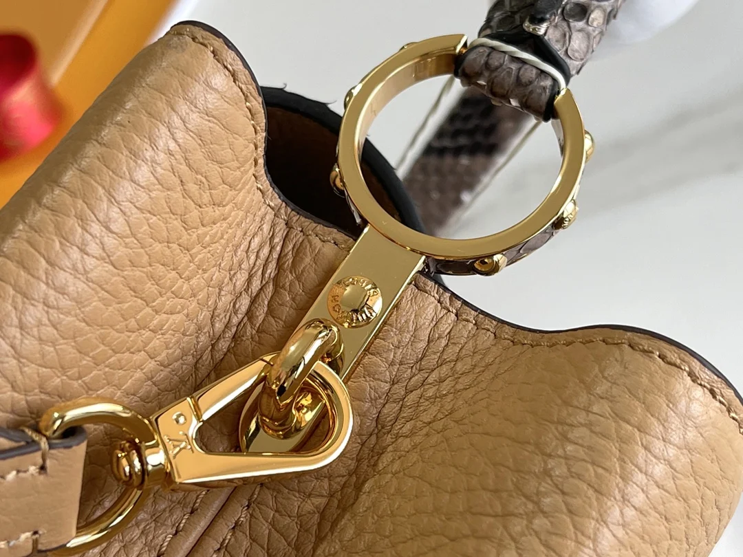 特级配全套包装 特级精品原厂皮M80741M81408姜黄配蟒蛇金扣 Capucines BB手袋 法国进口小牛皮,闪亮的金属饰件,特有的Capucines搭盖既可收入包内展示字母标识,又可外翻 呈现Monogram Flower图案 size:27 x 18 x 9cm