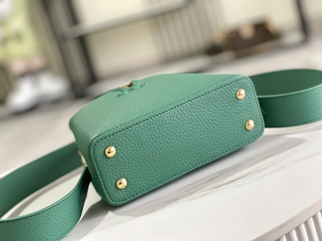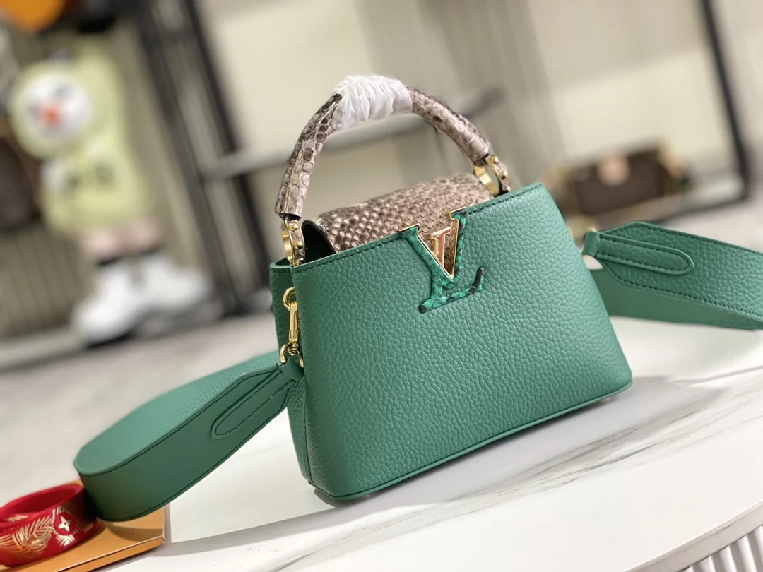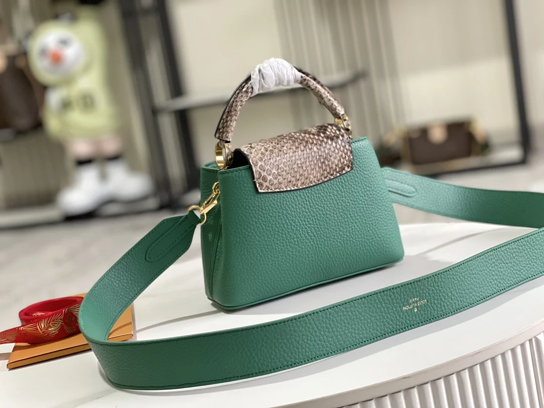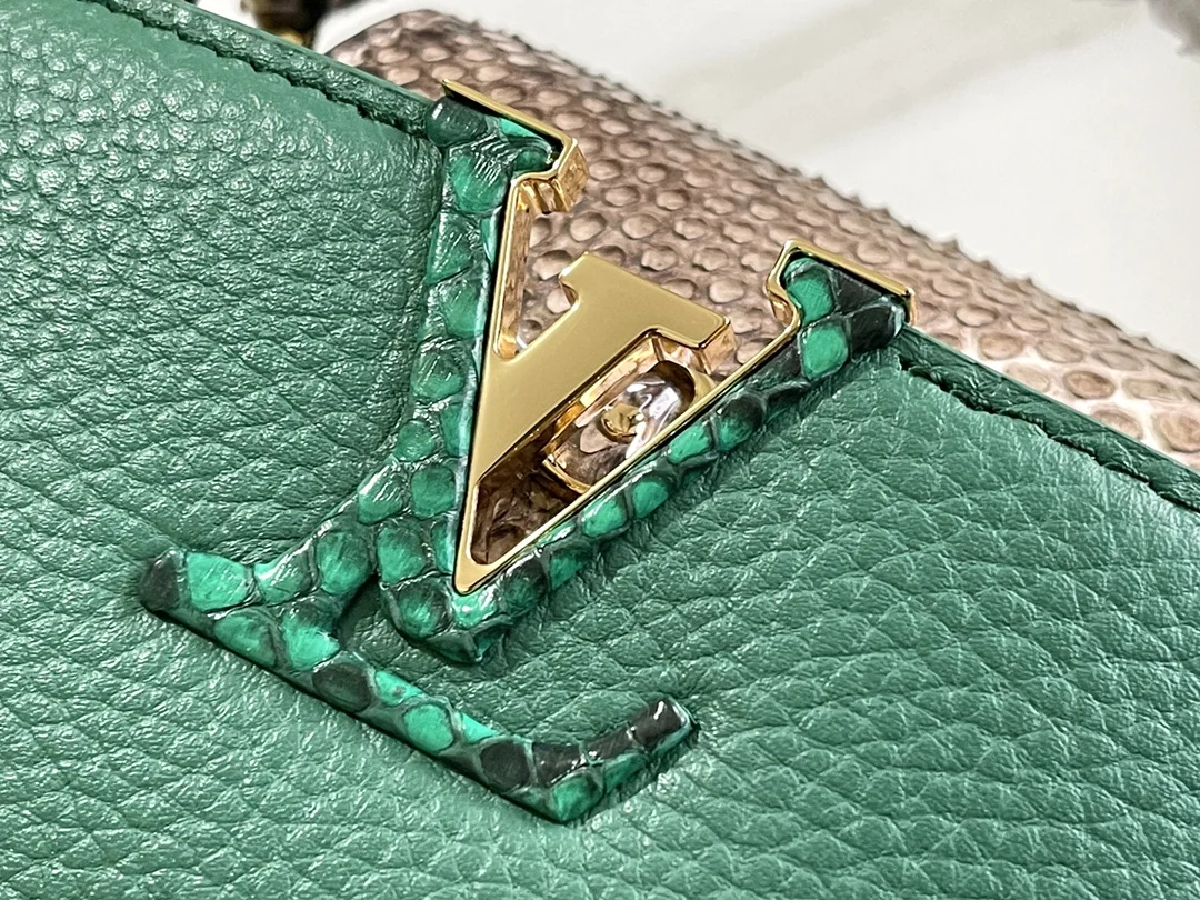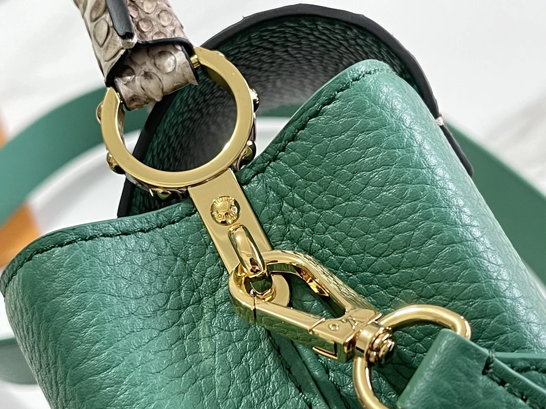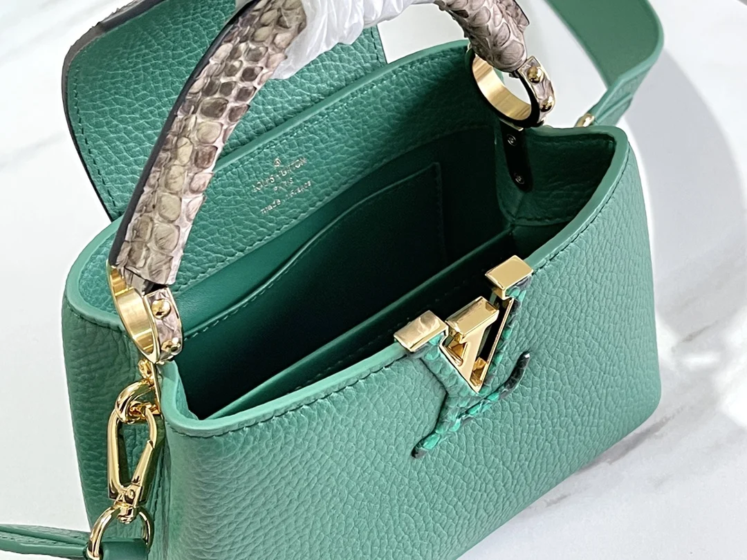 Capucines BB手袋 法国进口小牛皮,闪亮的金属饰件,特有的Capucines搭盖既可收入包内展示字母标识,又可外翻 呈现Monogram Flower图案