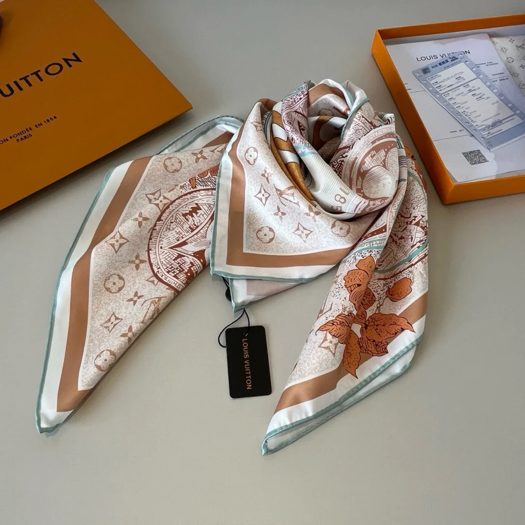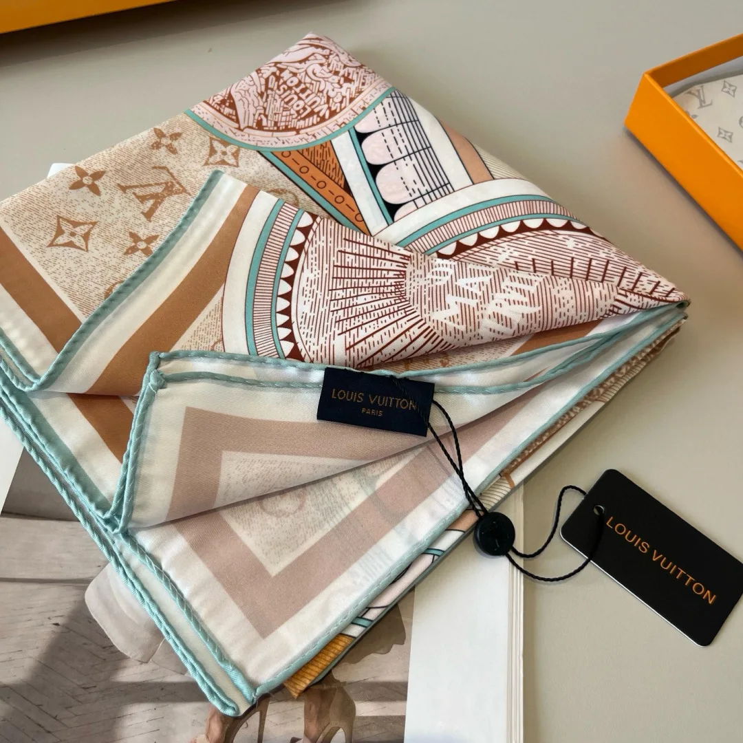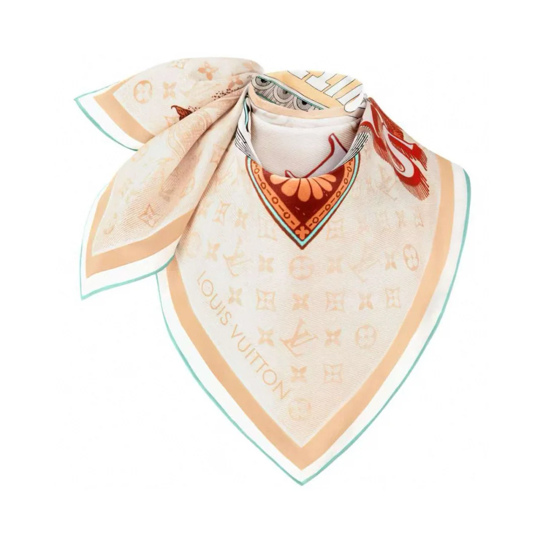 本款 Malles Merveilleuses 桑蚕丝方巾以满溢艺术气息的设计诠释 19 世纪末广告海报的灵感启发 向路易威登悠久历史致敬 各色硬箱与旅行贴纸点缀 Monogram 图案背景 彰显品牌对考究细节的专注 典雅构型释放考究韵致