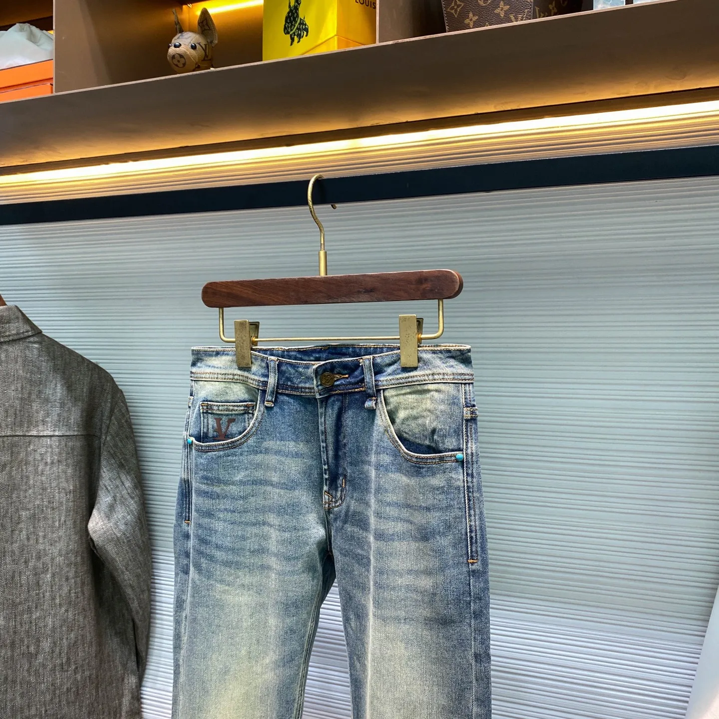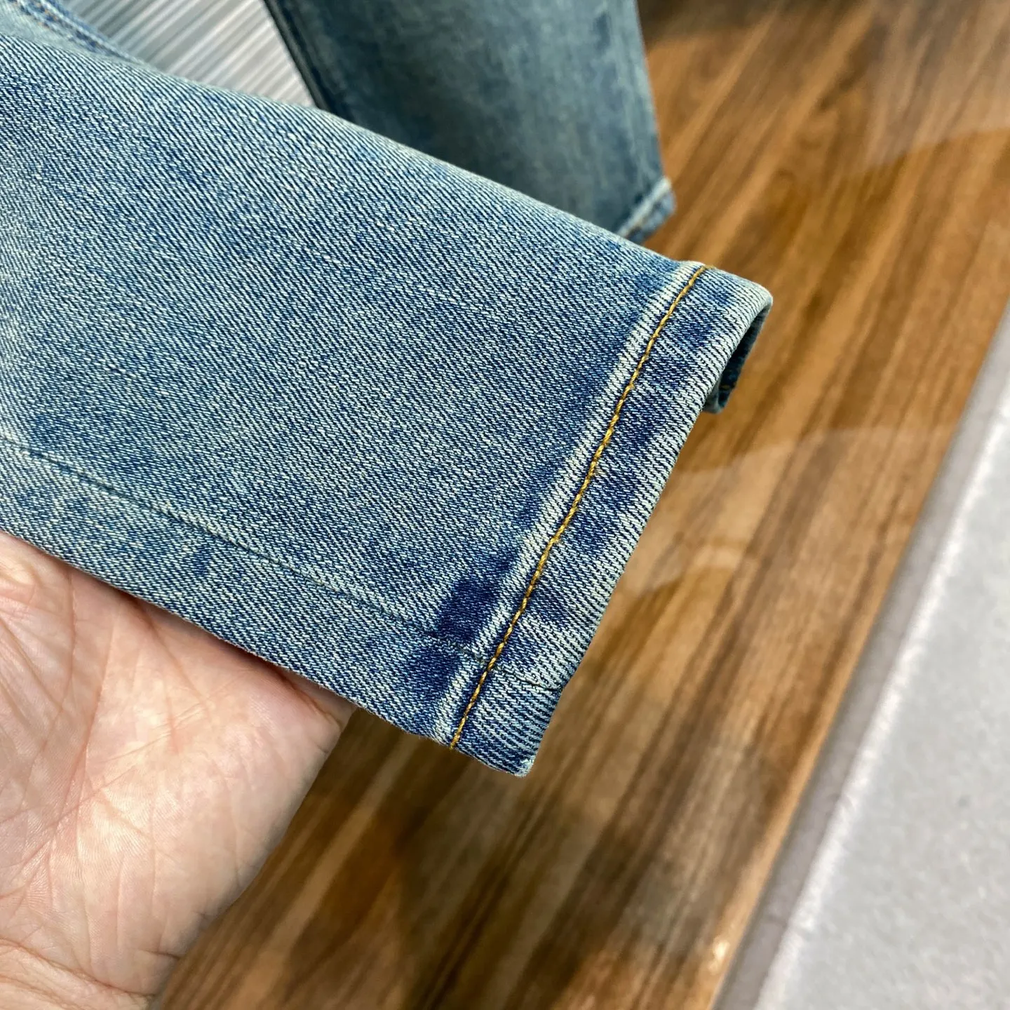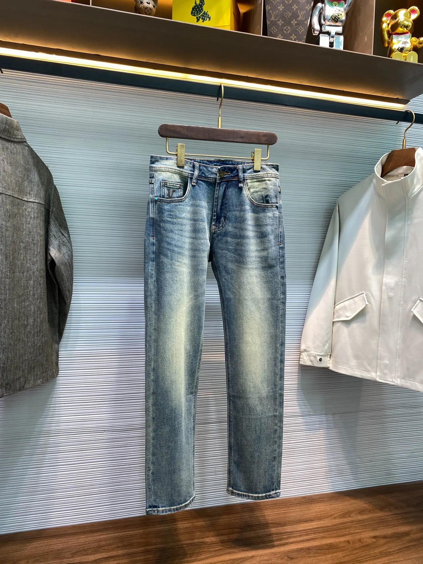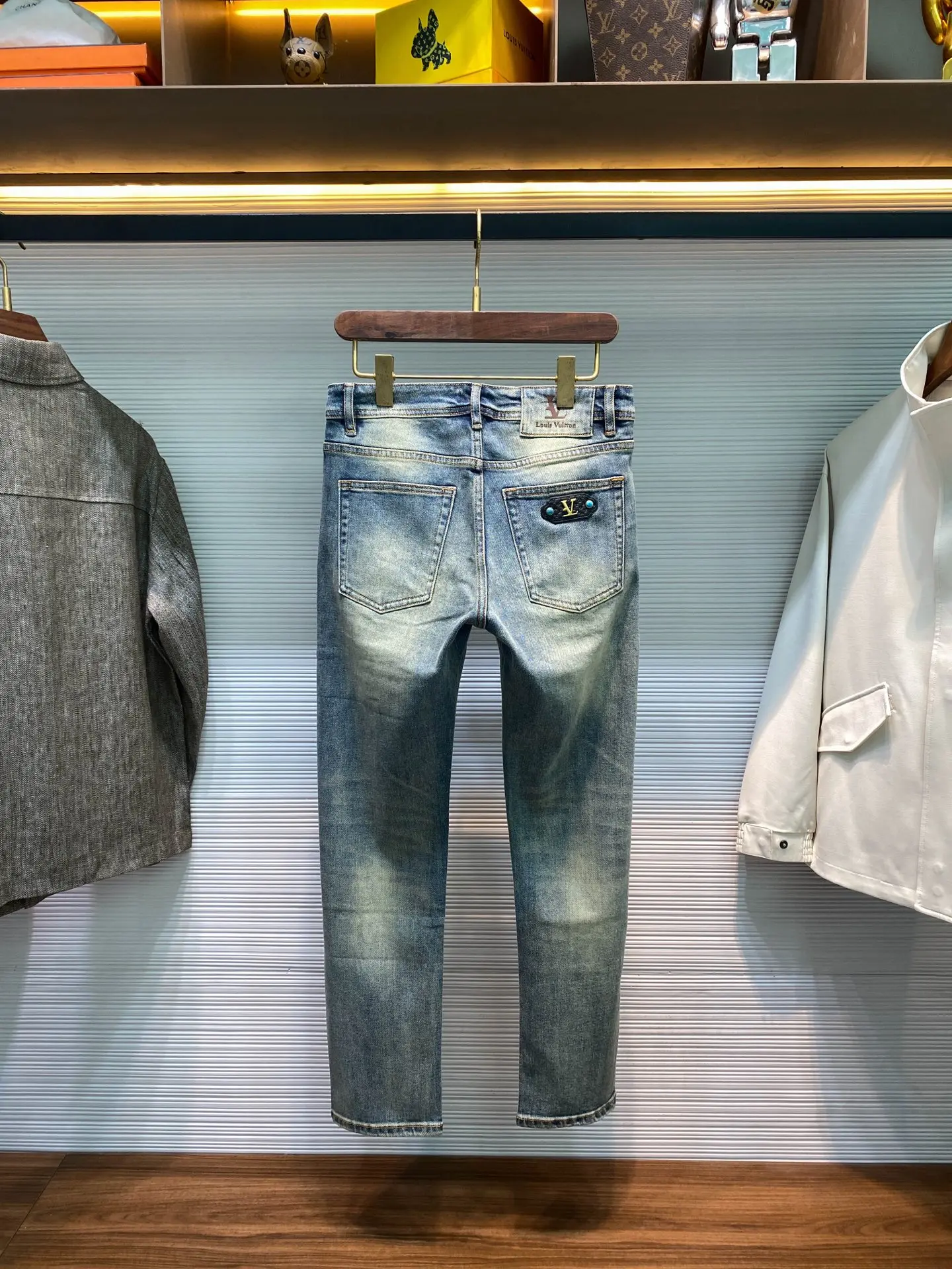 1V 新款蓝色水洗磨白棉质牛仔裤 男士宝石皮标铭牌时尚百搭修身牛仔长裤 男生体重130斤以内选择30码 130-138斤选择31码 138-148斤选择32码 148-158斤选择33码 158-168斤选择34码 168-178斤选择36码 178-188斤选择38码