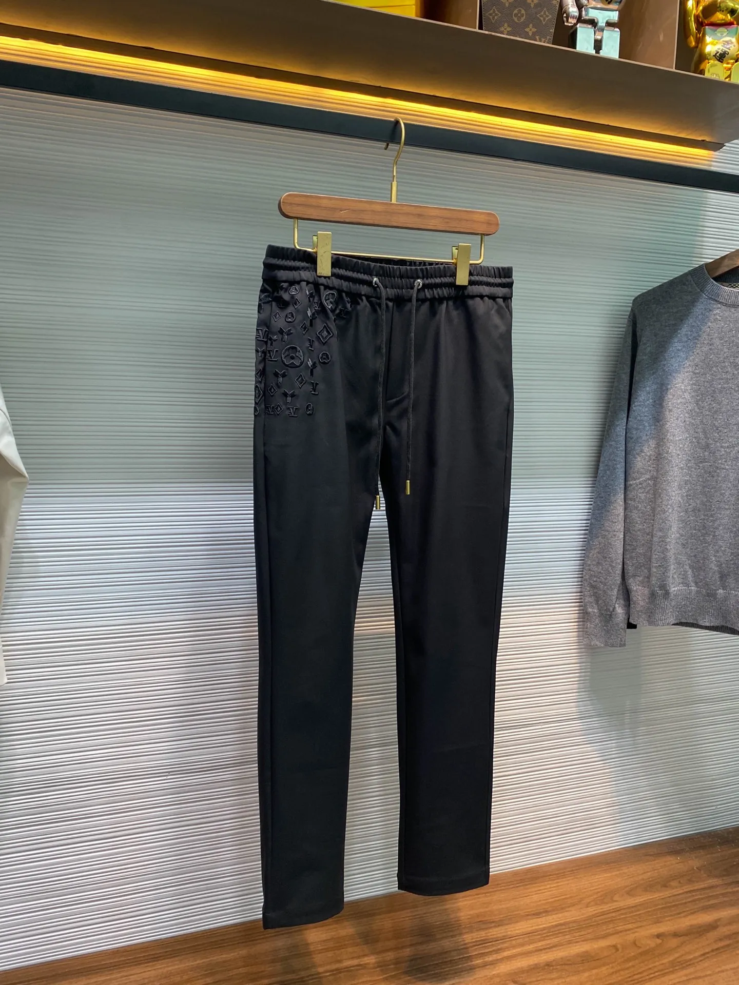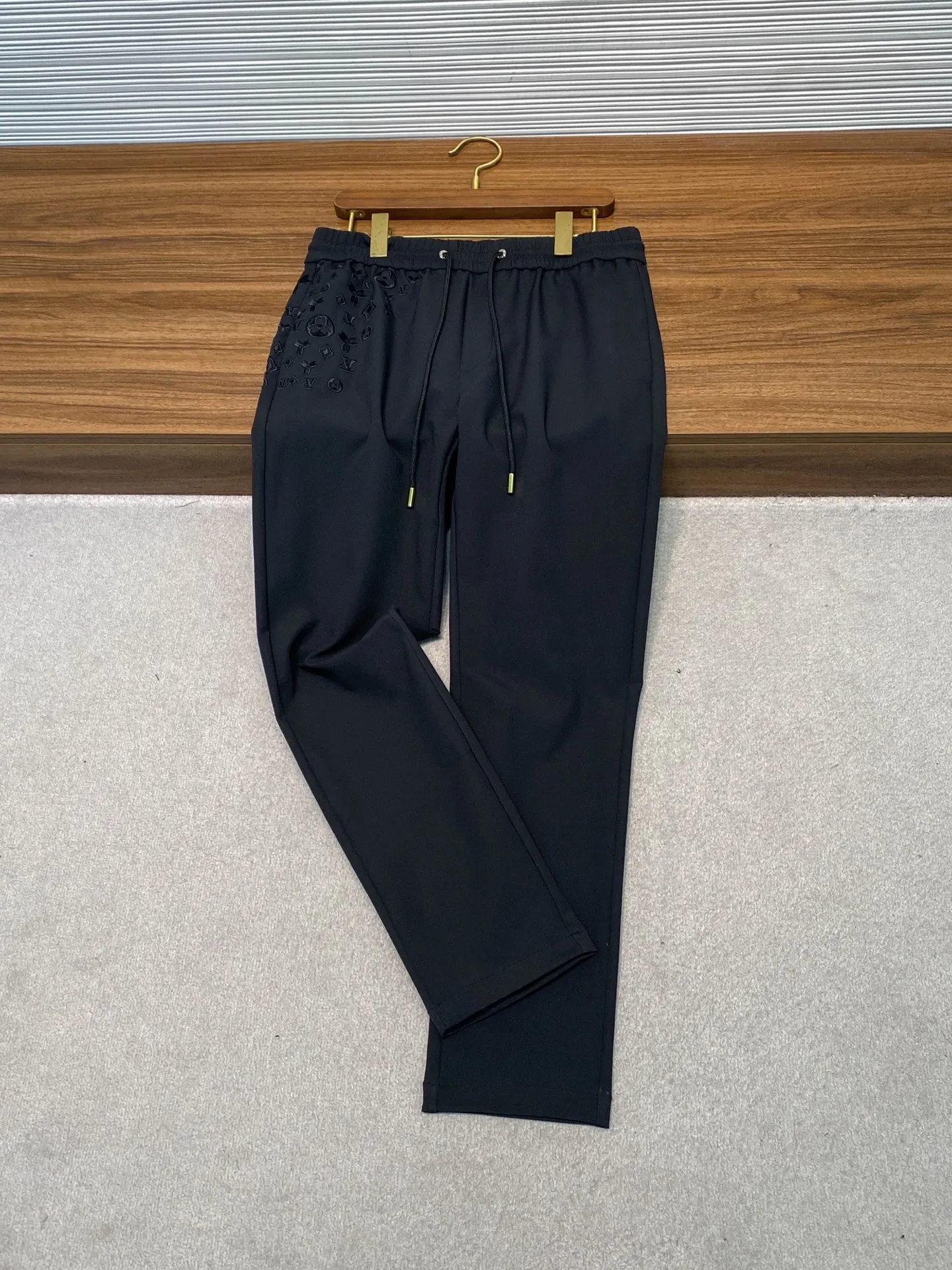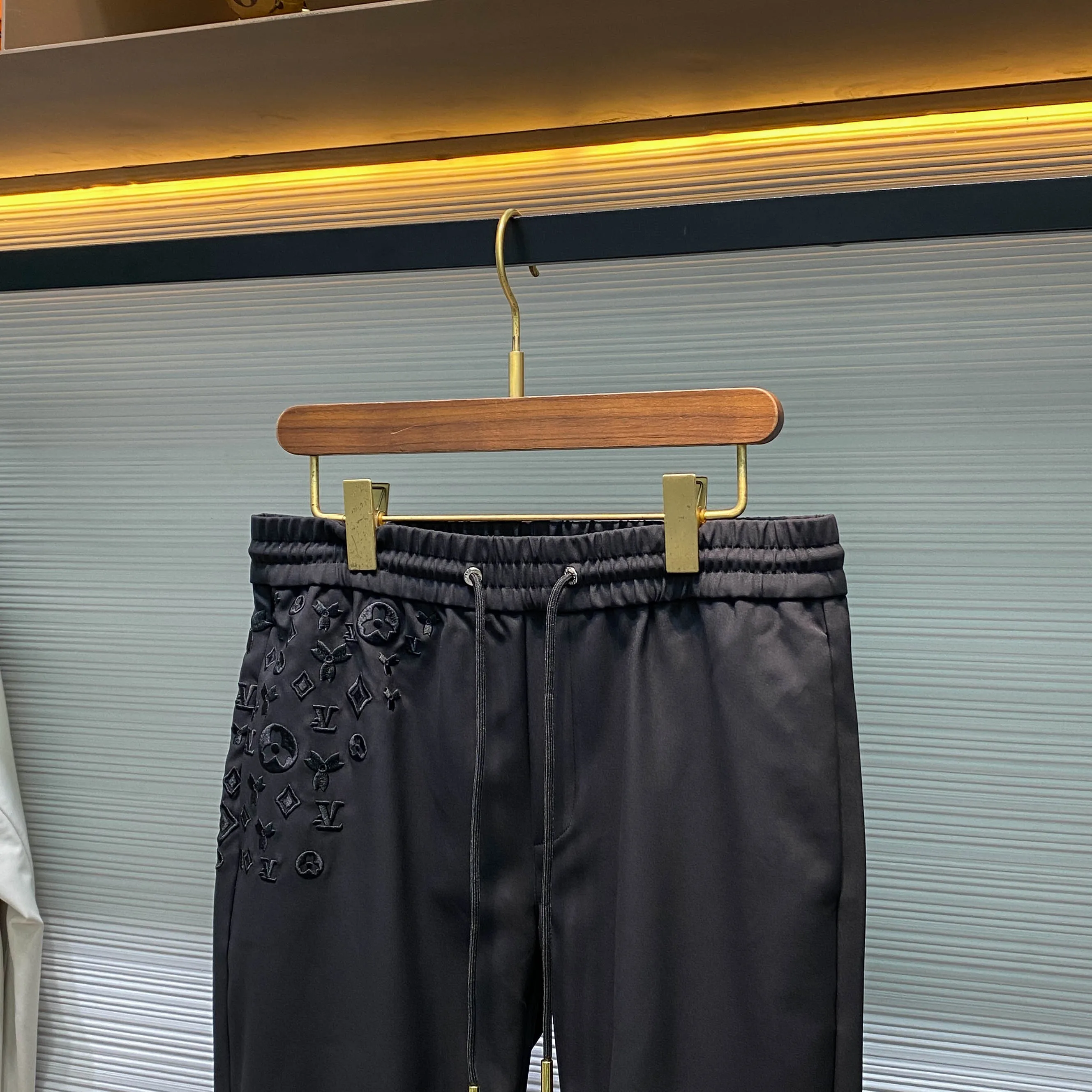 1V 新款黑色科技棉布抽绳休闲裤 男士满天星老花刺绣时尚百搭休闲长裤 男生体重133斤以内选择M码 133-145斤选择L码 145-158斤选择XL码 158-172斤选择XXL码 172-186斤选择3XL码