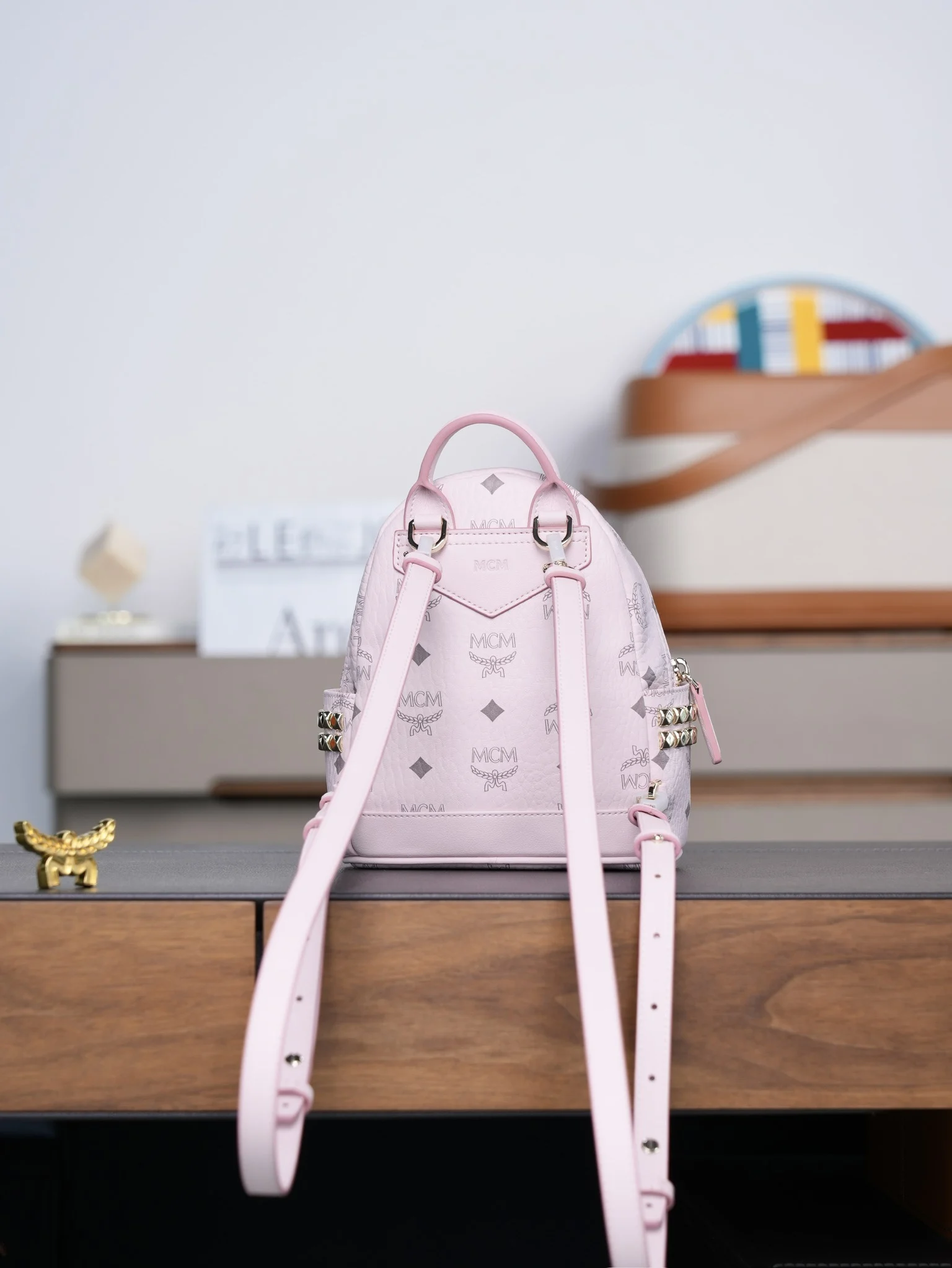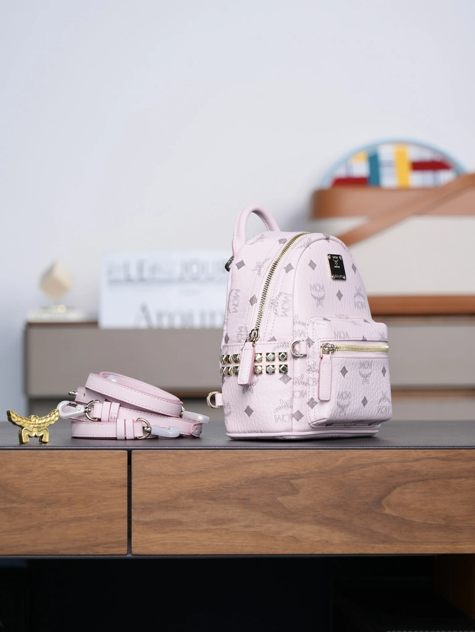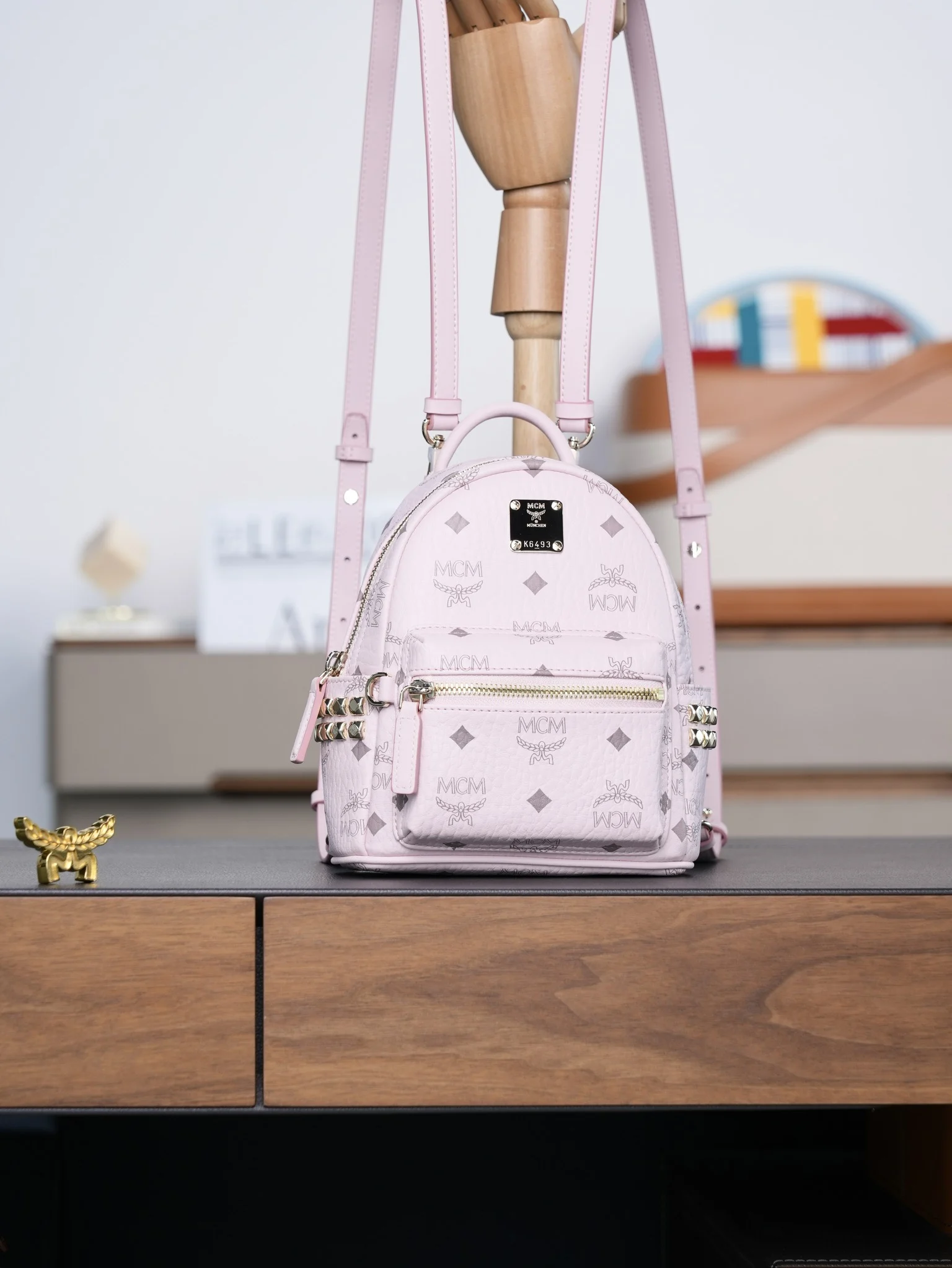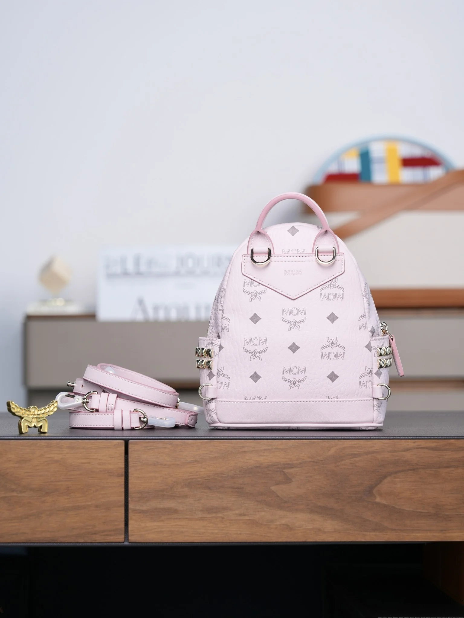 全新升级 官网同步𝙈𝘾𝙈 𝙎𝙩𝙖𝙧𝙠 𝙑𝙞𝙨𝙚𝙩𝙤𝙨轻雾粉超迷你 铆钉双肩包超迷你 CP独家出品 轻雾粉用这款超迷你Stark双肩背包秀出新风格 由经典Visetos制成 饰以豪华的Nappa皮革饰边及前卫感十足的全新铆钉细节 适合各种搭配 创新设计可以利用肩带秒变斜挎包 双肩包 单肩包 腰包和手提包 型号 MMK6SVE92CO001尺寸 21*10*17.5cm肩带 可调节32.5-124cm开合 拉链式颜色 轻雾粉/POWDER PINK