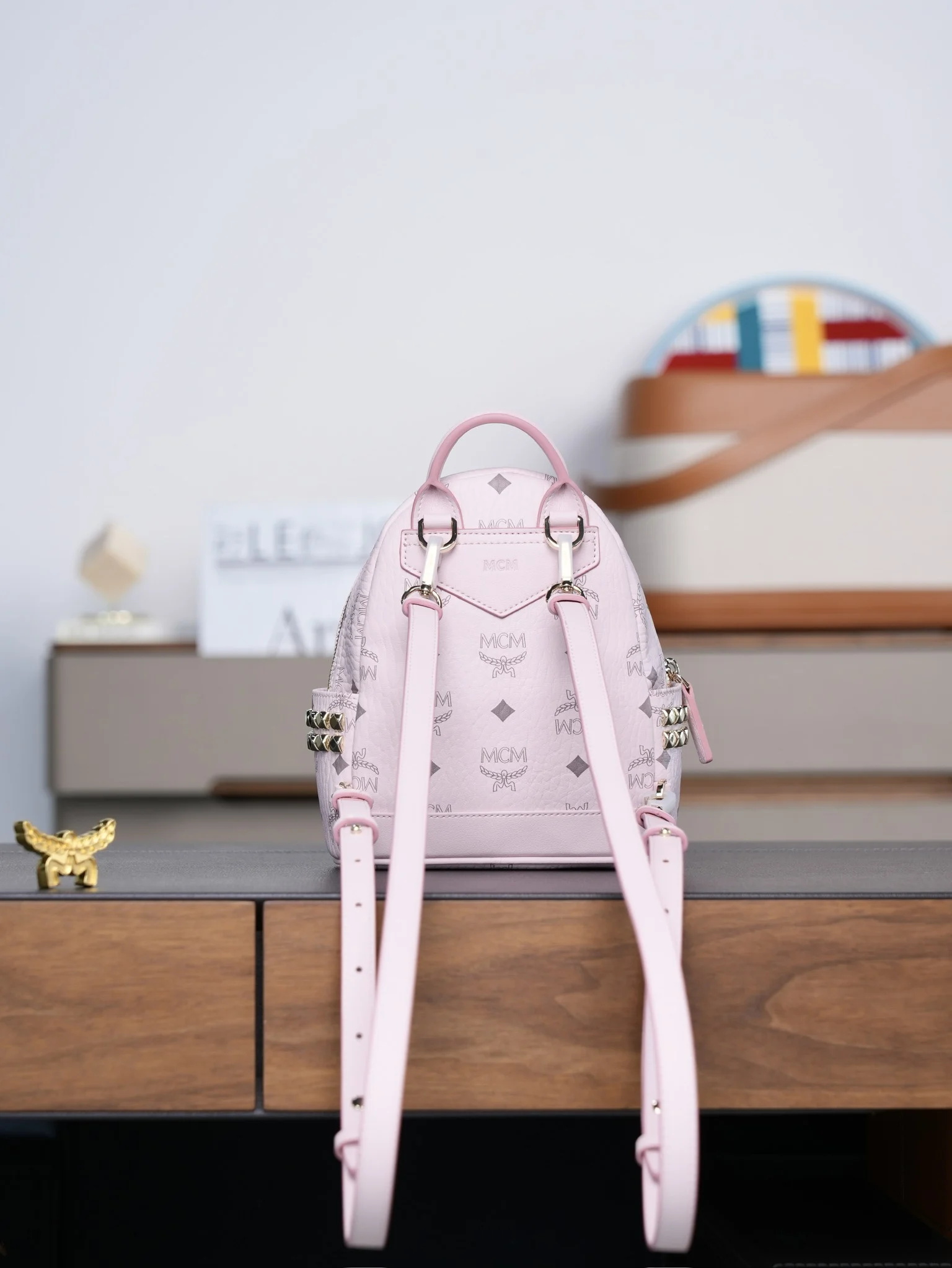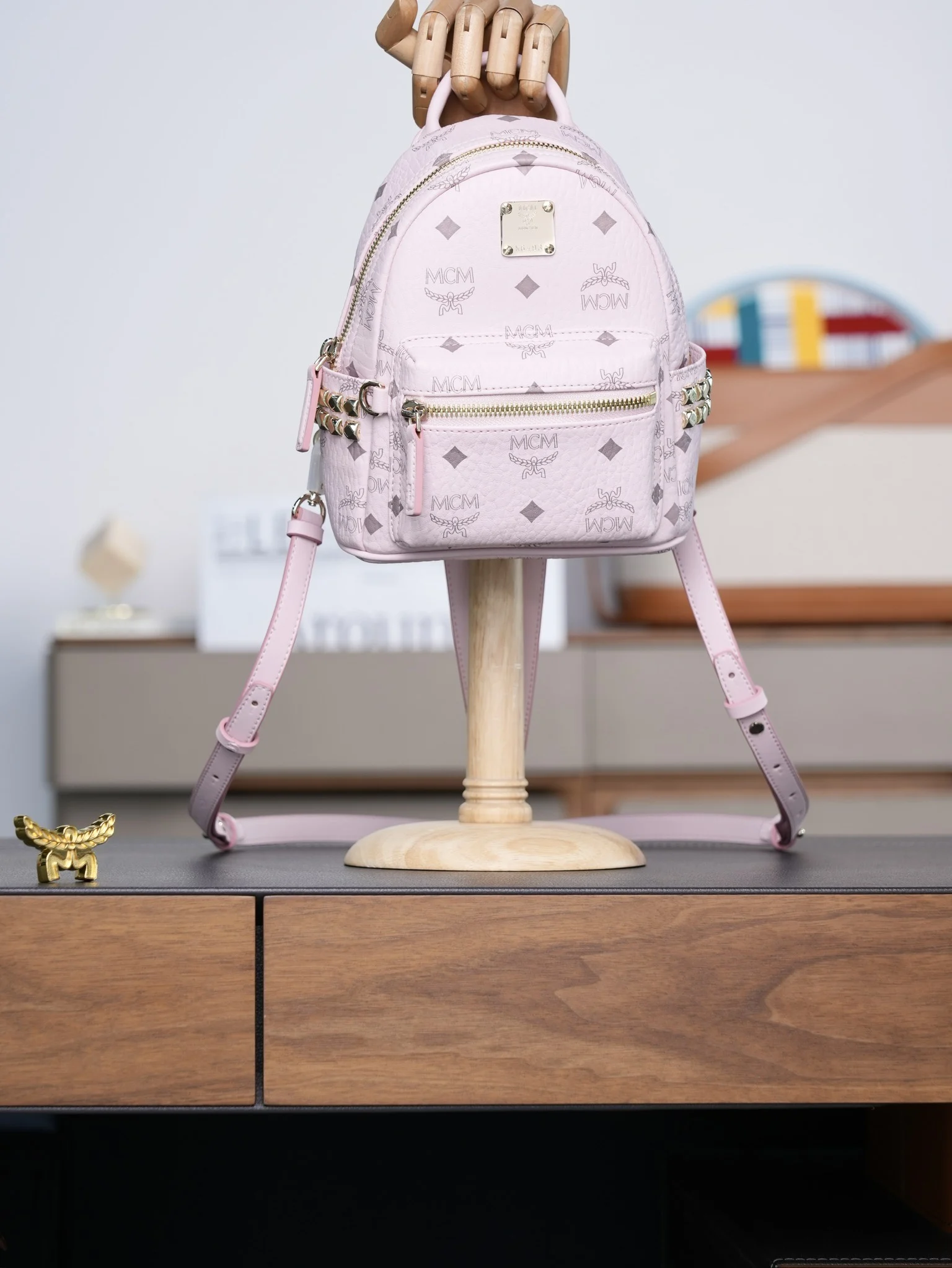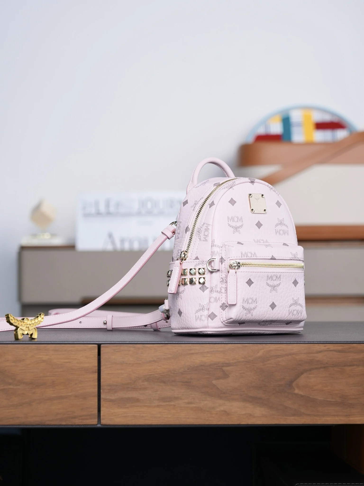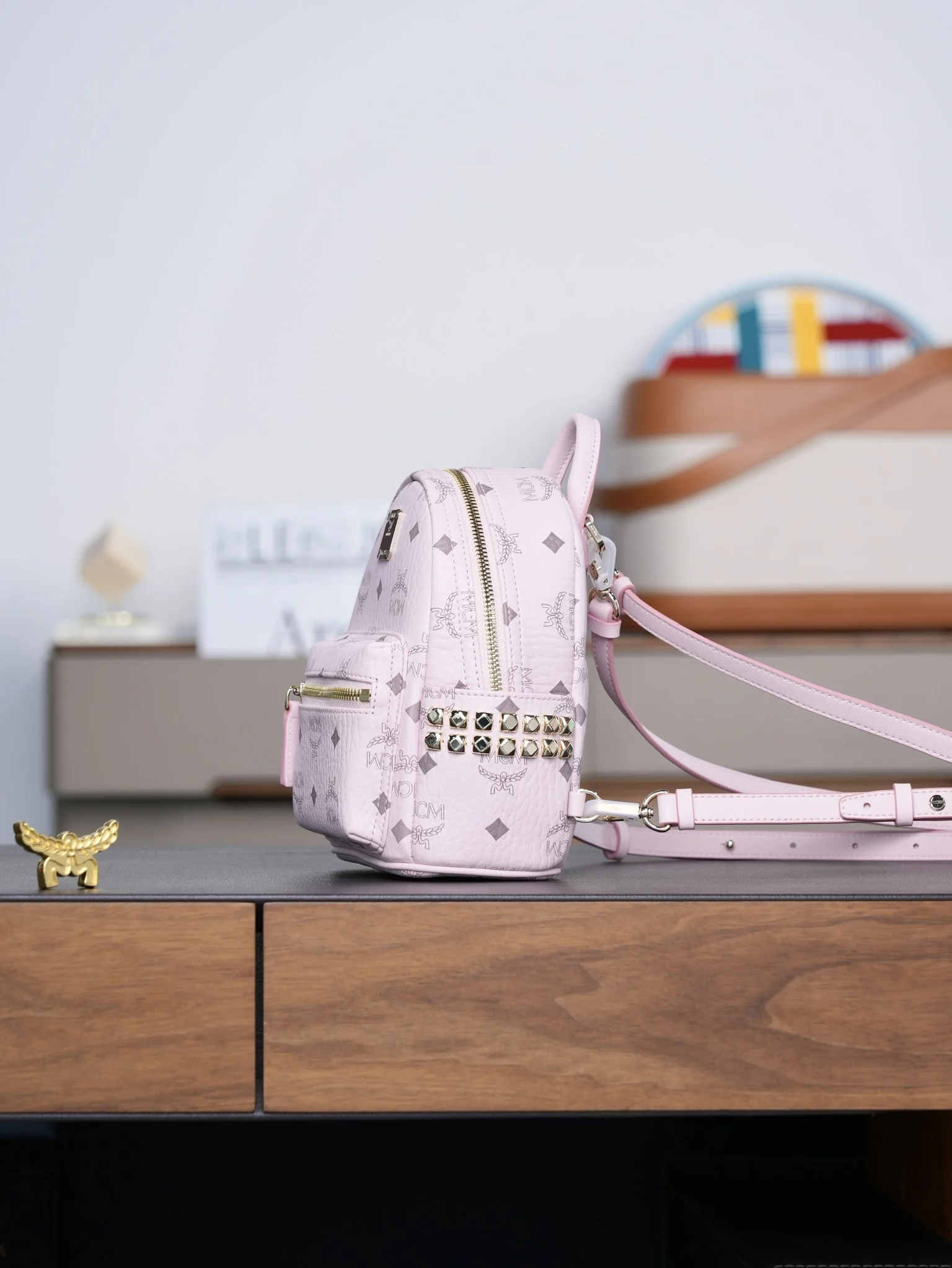 全新升级 官网同步𝙈𝘾𝙈 𝙎𝙩𝙖𝙧𝙠 𝙑𝙞𝙨𝙚𝙩𝙤𝙨轻雾粉超迷你 铆钉双肩包超迷你 CP独家出品 轻雾粉用这款超迷你Stark双肩背包秀出新风格 由经典Visetos制成 饰以豪华的Nappa皮革饰边及前卫感十足的全新铆钉细节 适合各种搭配 创新设计可以利用肩带秒变斜挎包 双肩包 单肩包 腰包和手提包 型号 MMK6SVE92CO001尺寸 21*10*17.5cm肩带 可调节32.5-124cm开合 拉链式颜色 轻雾粉/POWDER PINK