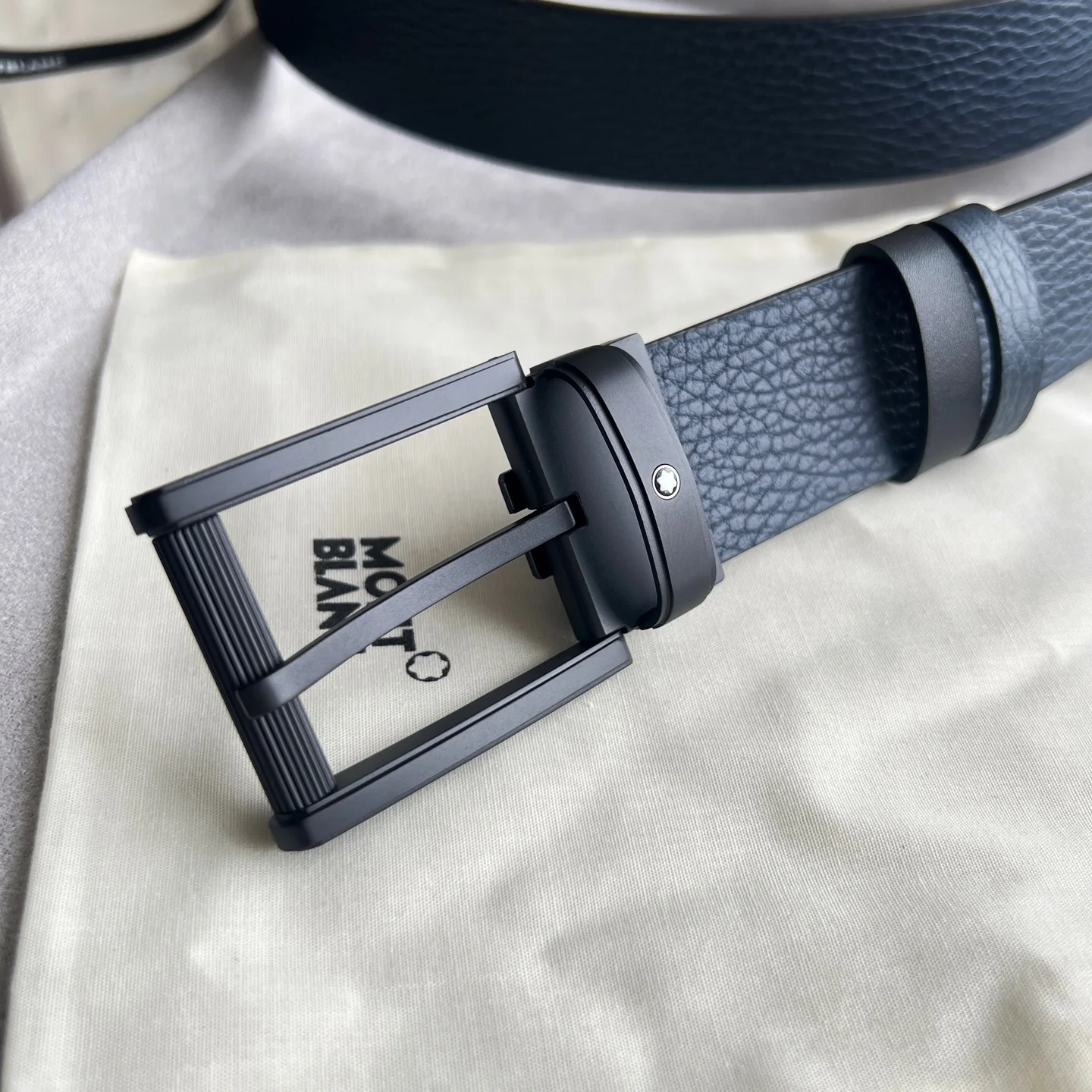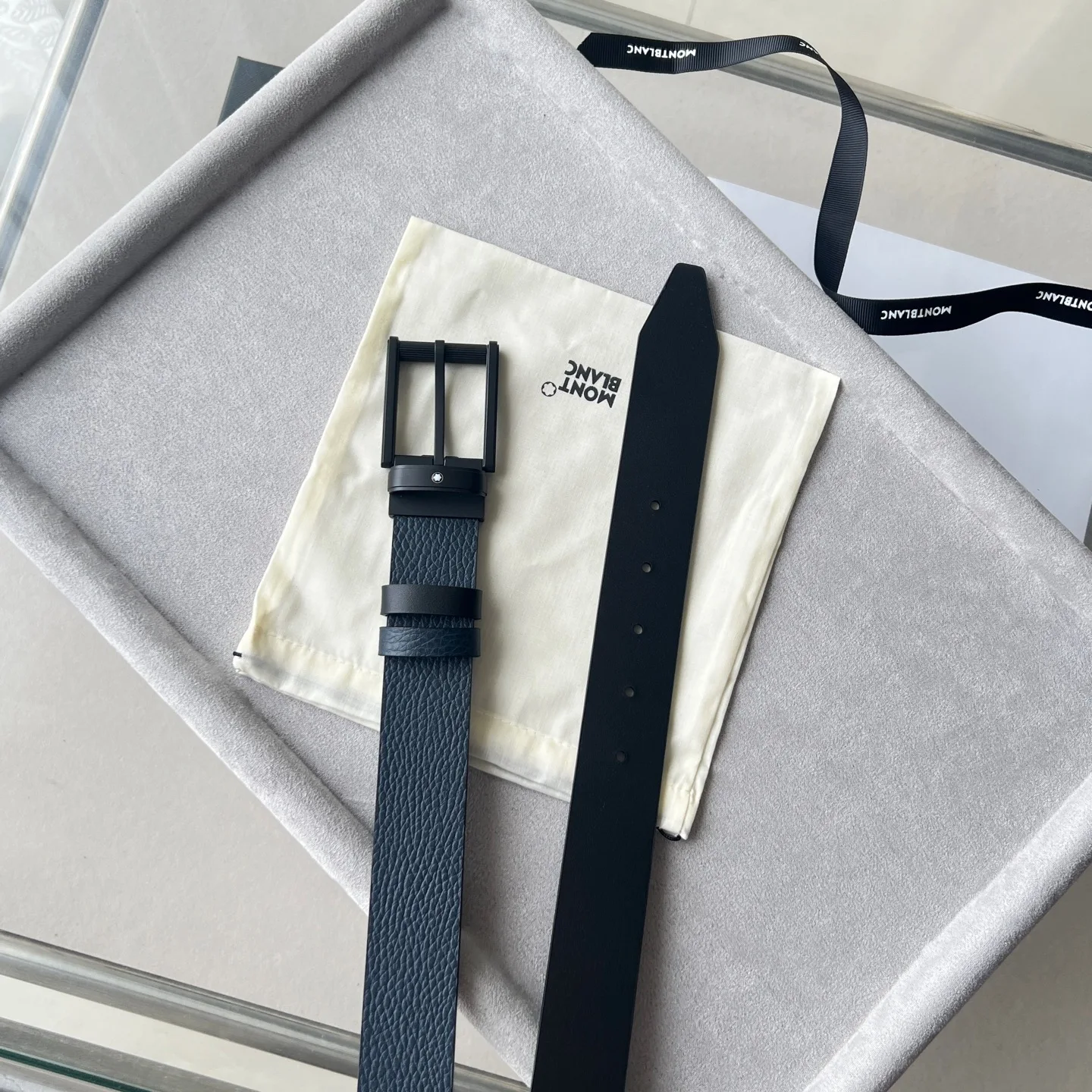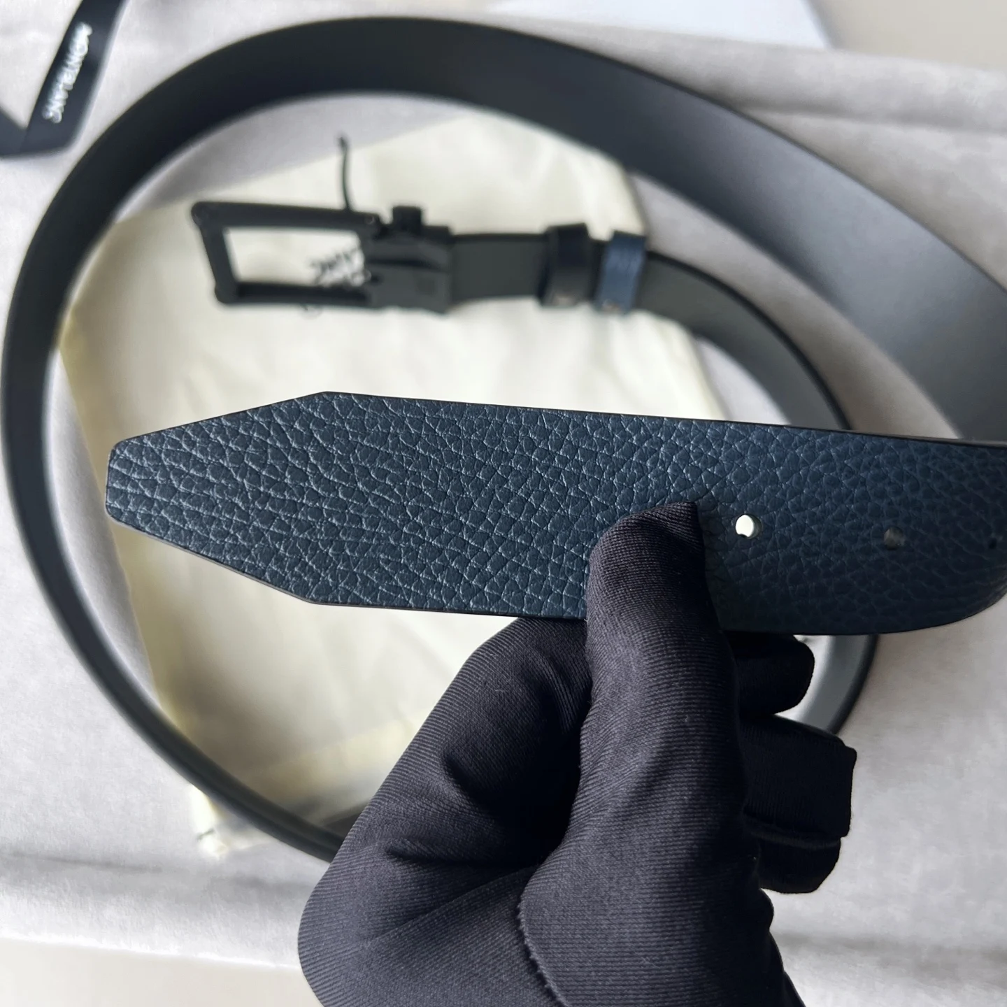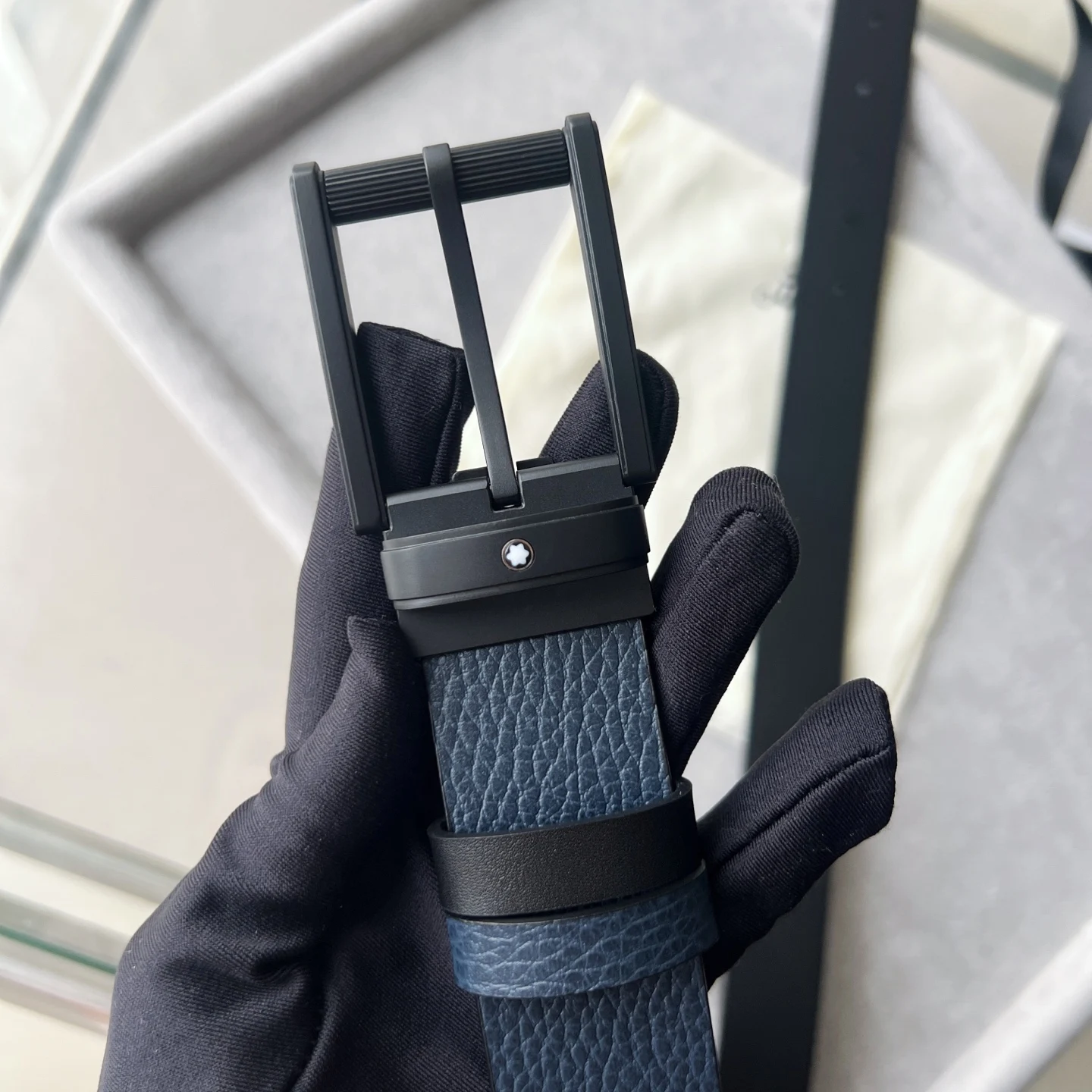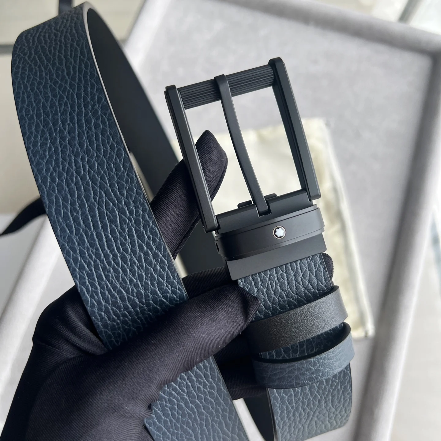 这款双面皮带是多场合伴侣 提供独特的颜色和纹理组合 35毫米皮带的一侧采用蓝色粒面皮革制成 另一侧采用光面黑色皮革制成 并通过饰有万宝龙六角白星品牌标识的针扣系在一起