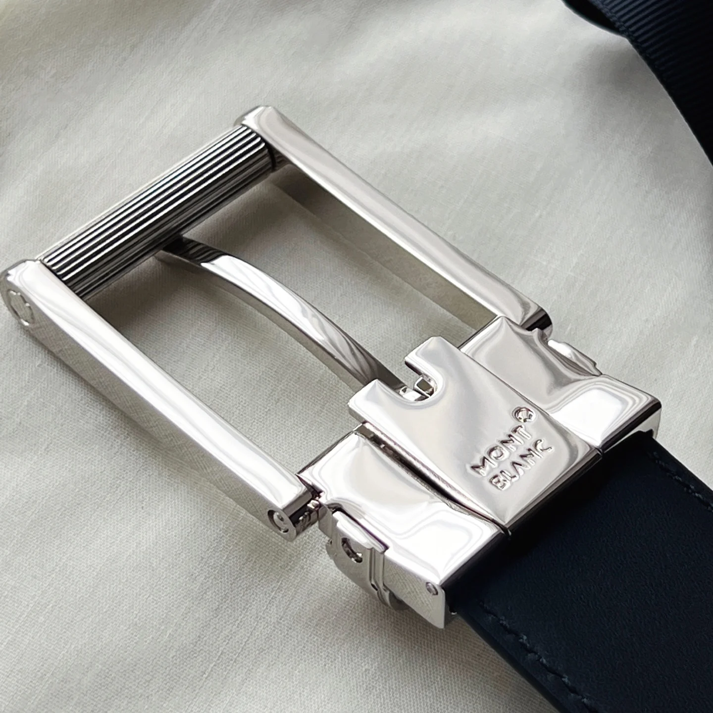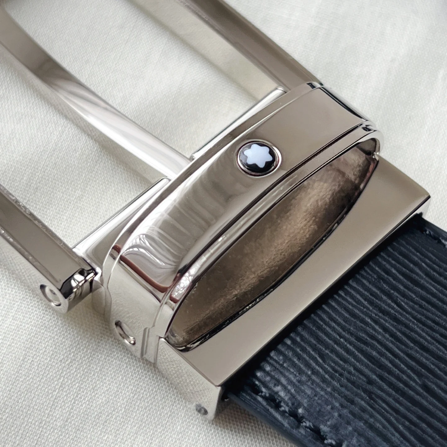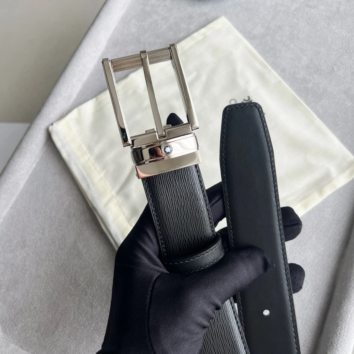 这款双面皮带是多场合伴侣 提供独特的颜色和纹理组合 35毫米皮带的一侧采用灰色粒面皮革制成 另一侧采用光面黑色皮革制成 并通过饰有万宝龙六角白星品牌标识的针扣系在一起