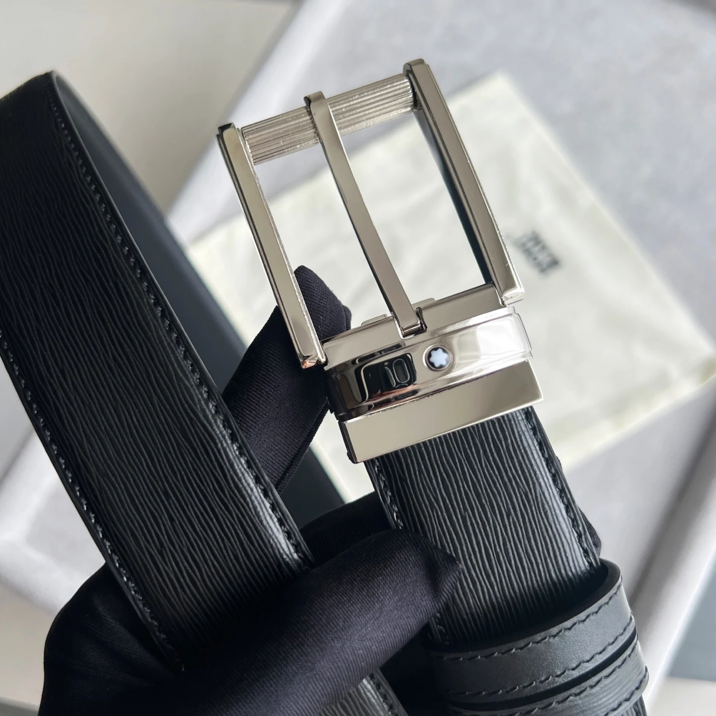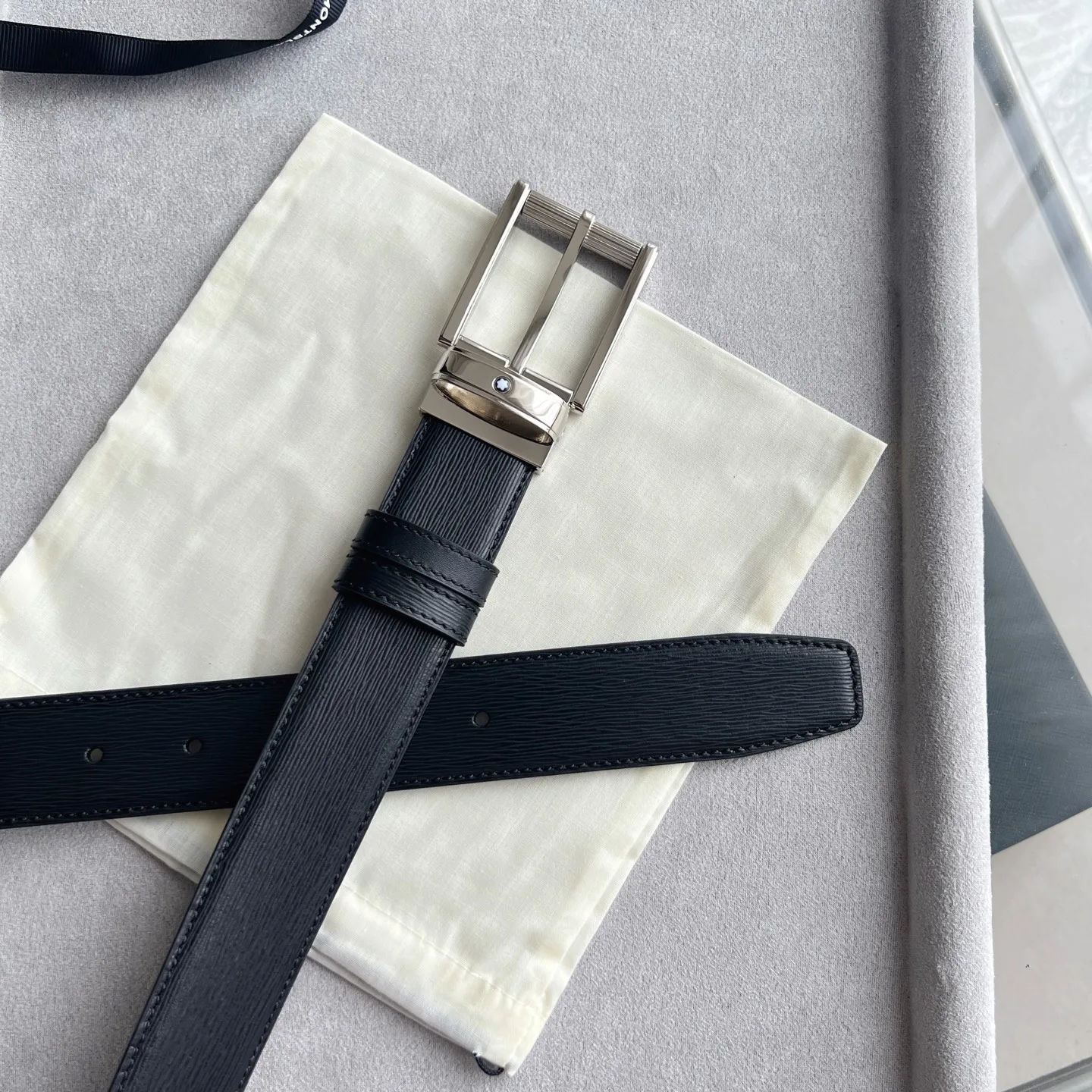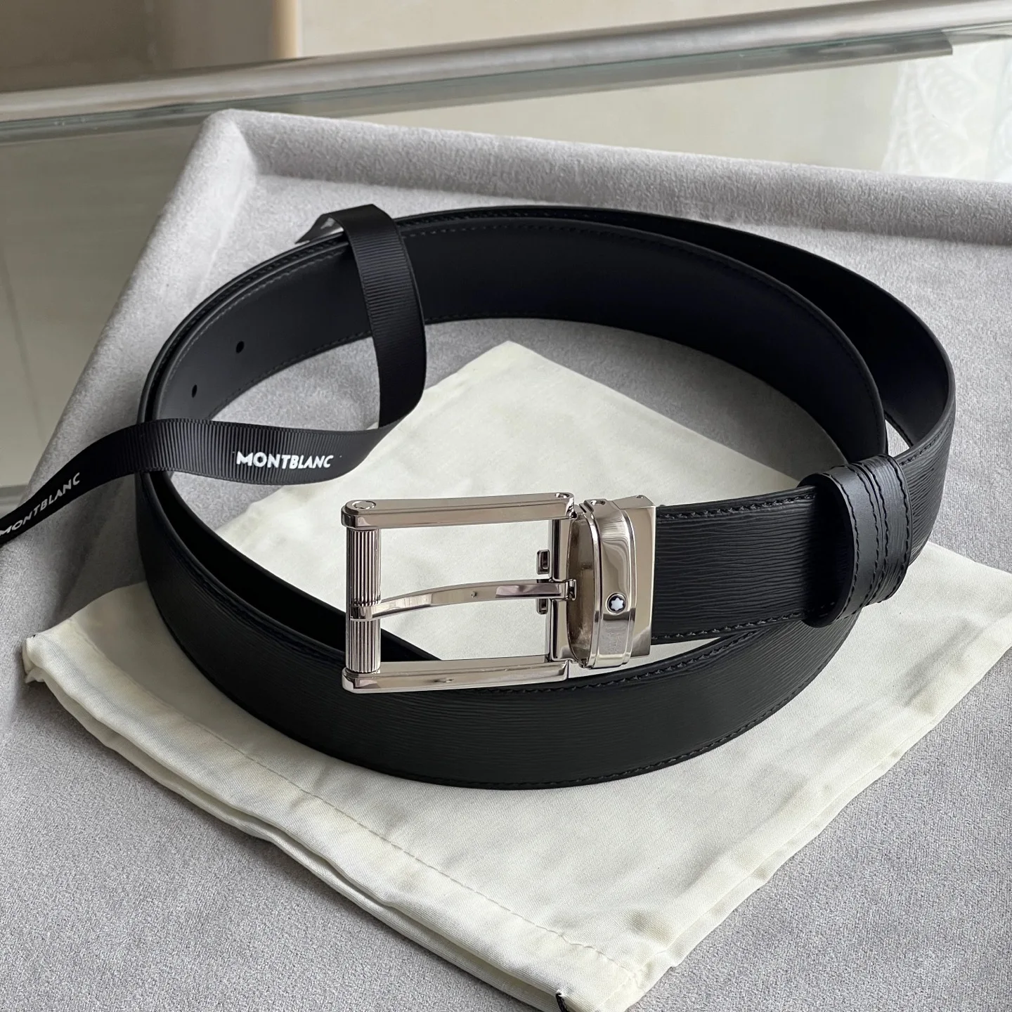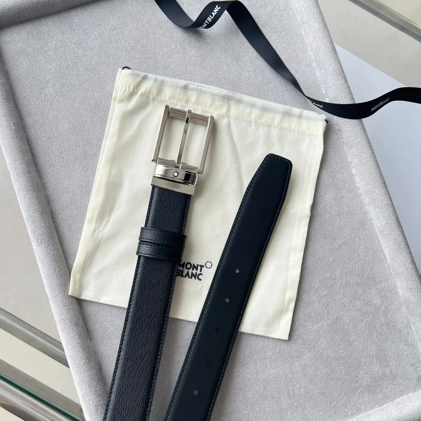 这款双面皮带是多场合伴侣 提供独特的颜色和纹理组合 35毫米皮带的一侧采用灰色粒面皮革制成 另一侧采用光面黑色皮革制成 并通过饰有万宝龙六角白星品牌标识的针扣系在一起