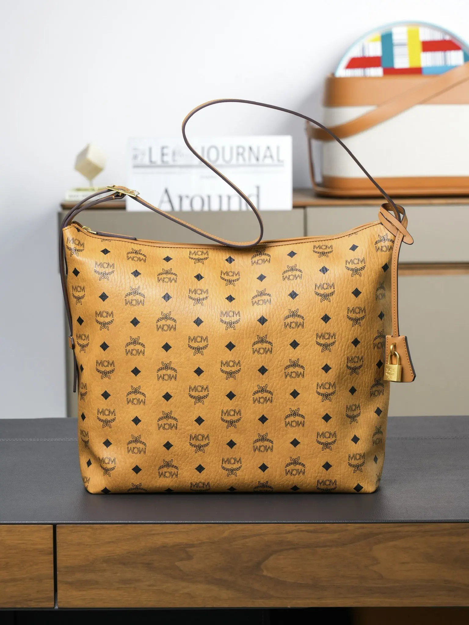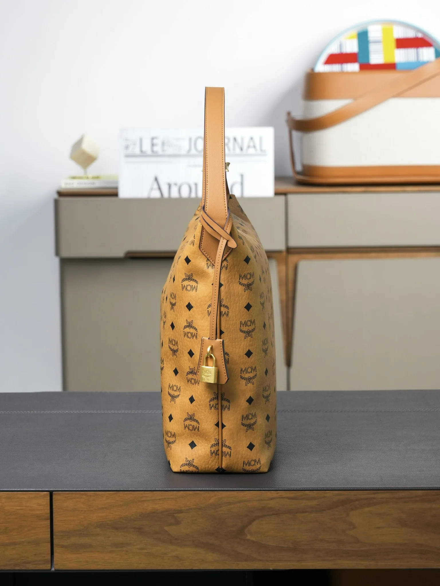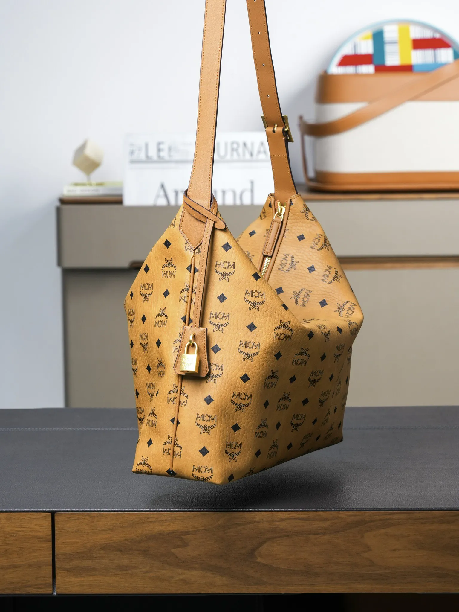 这款单品对经典的休闲款式进行了现代风的全新演绎 在柔软与挺阔之间取得了理想的平衡 这款大号Aren Hobo肩背包采用了传统MCM行李箱的设计元素 包括一个可拆卸皮革吊牌及雕花Logo挂锁 达到锦上添花的效果