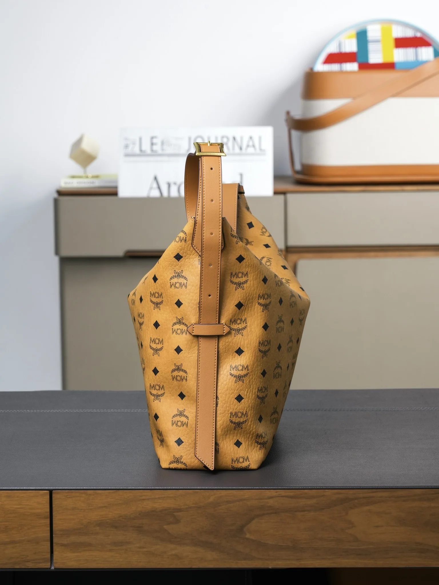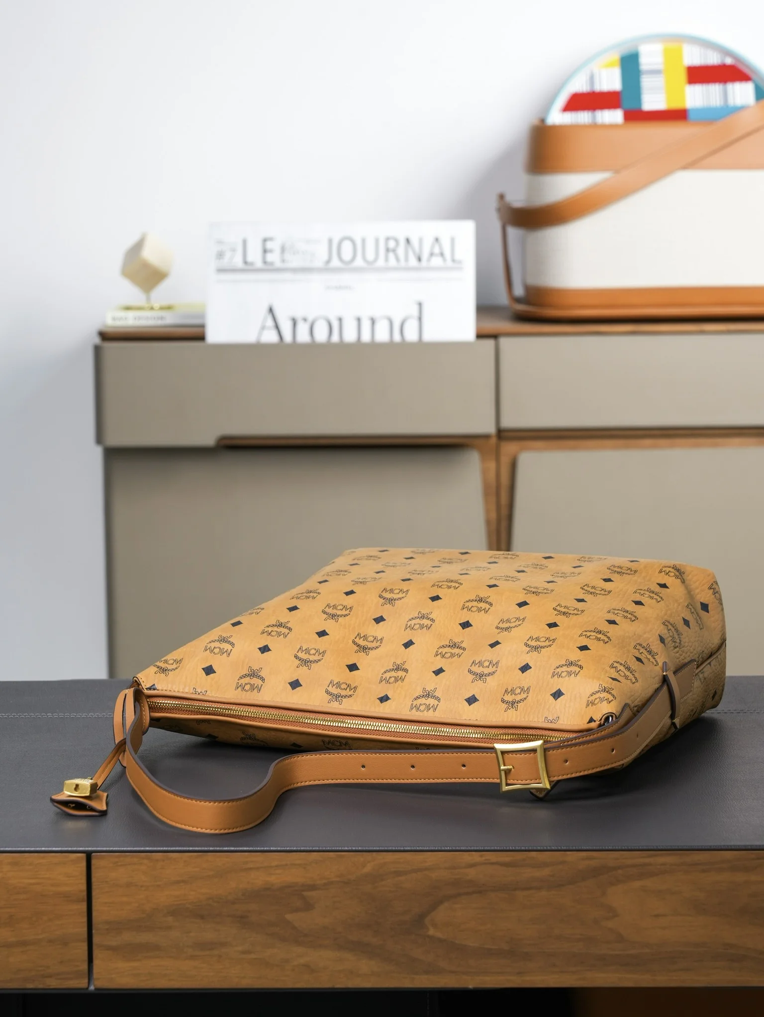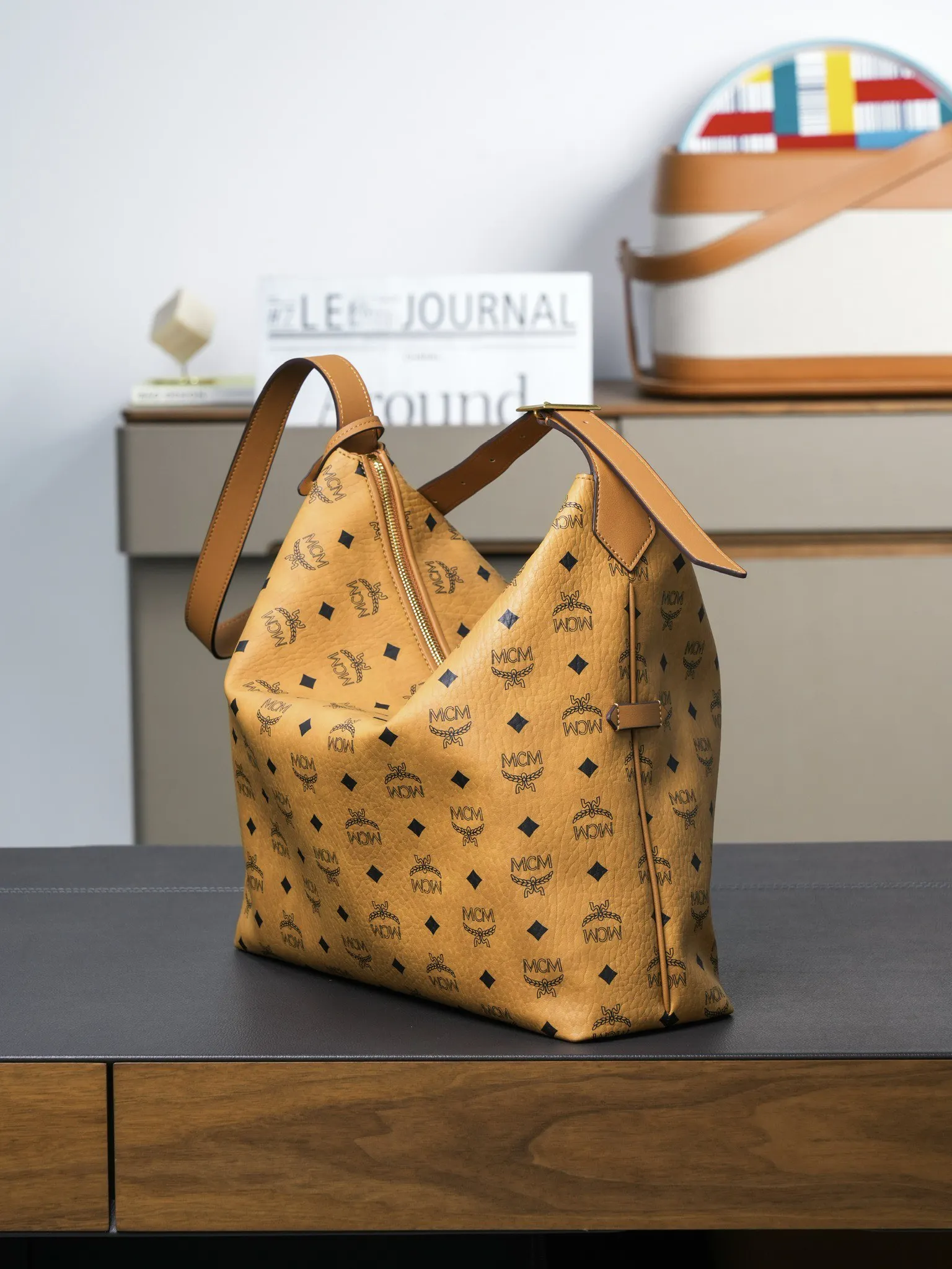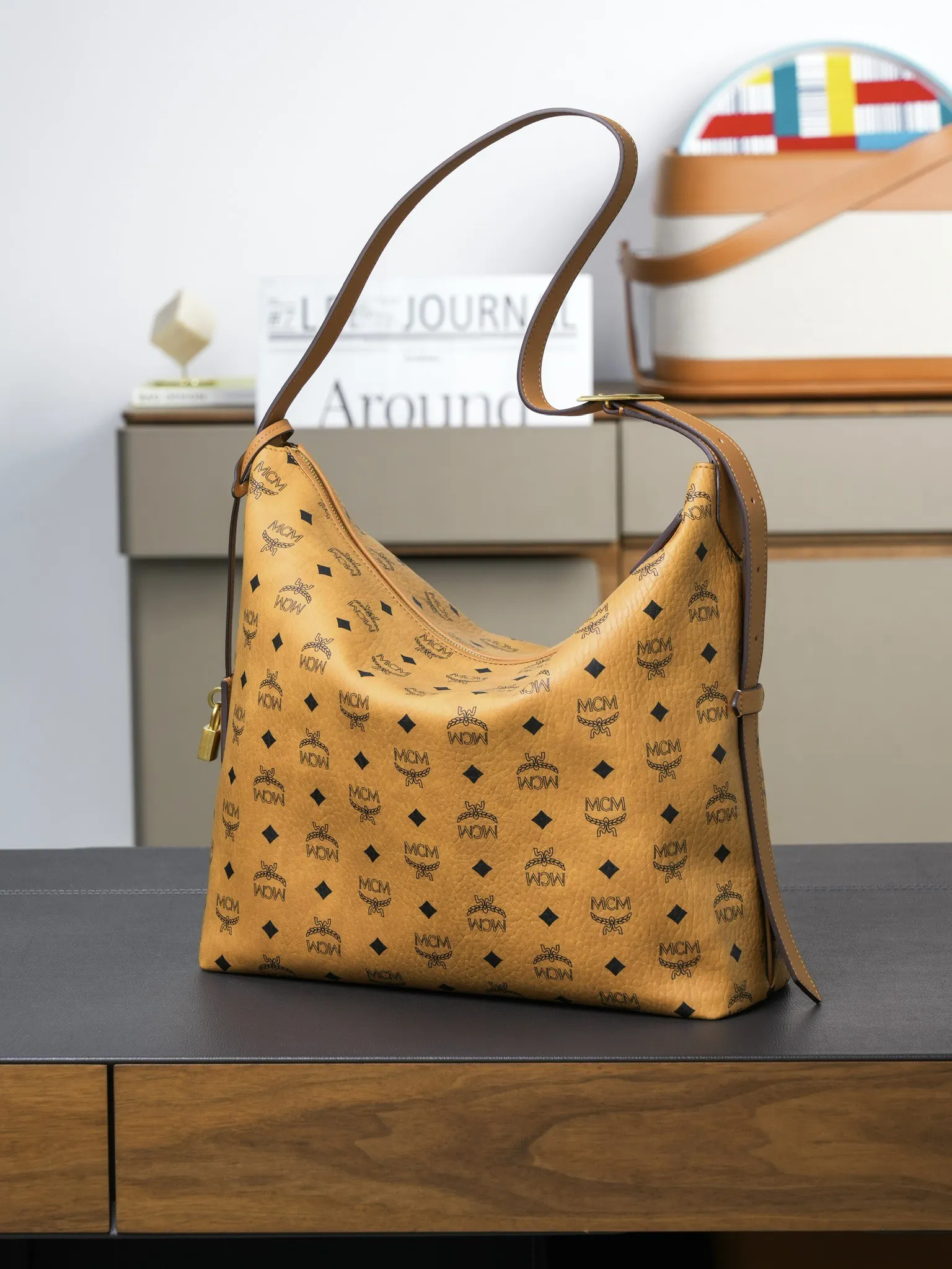 这款单品对经典的休闲款式进行了现代风的全新演绎 在柔软与挺阔之间取得了理想的平衡 这款大号Aren Hobo肩背包采用了传统MCM行李箱的设计元素 包括一个可拆卸皮革吊牌及雕花Logo挂锁 达到锦上添花的效果
