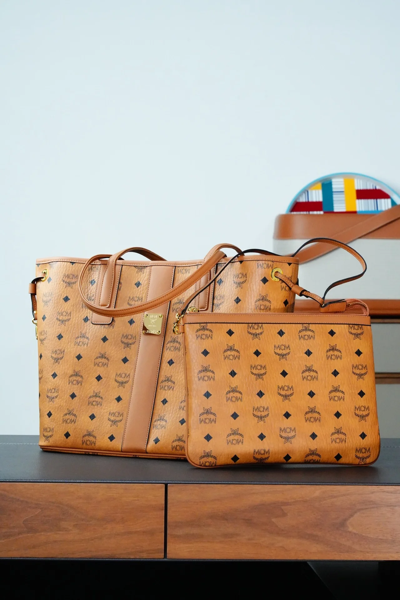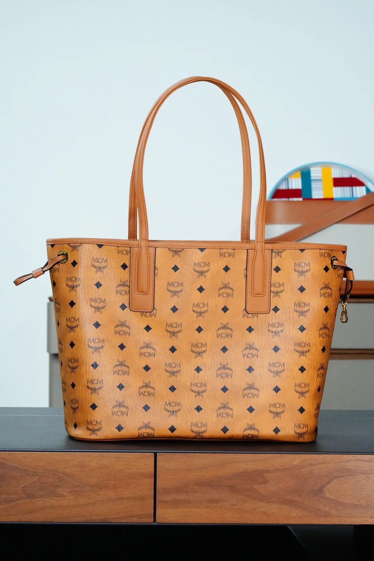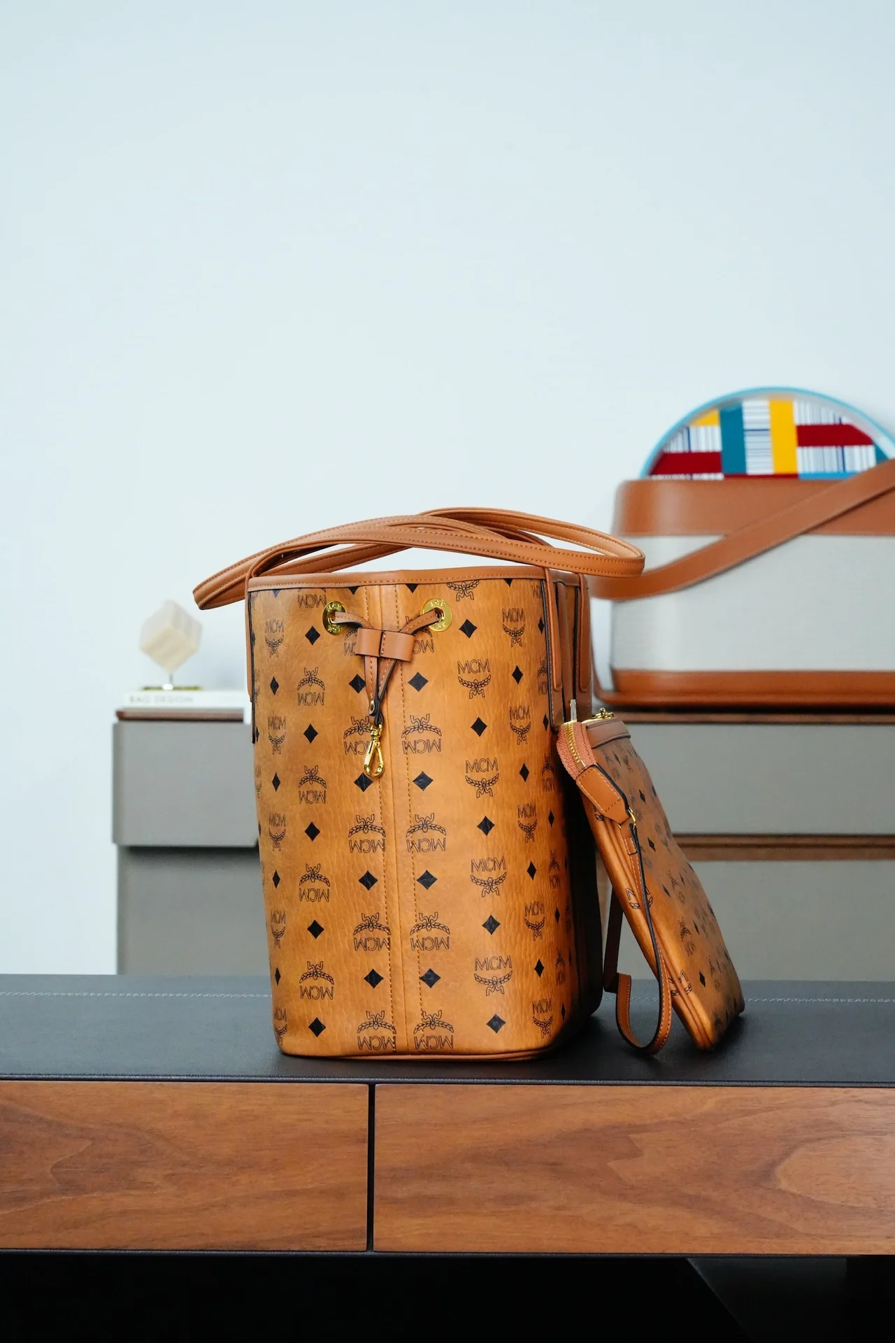 全新升级 官网同步𝙈𝘾𝙈 𝙇𝙞𝙯 𝙑𝙞𝙨𝙚𝙩𝙤𝙨干邑色中号 双面购物袋子母包 CP独家出品 干邑色两种经典外观被融合在一款日常单品中 这款中号Liz购物袋由Visetos及Nappa皮革制成 可双面使用 翻转出的内里展现Cubic 经典花纹图样 此外 轻巧的外型可通过皮革抽绳进行扩展收缩 随附的可拆卸拉链手拿包丰富了这款购物袋的功能性 也可取下在短途旅行时单独作为钱包使用 型号 MWPCSVI01CO001尺寸 36*17*28cm提手 垂长24cm特点 双面可用/大小双包颜色 干邑色/棕色