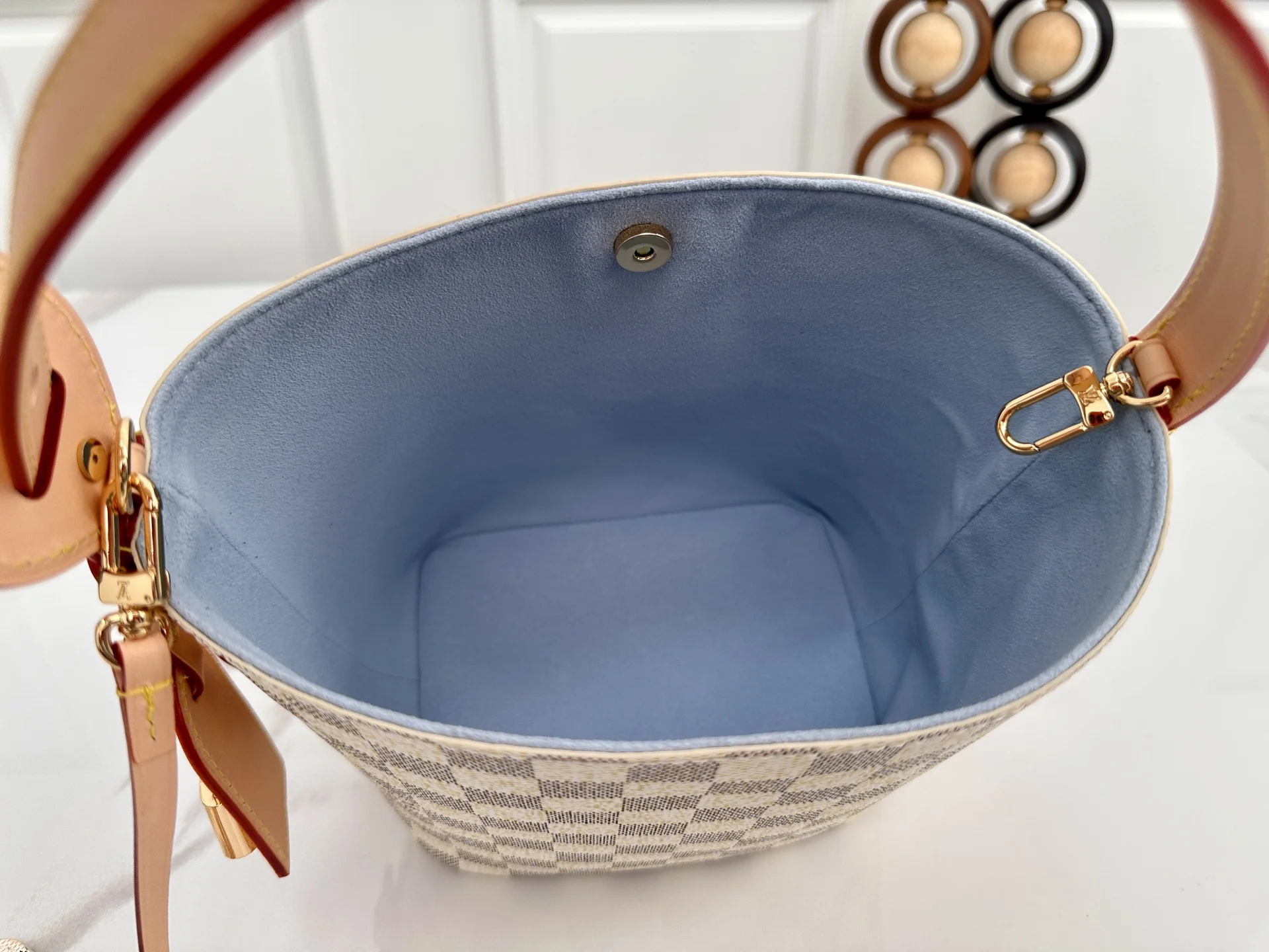 本款All In BB手袋此次取材 Damier Azur帆布焕新演绎 搭配撞色皮革 金属挂锁和可拆卸名牌等多重经典素 可采用多种背携方式点亮昼夜场合 内设可拆卸拉链袋