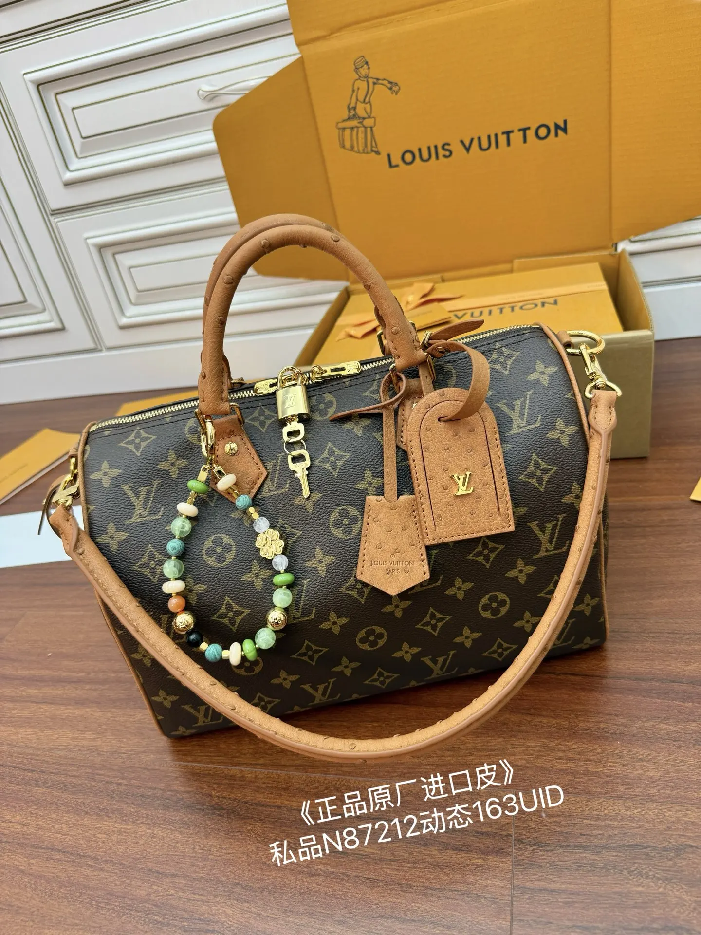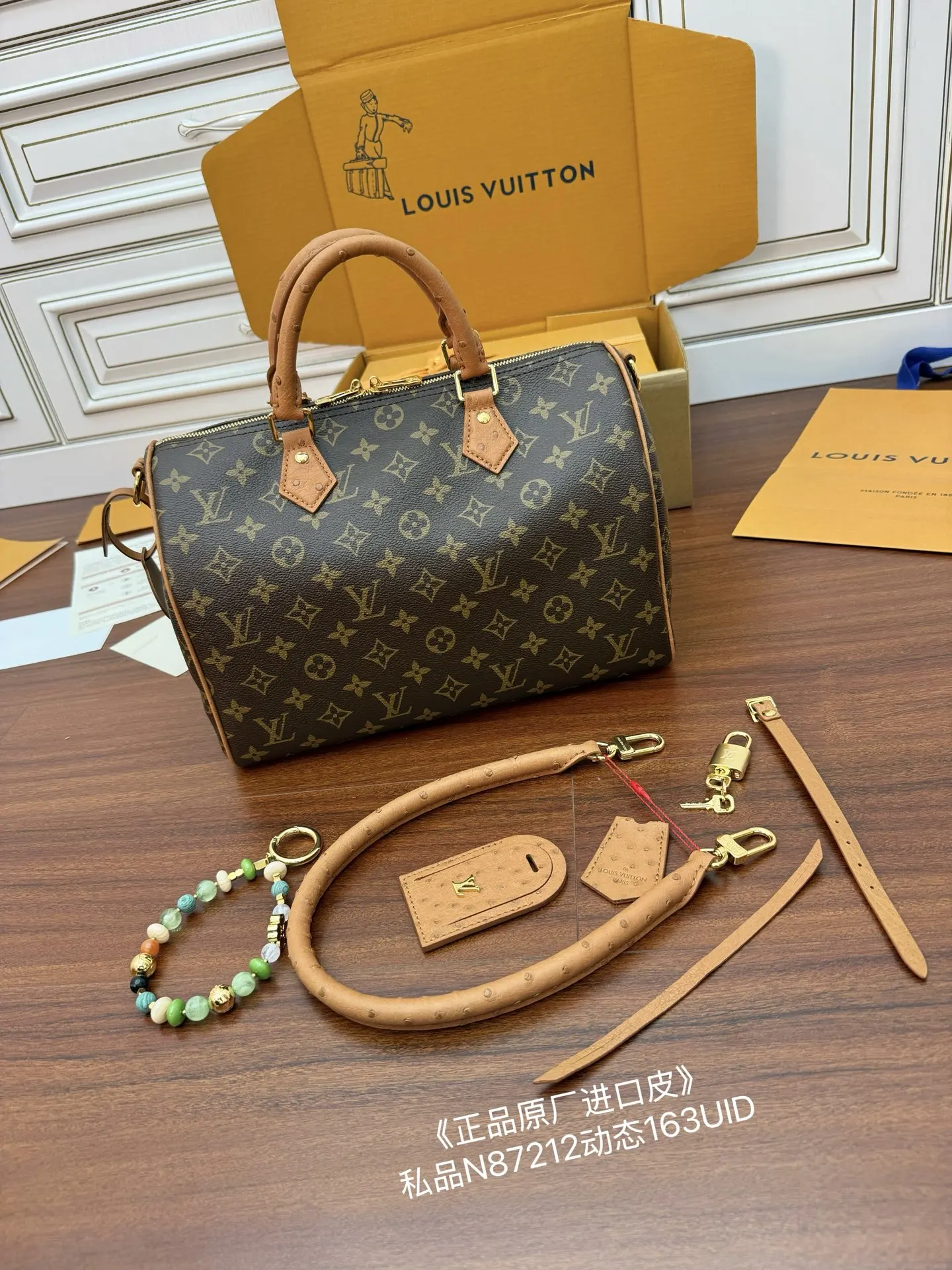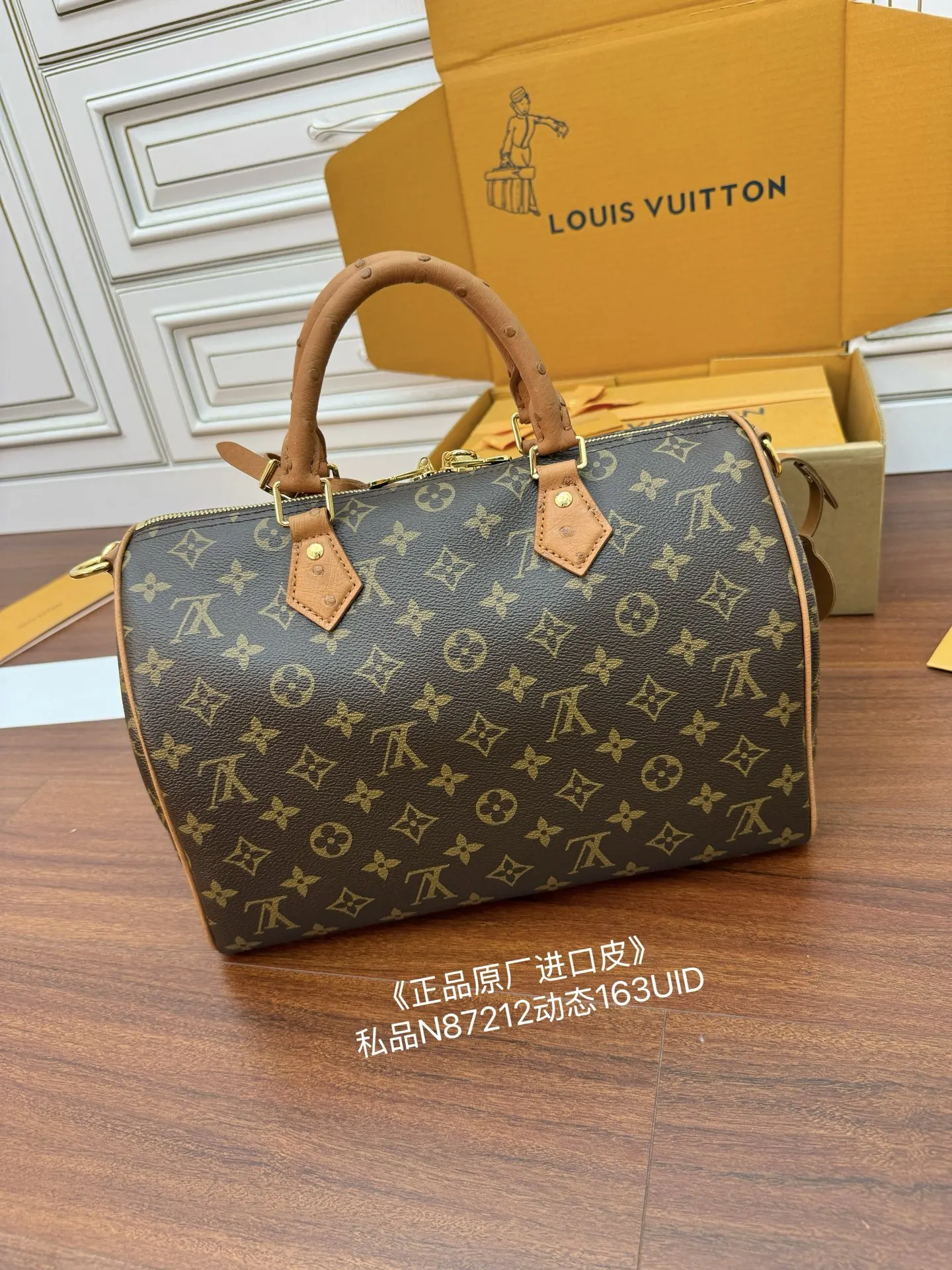 独家真鸵鸟皮(正品原厂进口皮)首发型号 N87212私品 163动态UID 进口菱形面料 品质和材料第九次再次升级 专柜同步 动态电子芯片 礼品袋 保护纸 铜版电子标签 合格证 皮料是正品代工厂意大利A级树膏皮 私品 是在于品质 五金 面料 手工 油边 是A级出品 拍摄图跟产品一致丶配图上的全套包装.尺寸 30x21x17CM