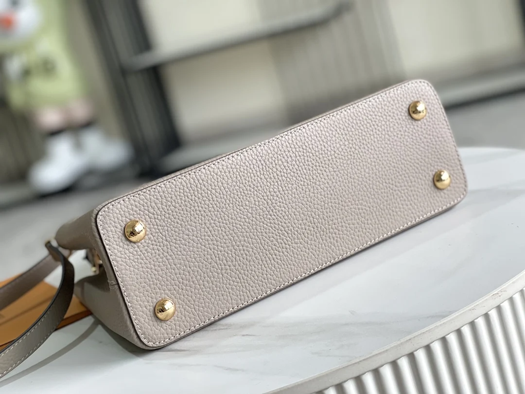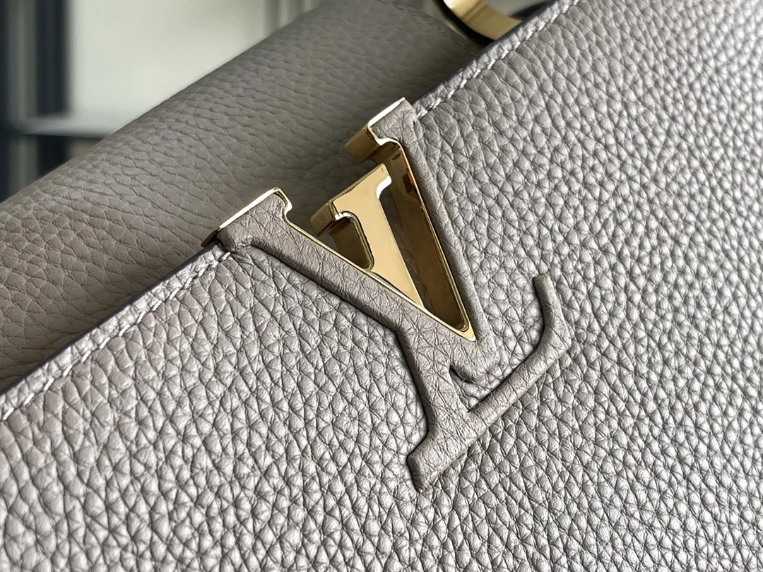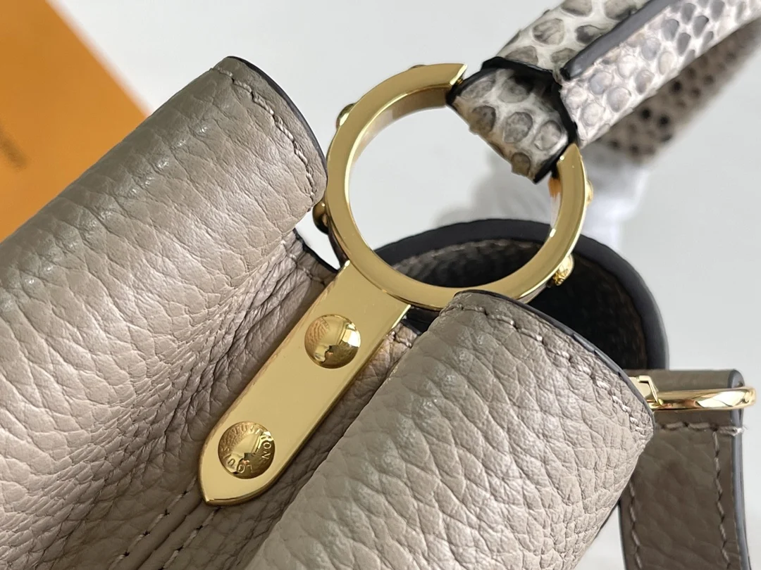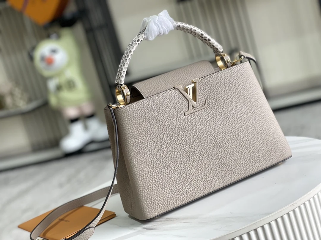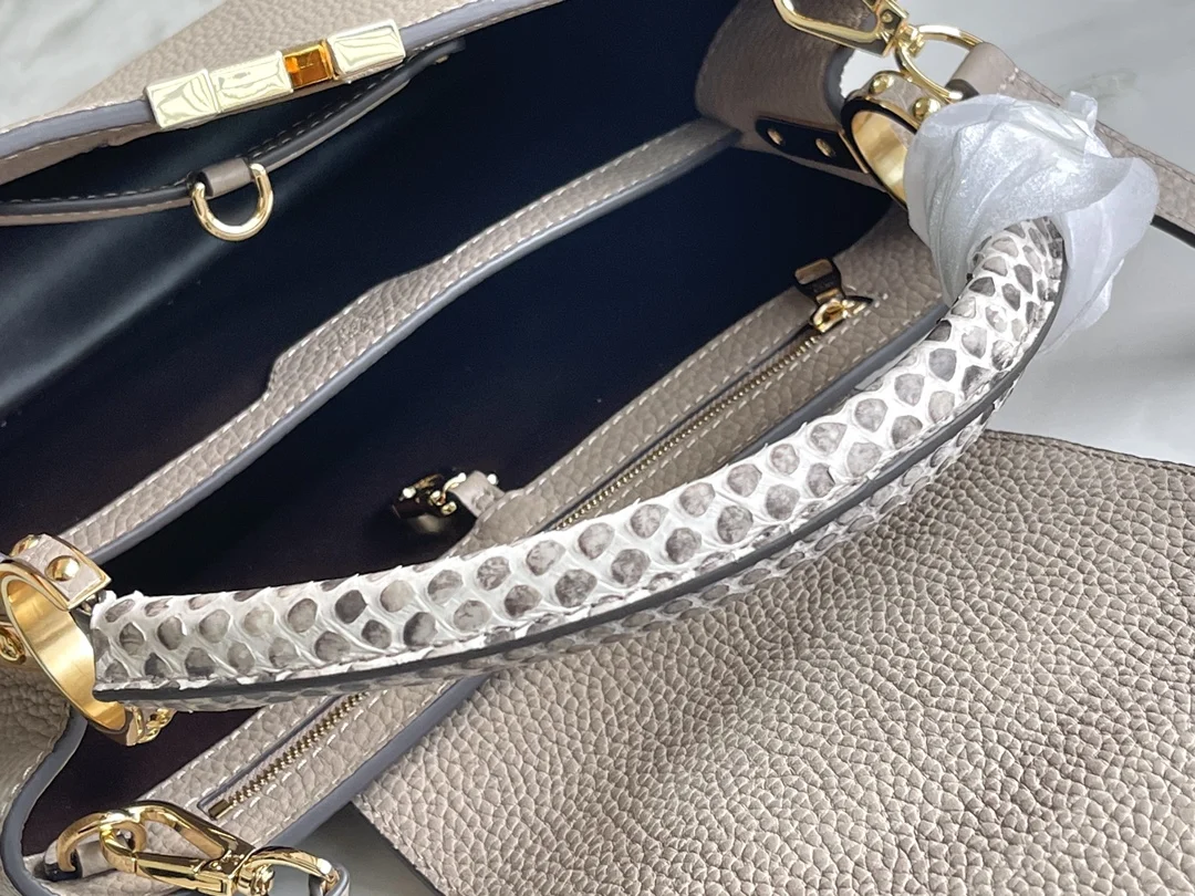 第一家路易威登门店开在巴黎的嘉布遣街上 Capucines手袋与品牌一样经久不衰 可以为任何造型带来时尚的精致感 全粒面Taurillon皮与稀有宽纹蟒蛇皮结合 打造出一款奢华的手提包 各种传统的细节是手袋的亮点 LV首字母 独特的边环 翻盖上精细的Monogram花朵 配有顶部手柄 可脱卸包带与独特包盖 多种背携风格 适应不同造型或心情