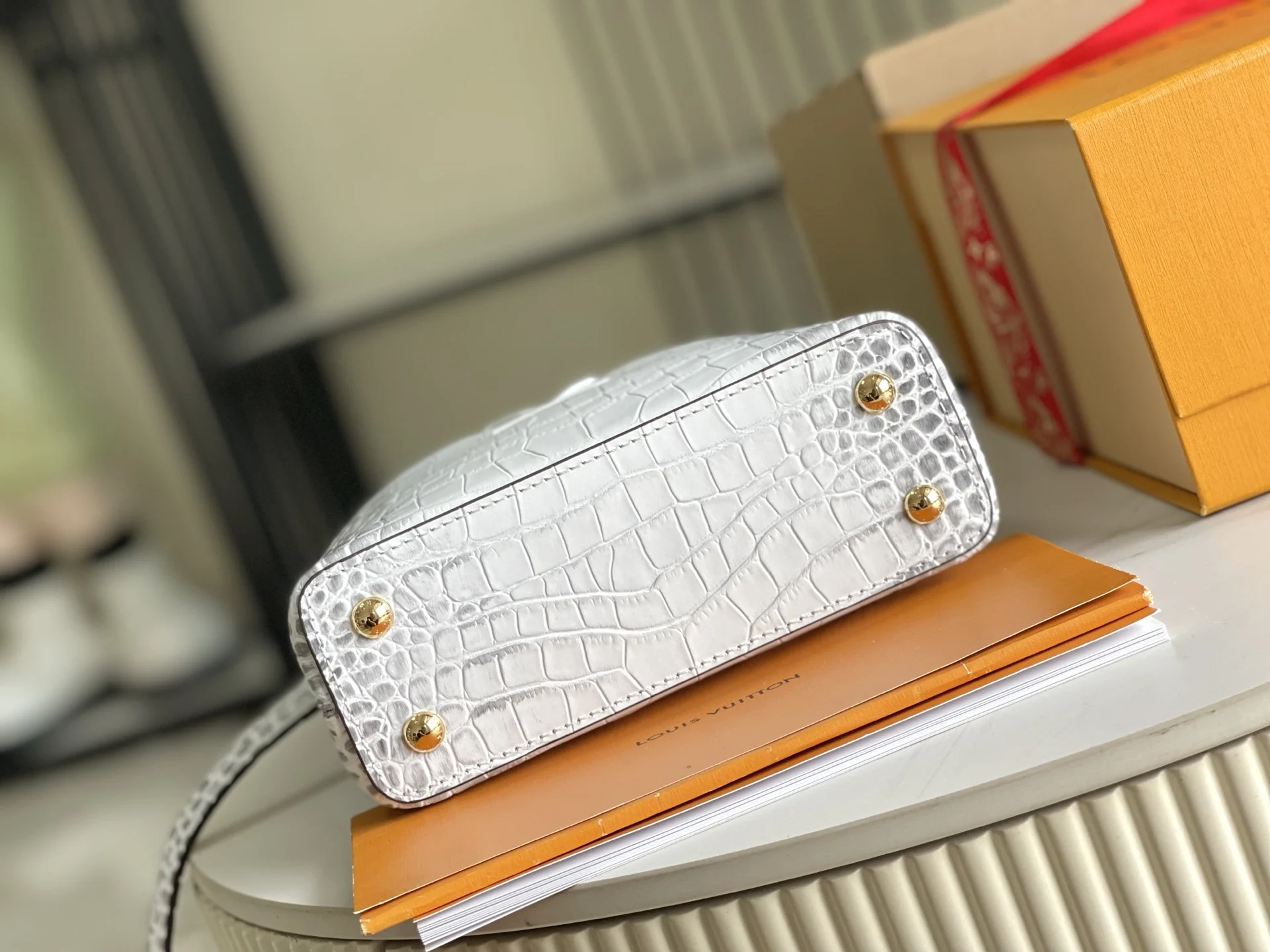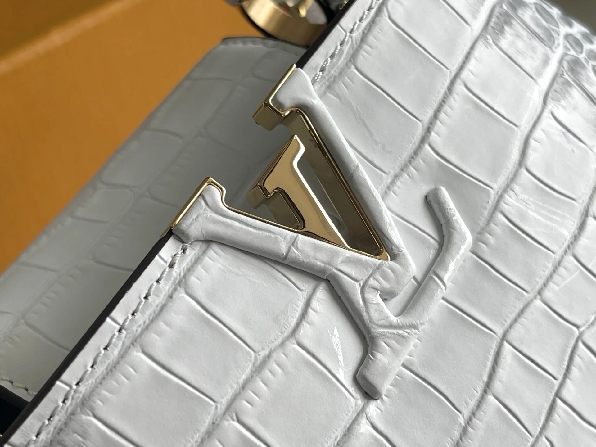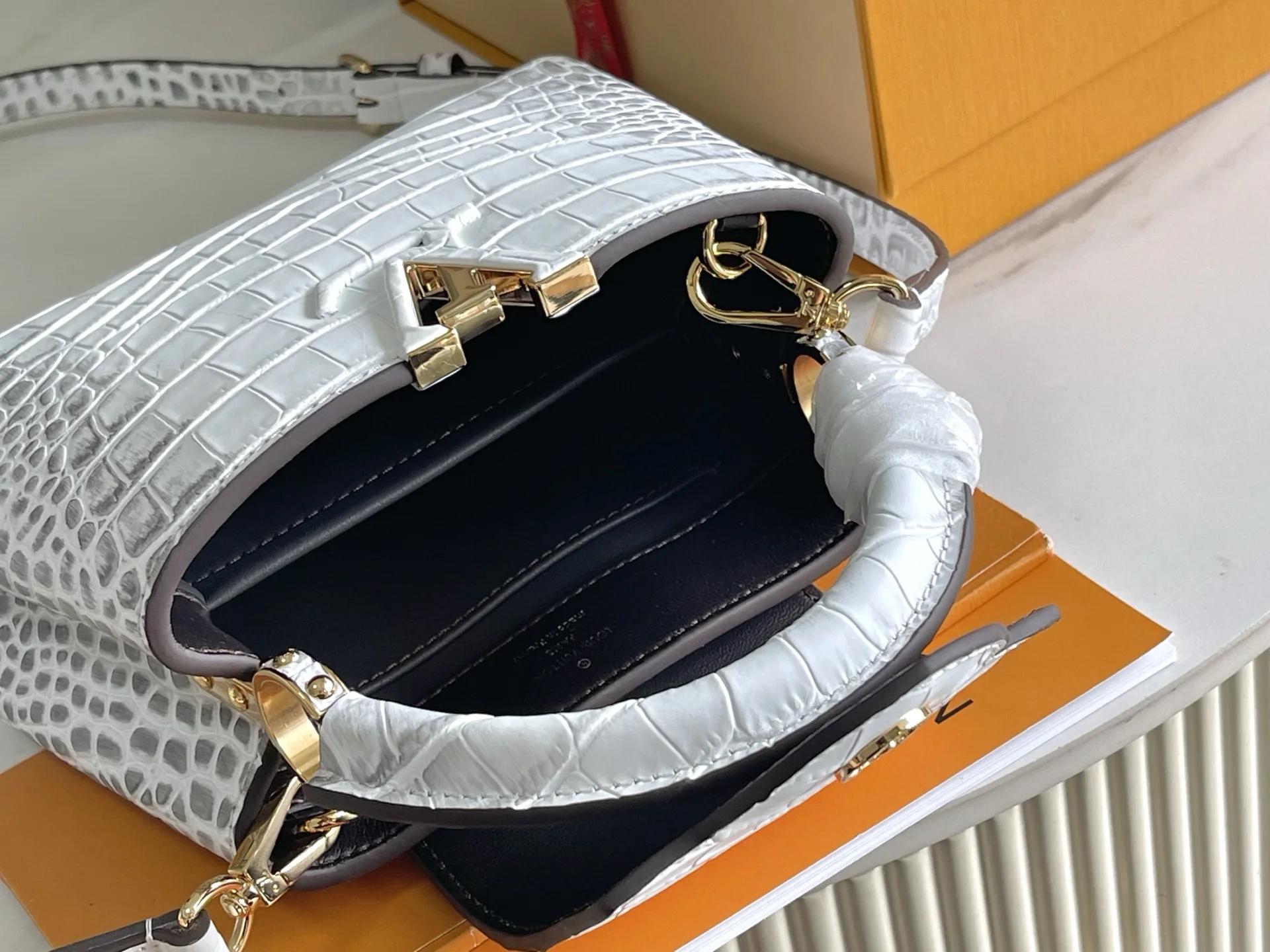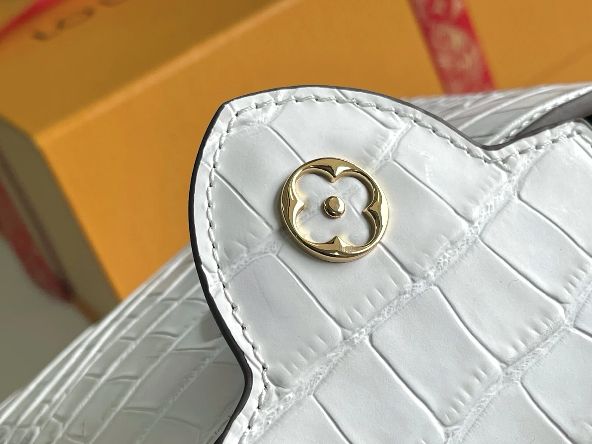 本款 Capucines 迷你手袋以鳄鱼皮革包裹羊皮革内衬 搭配耀目金属件 Capucines 系列翻盖拥有两式风尚 内收呈现 LV 字母 外置绽放 Monogram 花卉 玲珑构型可为晚间场