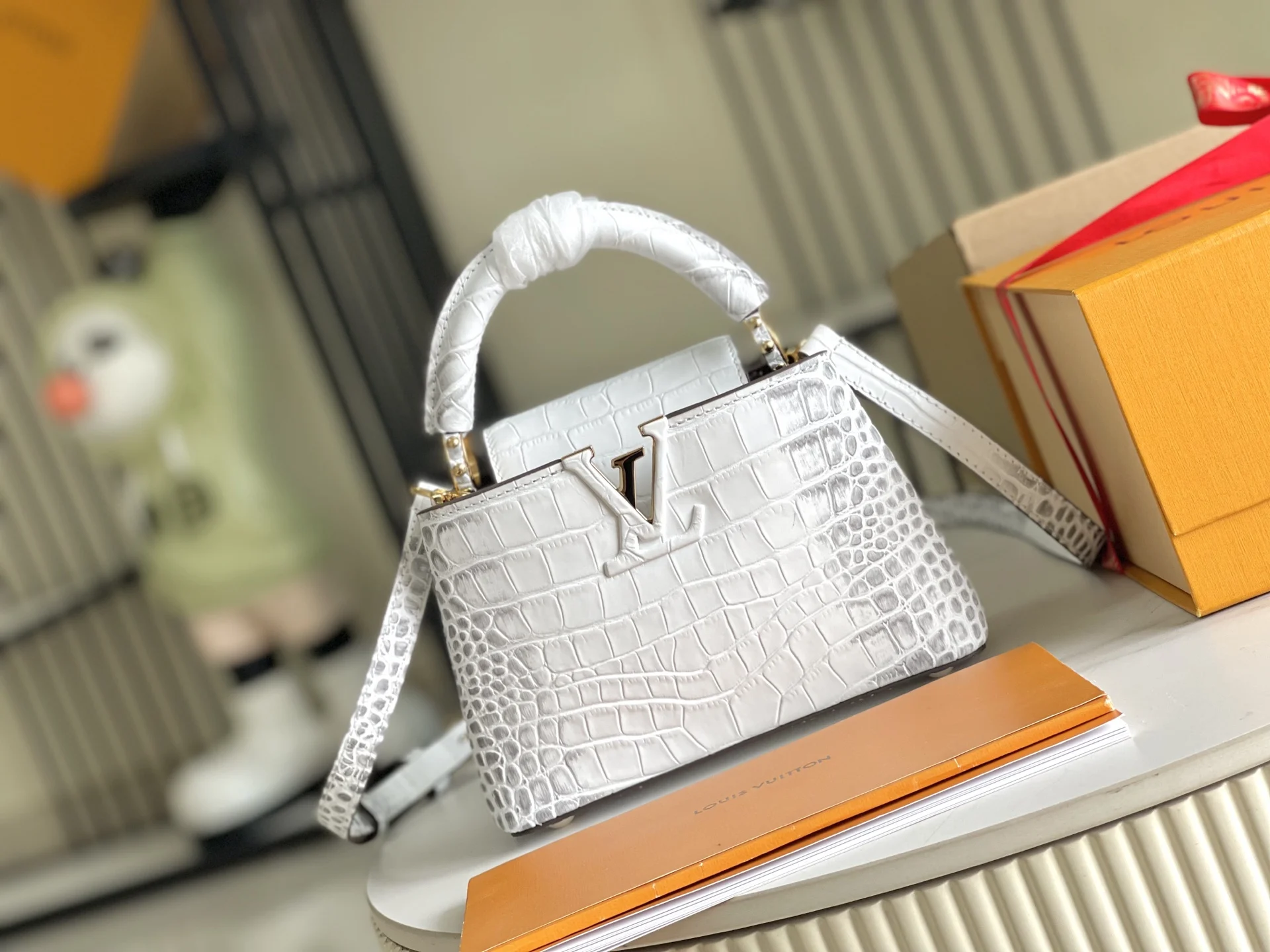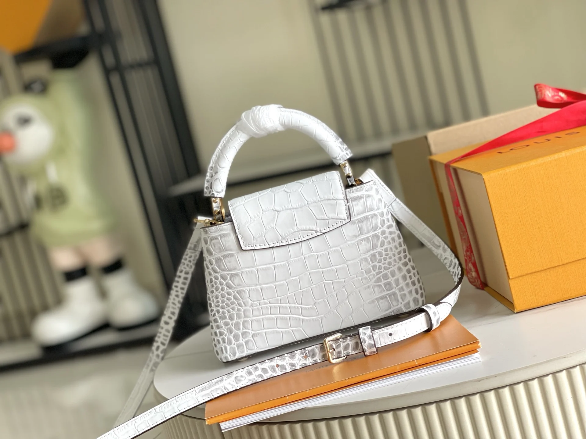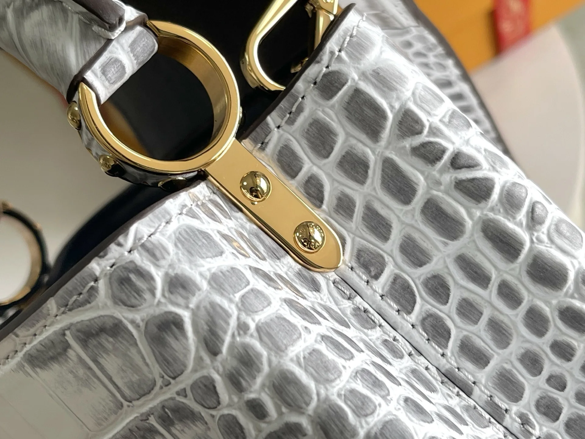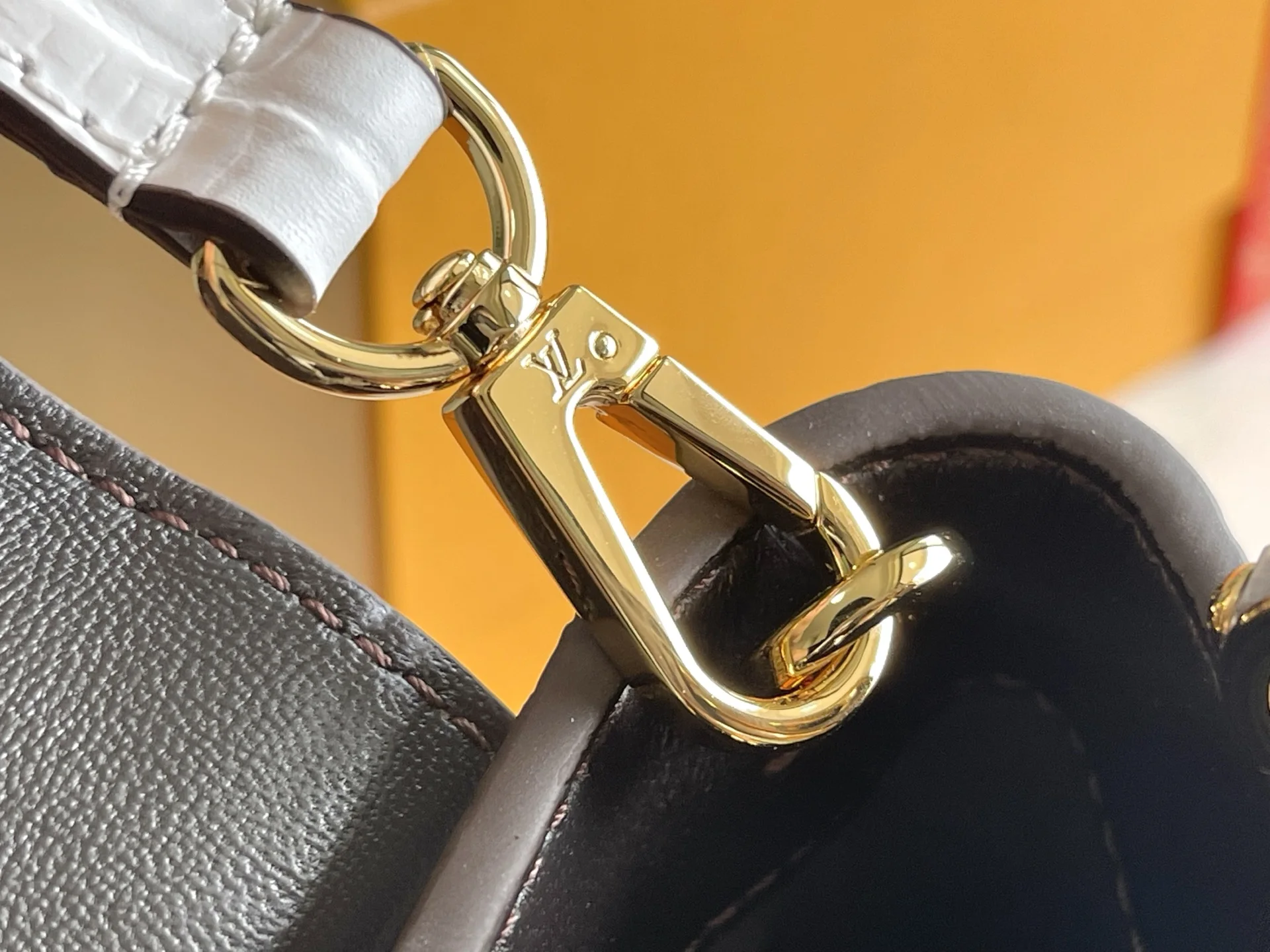 本款 Capucines 迷你手袋以鳄鱼皮革包裹羊皮革内衬 搭配耀目金属件 Capucines 系列翻盖拥有两式风尚 内收呈现 LV 字母 外置绽放 Monogram 花卉 玲珑构型可为晚间场