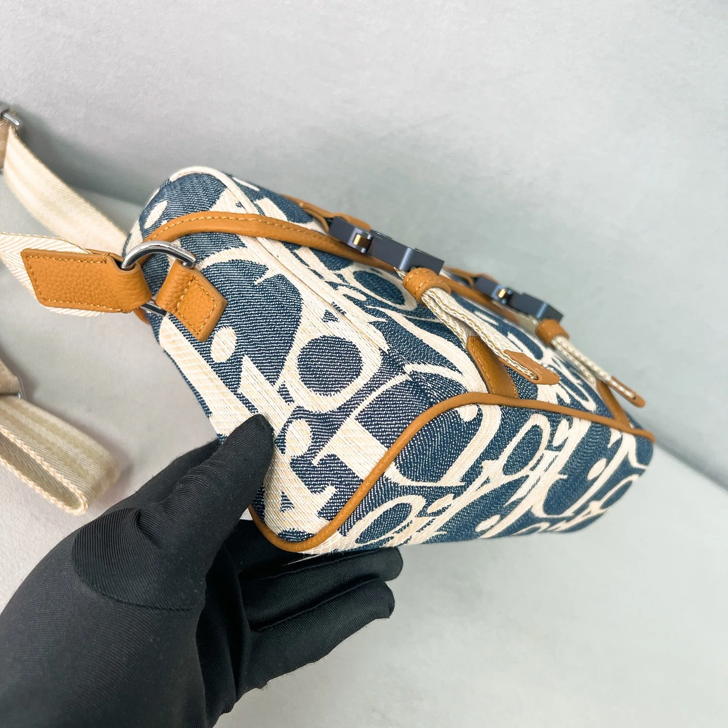 采用蓝色和米色酒椰草面料搭配粒面牛皮