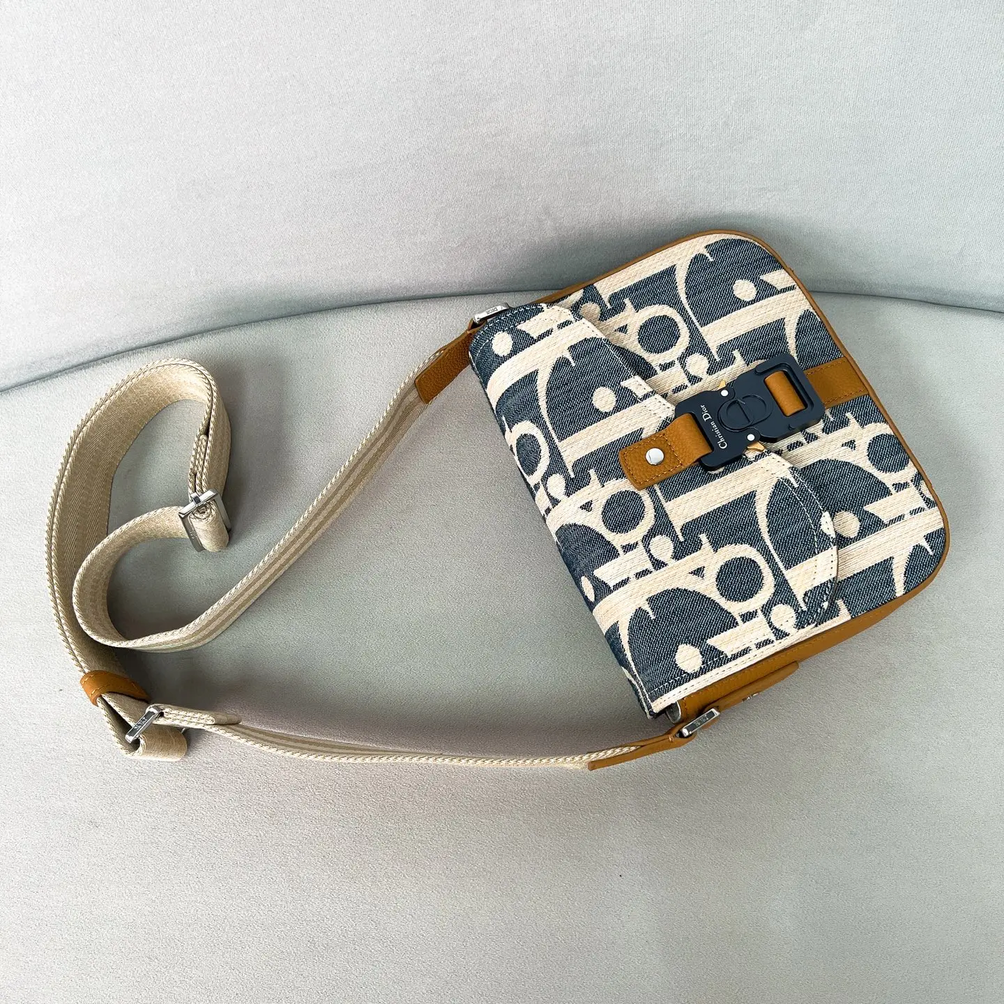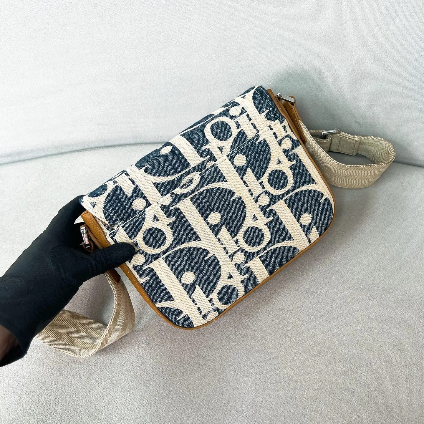 采用蓝色和米色酒椰草面料搭配粒面牛皮