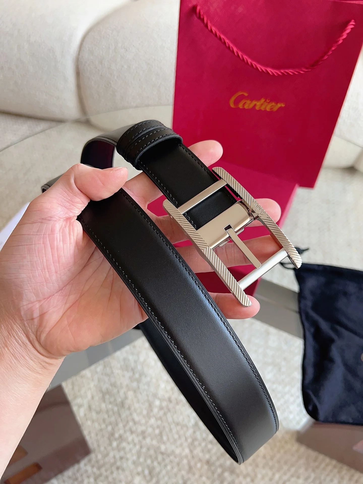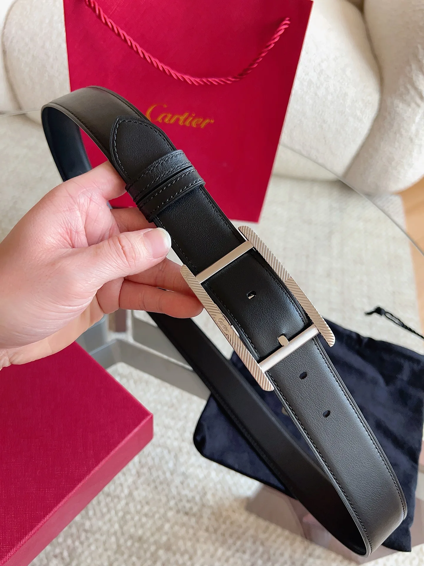Cartier 卡地亚 新款TANK DE CARTIER系列皮带 镀钯饰面皮带扣 饰有槽纹图案 CARTIER 标志 凭借匠心杰作展现与众不同的美感 融合精湛工艺与经典设计 演绎隽永风格 潇洒不羁 果敢独立 款式易搭配服饰 休闲正装两相宜 皮带宽度 35mm