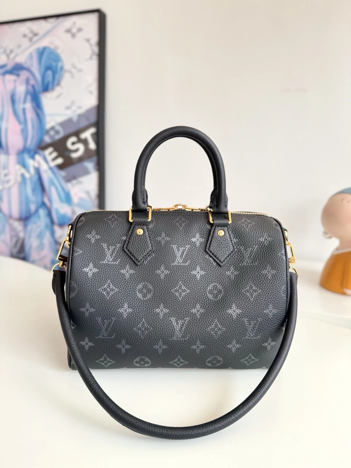 海外原单M26486独家实拍 本款 Speedy Bandouliere 25 手袋以牛皮革缔造抱枕般的柔软触感 为 LV Bliss 系列增添摩登一员 品牌经典 Monogram 图案采用三重数码印花技术重塑 珠宝般的 Monogram 花卉链带闪烁莹泽光芒 尺寸 25×18×13cm