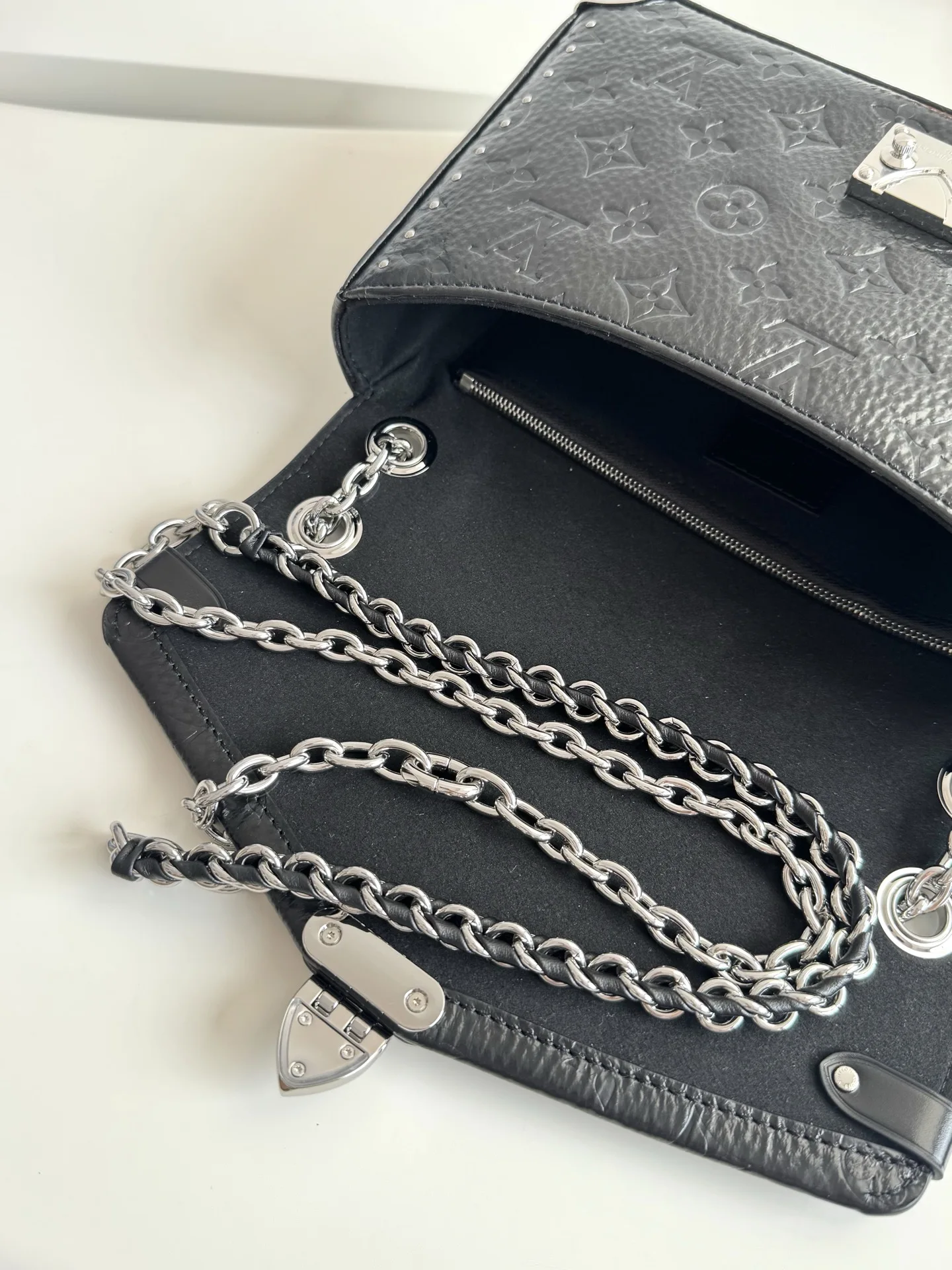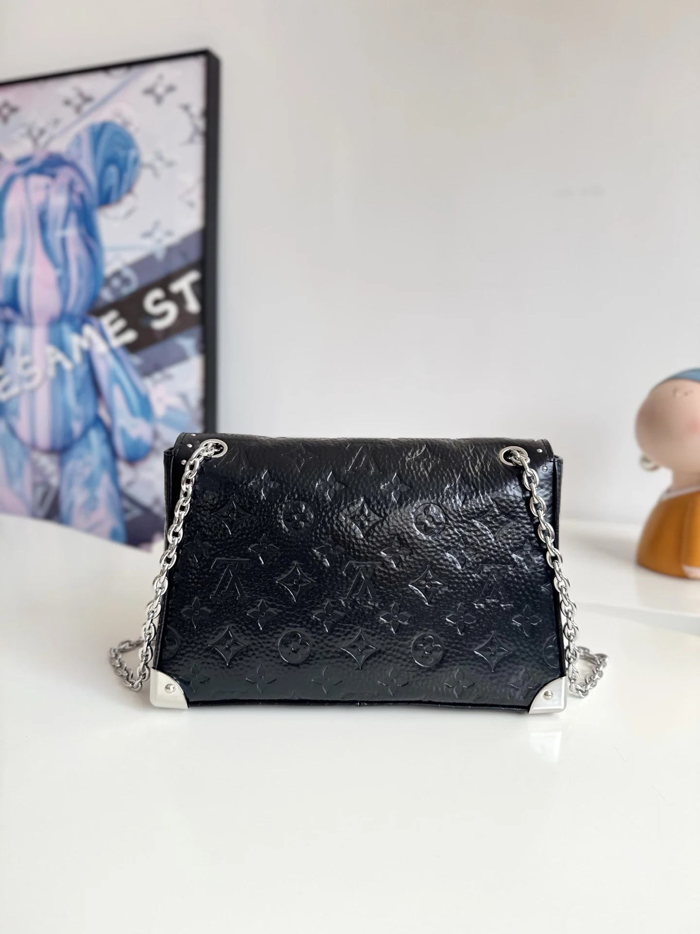 海外原单M28137独家实拍 这款 Monogram Saga 版的 Trunkie 手袋拥有酷感做旧饰面 为经典廓形注入不羁的摇滚精神 它采用皮革精制 饰有金属件 包括灵感源自硬箱的包角 饰钉和标志性的 S-lock 锁扣 滑动链条便于多样背携 内置拉链口袋可妥帖收纳小物 尺寸 27×16×8cm