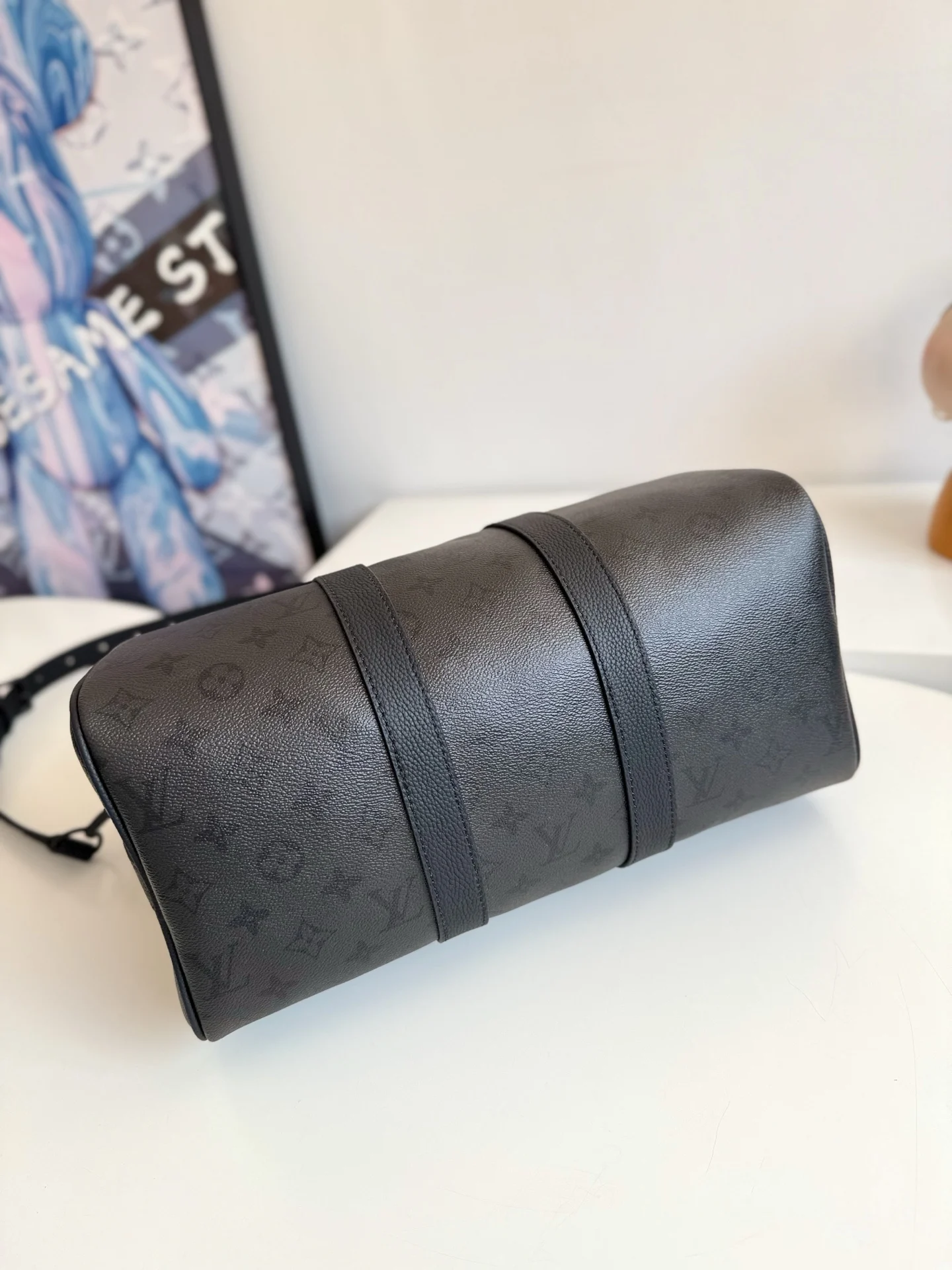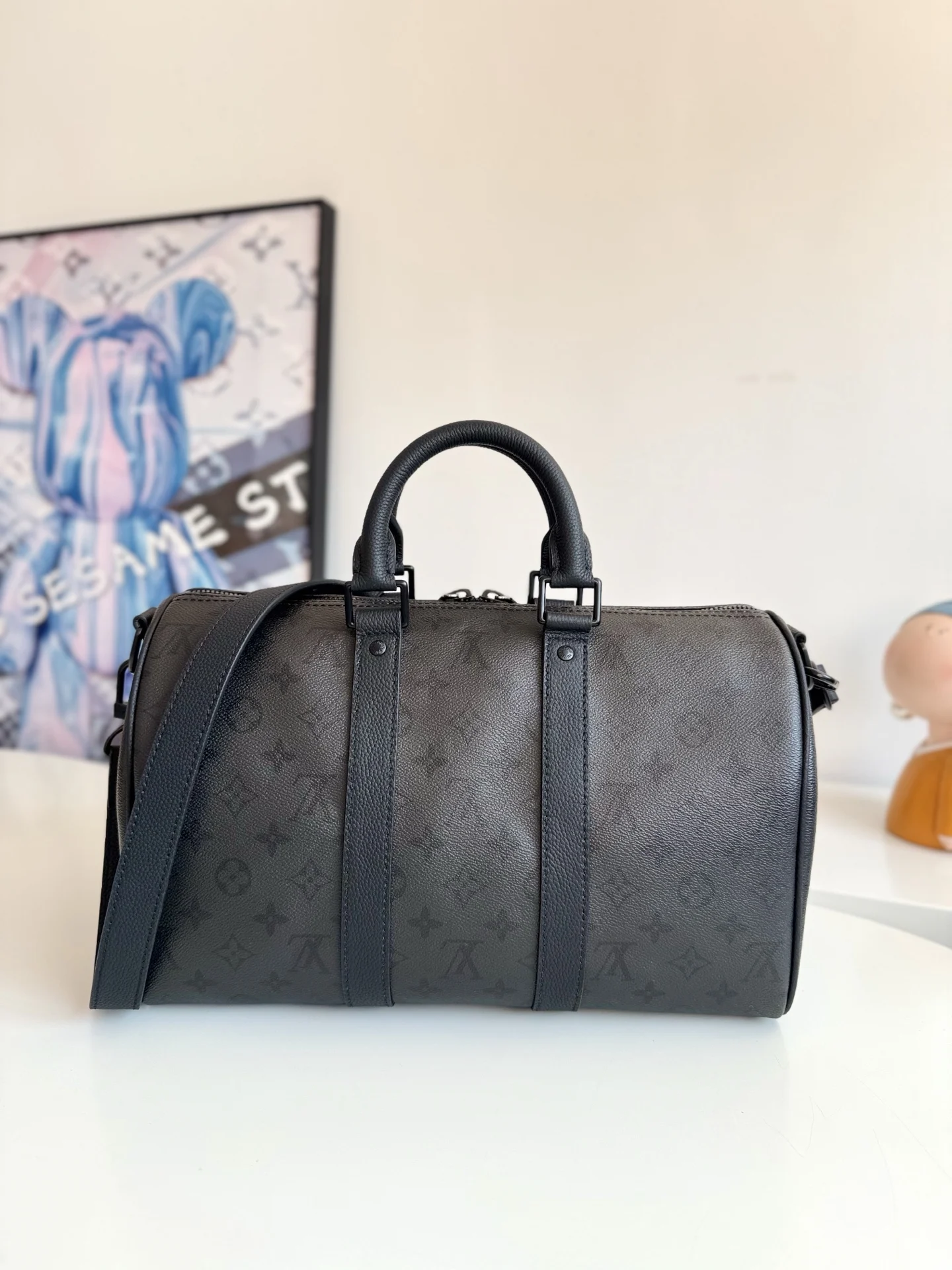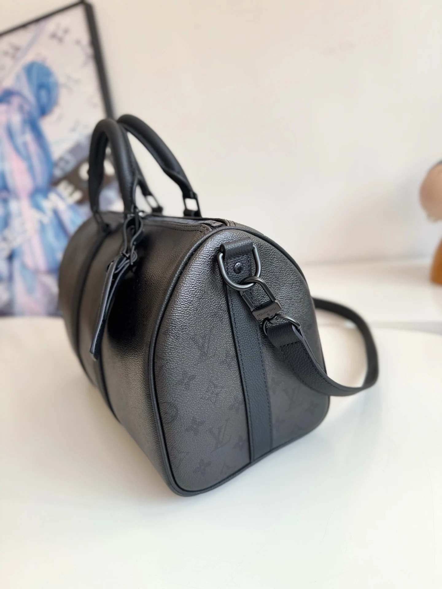 海外原单M28370独家实拍 本款 Keepall Bandouliere 35 手袋为 Monogram Midnight 涂层帆布搭配沉稳皮革饰边 哑光金属件及拉链烘托利落观感 可拆卸并调节的皮革肩带实现舒适肩背或斜跨 辊压皮革顶部手柄再添手提选择 尺寸 34×21×16cm