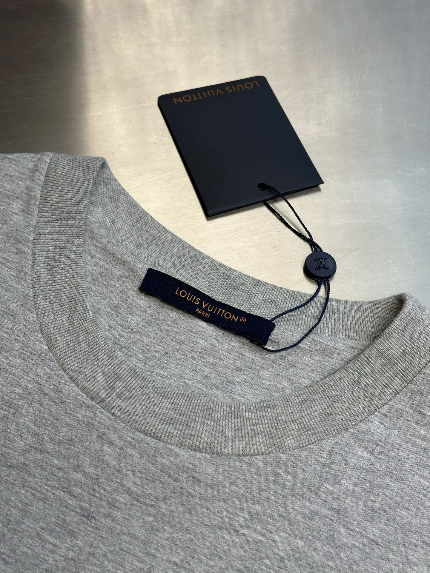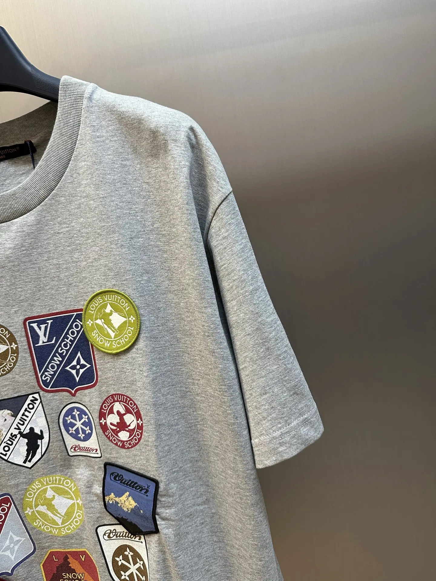 这件短袖灰色针织衫 巧妙融合了印花与刺绣的LV滑雪臂章 庆祝旅行的艺术 色彩斑斓且图案丰富的设计灵感来自滑雪学校徽章 细节丰富 带有学院的签名 这件休闲单品为冬日度假造型增添了精致的点缀