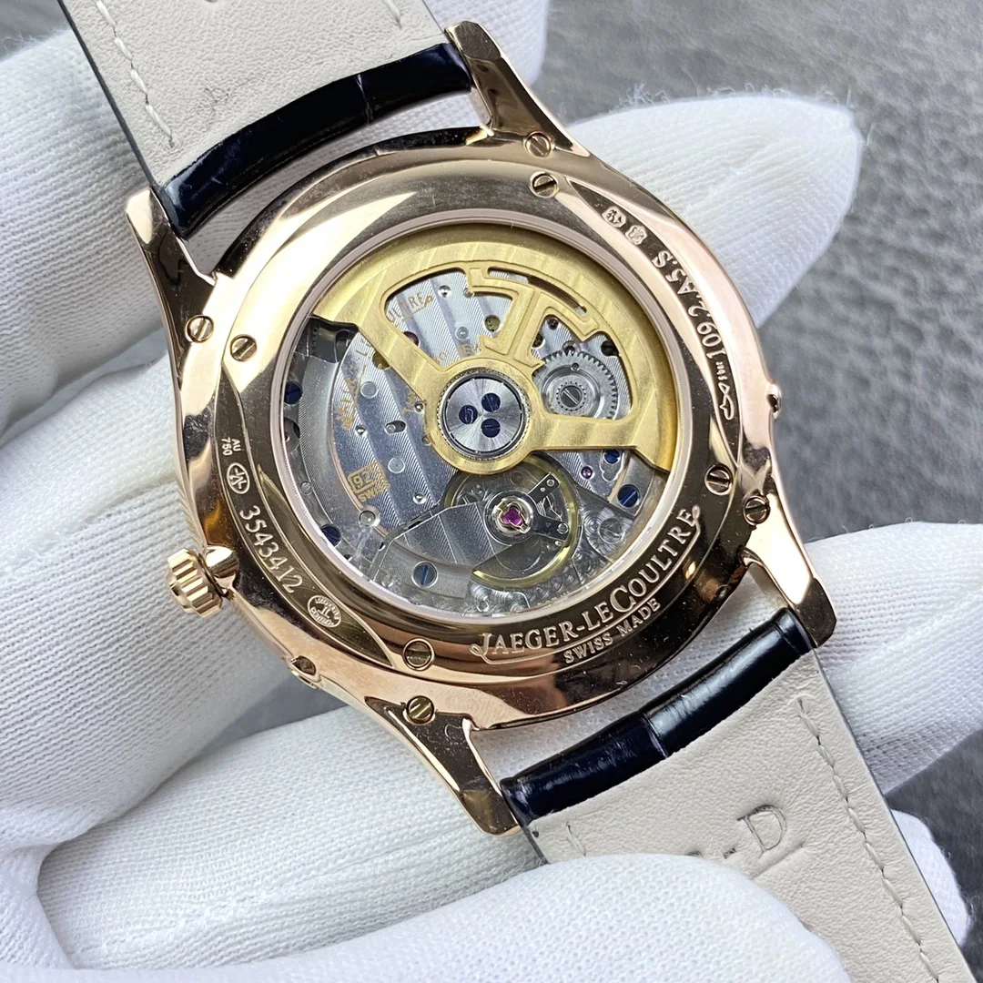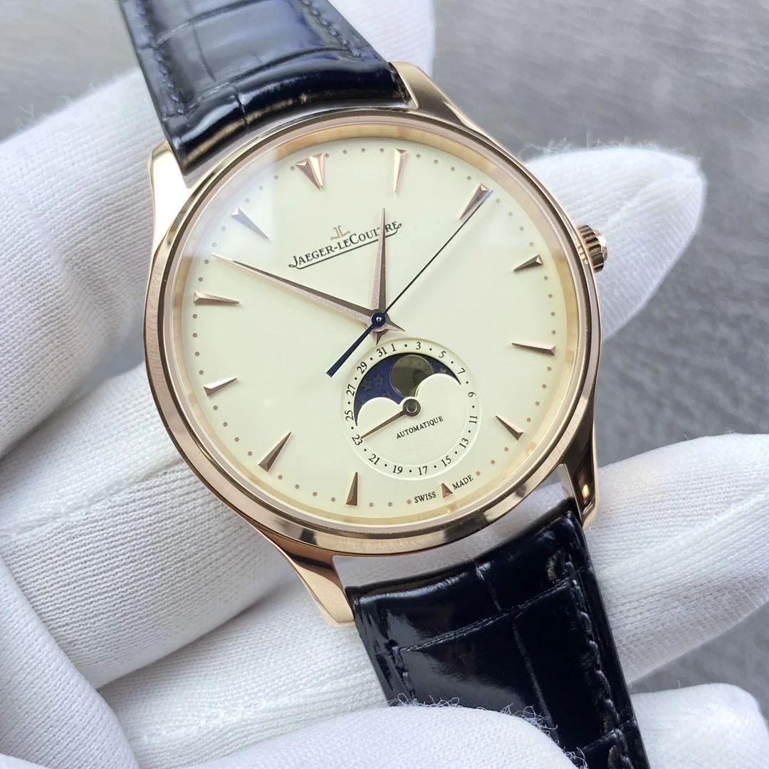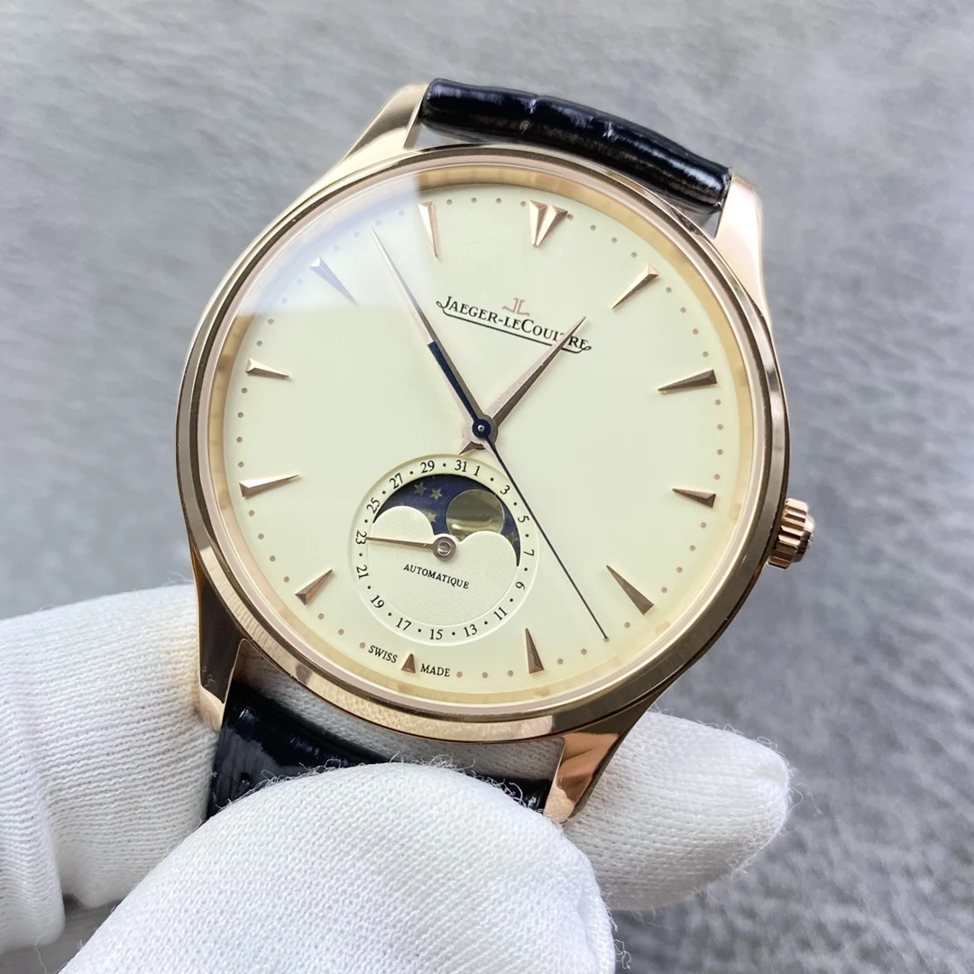 积家月相大师系列正装男表Q1368420.鳄鱼皮 表壳直径39mm 厚度9.9mm 数控精雕立体月相盘 完美还原原装 搭载Miyota9015魔改一体Cal.925/1机芯 镂空链条盒让机芯看起来 更积家 自动陀电镀了特调的K金色 并非市场上普通的红玫瑰金 实实在在匠心打造 Gr 厂出品 出货实拍