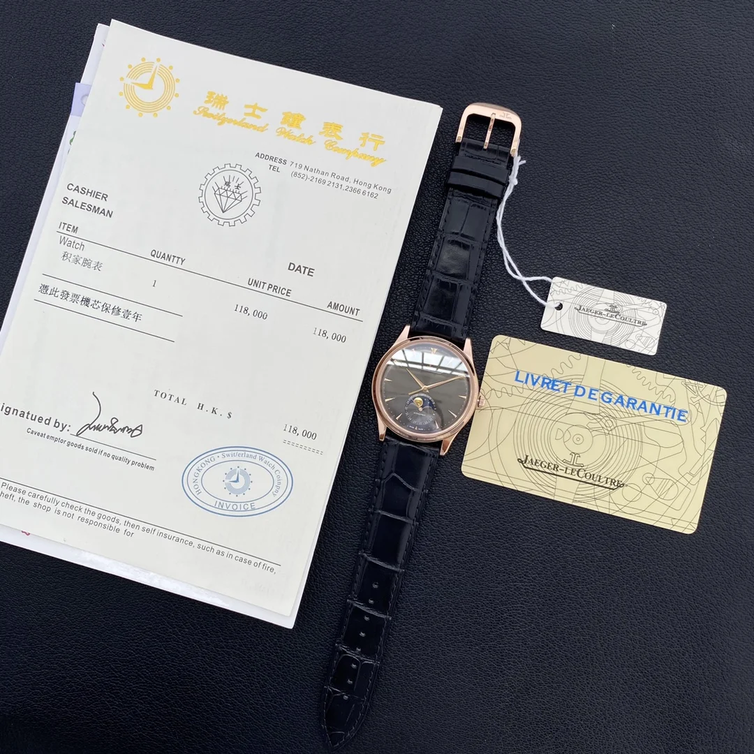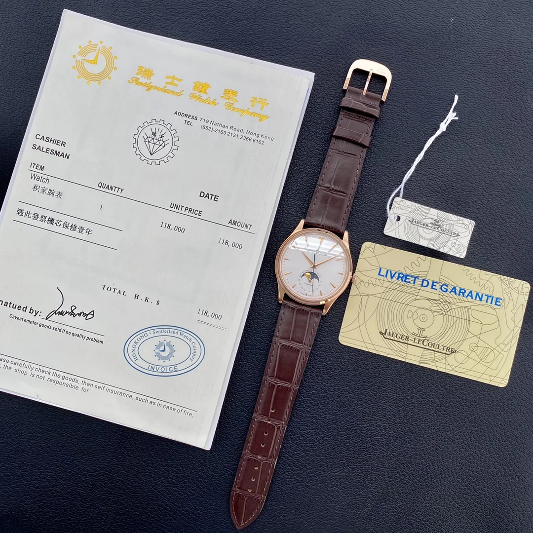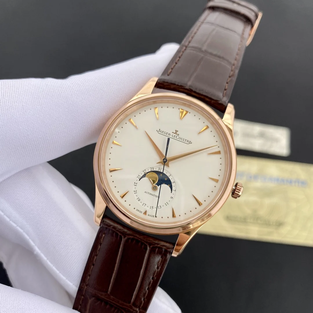 端系列 完美做工 给它一个专柜就是正品大厂出品 原版开模 绝对是百里挑一的臻品慢工细琢 只为复刻最强大师 ——积家月相大师系列正装男表Q1368420. 表壳直径39mm 厚度9.9mm 技术要点 一 月相盘 一个月走一圈 逐个逐个使用CNC精雕成型 完美还原原装的立体质感 二 Miyota9015改自产Cal.925/1机芯采用德国进口CNC数控机床铣花 铣花纹细腻清晰 市场唯一对版纵向日内瓦纹 数控精雕镂空链条盒让机芯看起来 更积家 三 表盘压弯弧度吻合原装 工艺难度极高 报废率高达50%以上 产量有限 四 自动陀电镀了特调的K金色 并非市场上普通的红玫瑰金 自动陀螺丝也采用圆头蓝钢螺丝 实实在在匠心打造 字不是最重要的 请看细节图