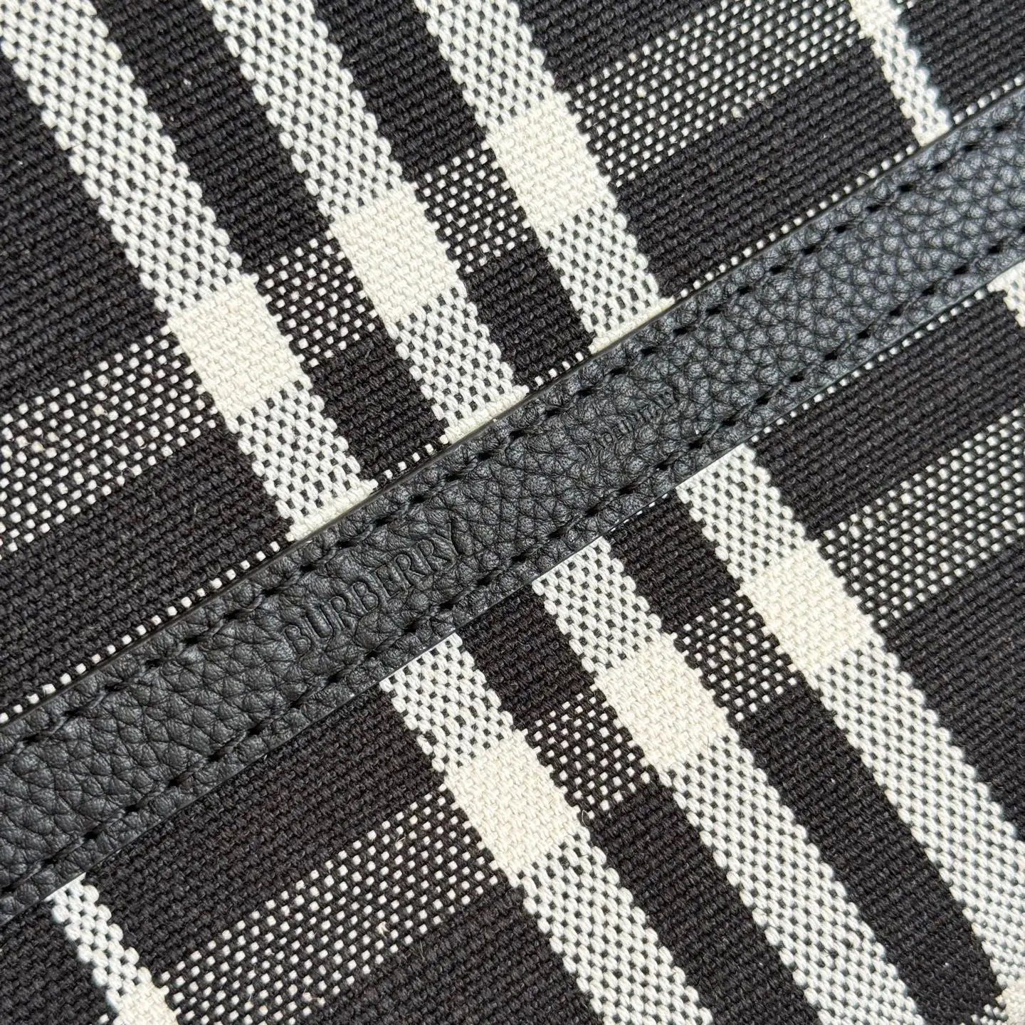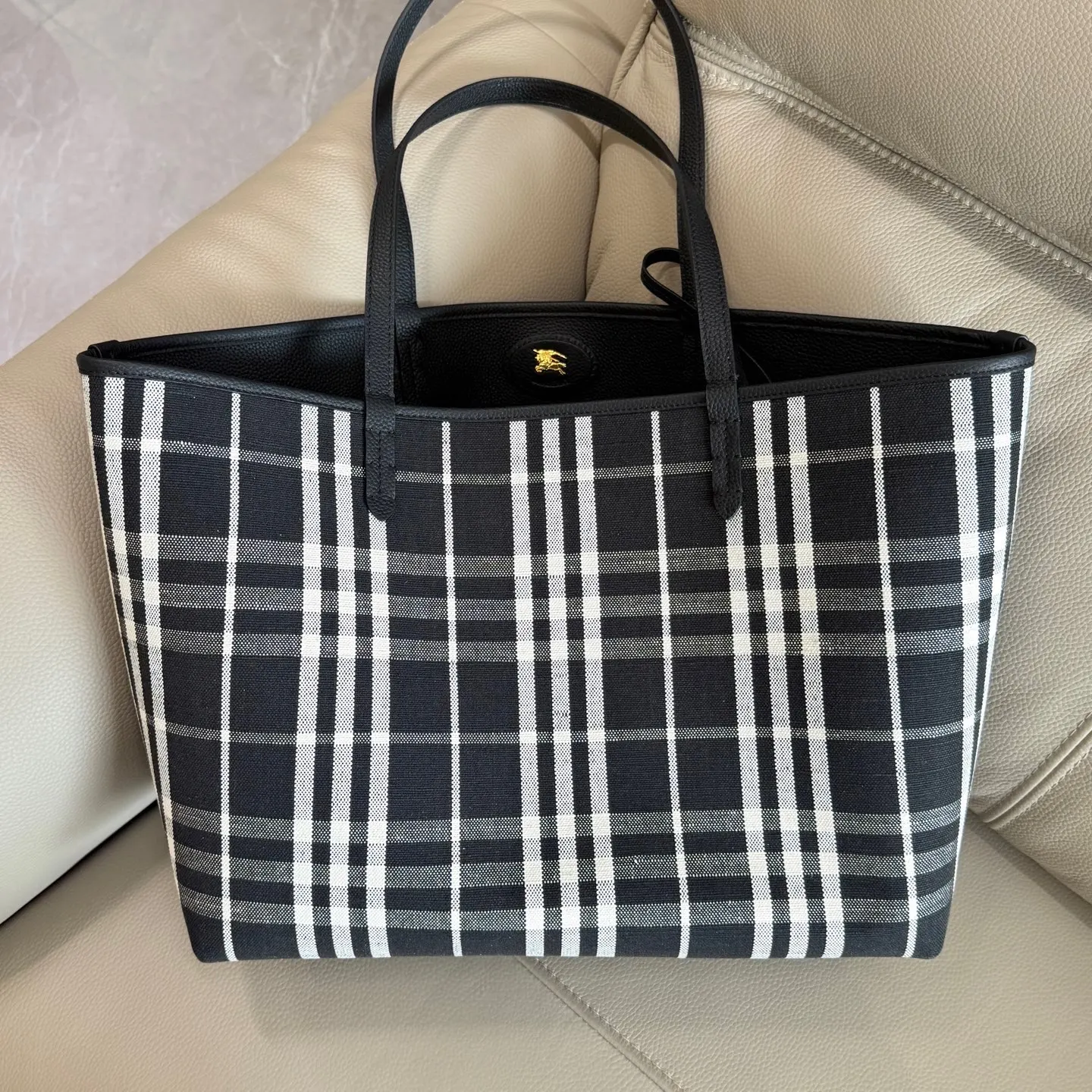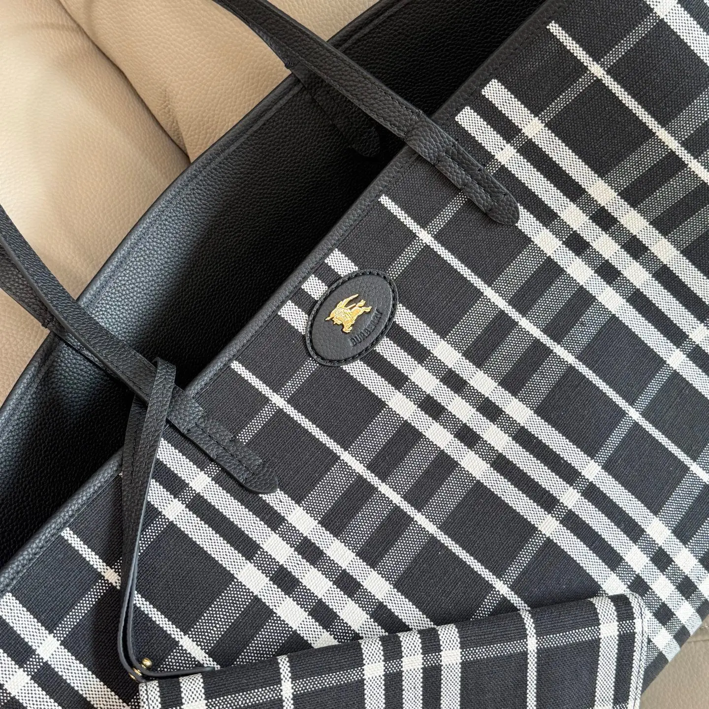 选用粒纹小牛皮材质打造 于意大利工坊精制而成 反面为 Burberry 格纹棉质亚麻混纺 面料 以标志性沙米色演绎 出自品牌 Bloomsbury 系列 点缀牛皮拼金属時士印章 源自 1980年代品牌包款的典藏圏案 随附可拆式按扣收纳袋 适合存放小件物品 尺寸37.5x17x30cm型号6061