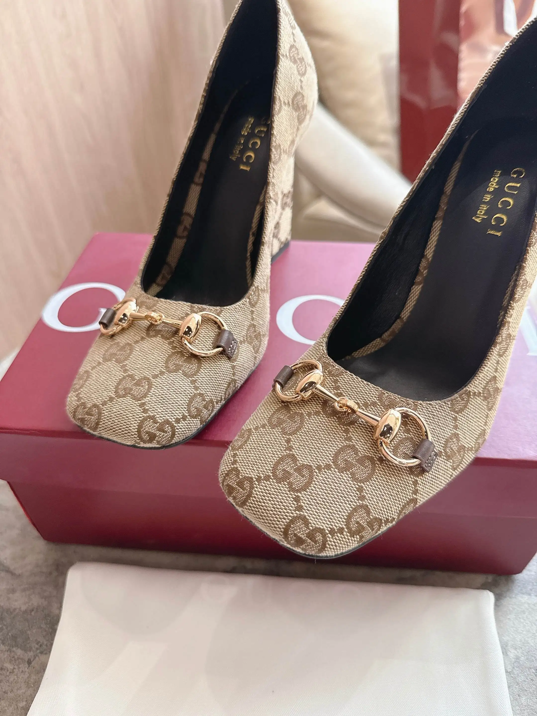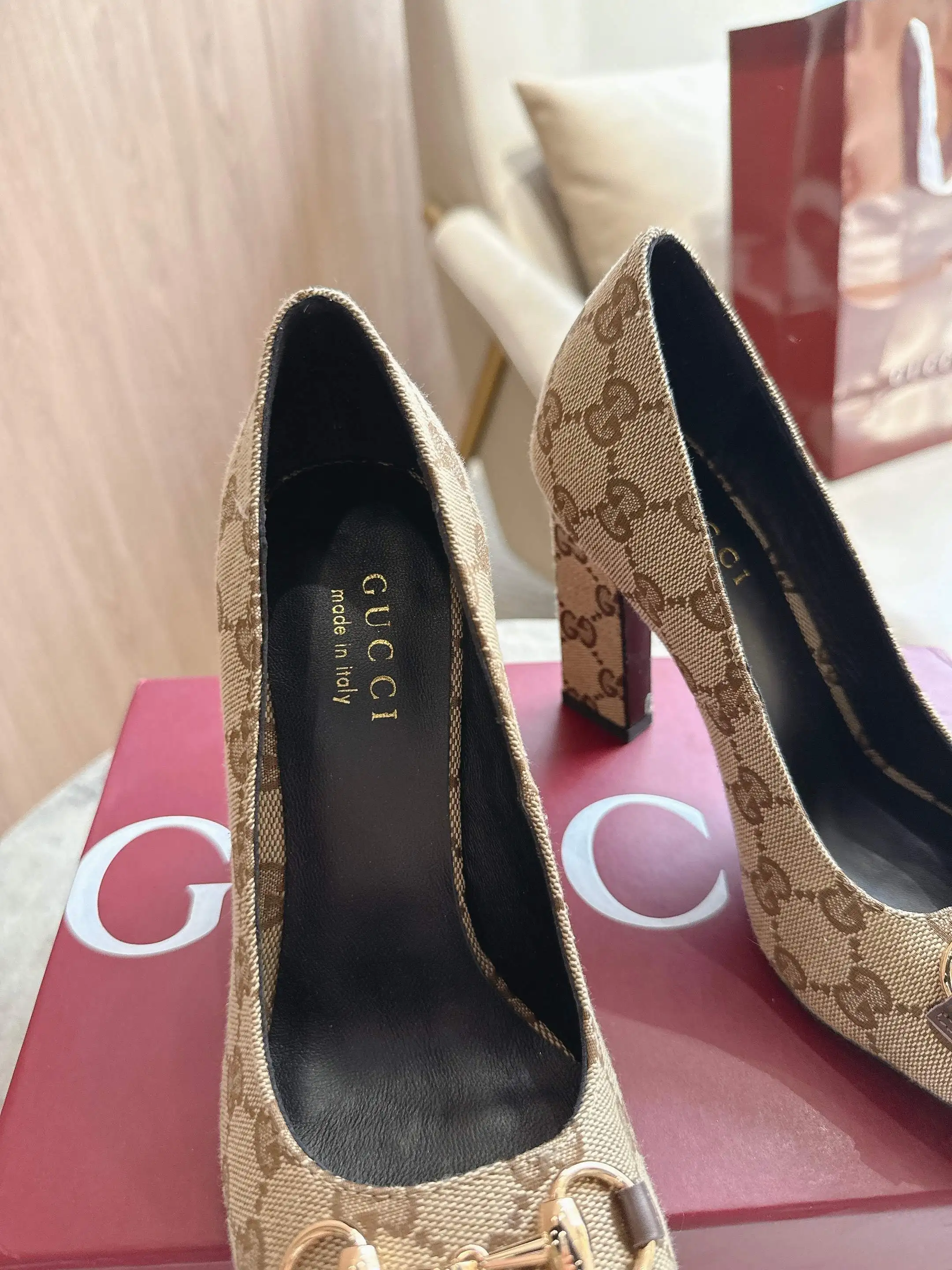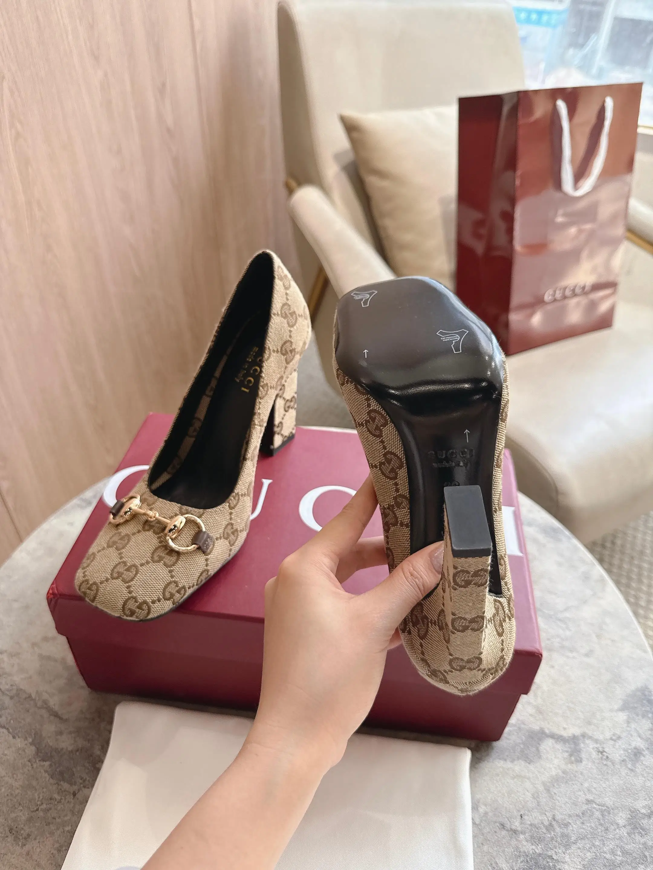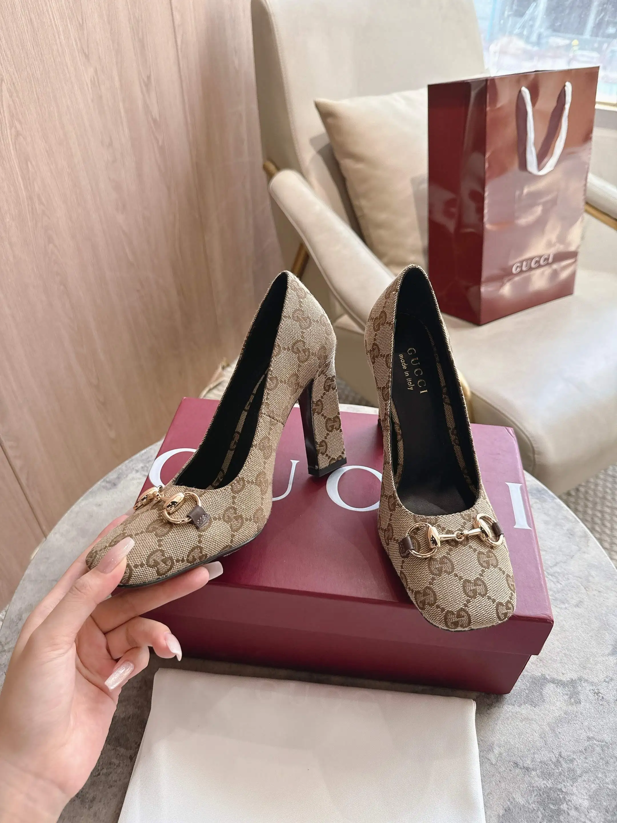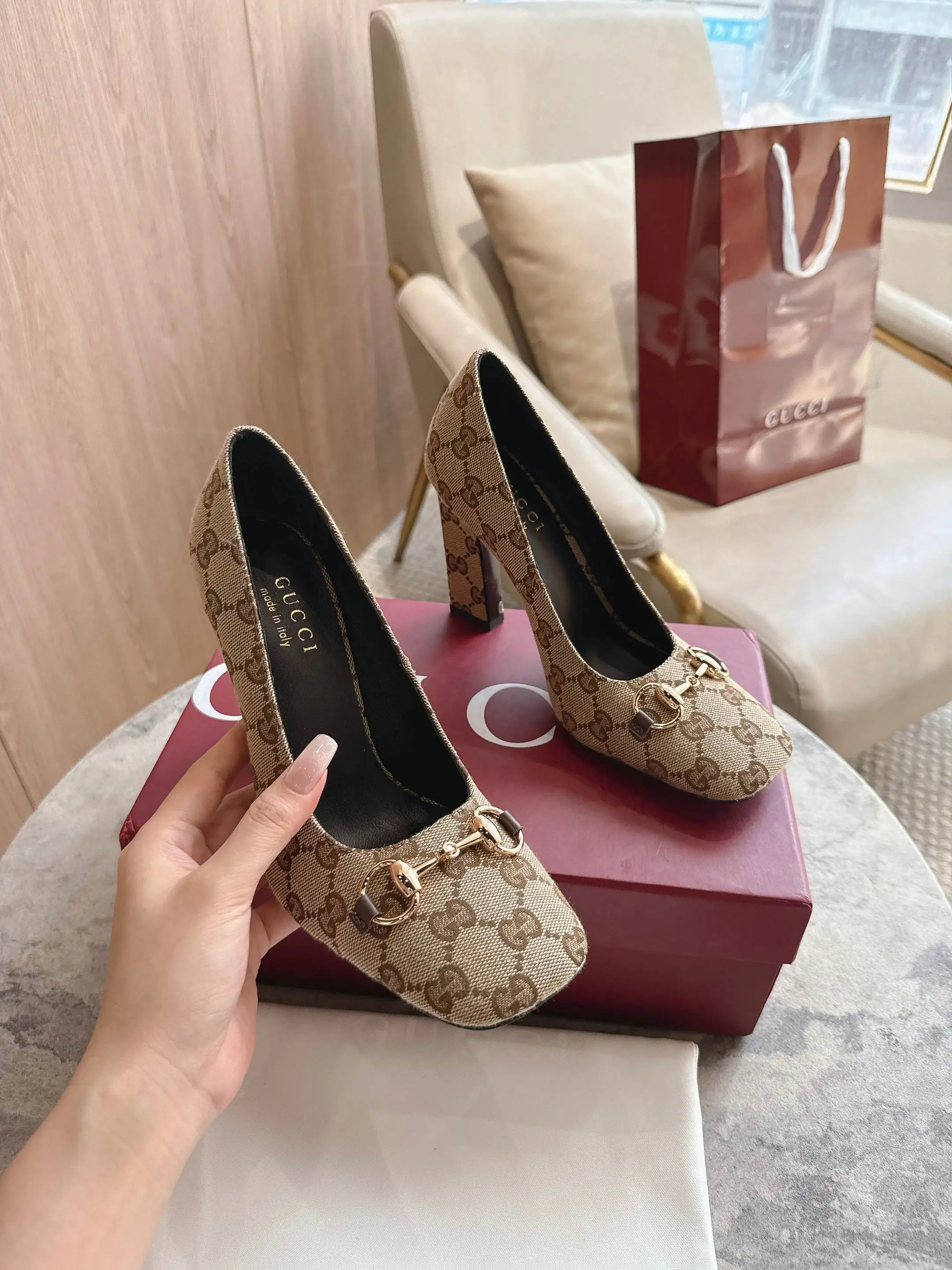 马衔扣和同款金属质感饰面 Made in Italy by Gucci 标识