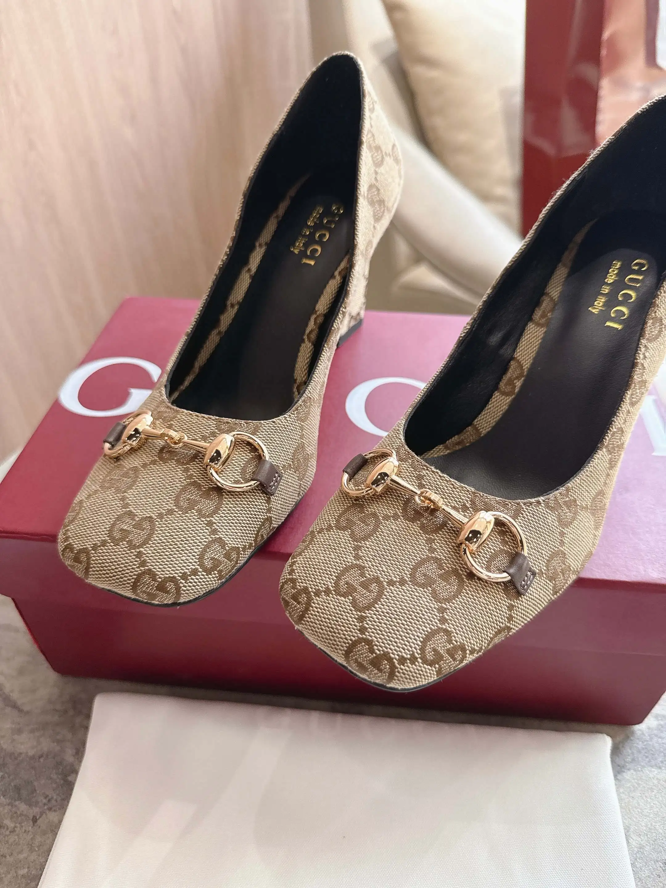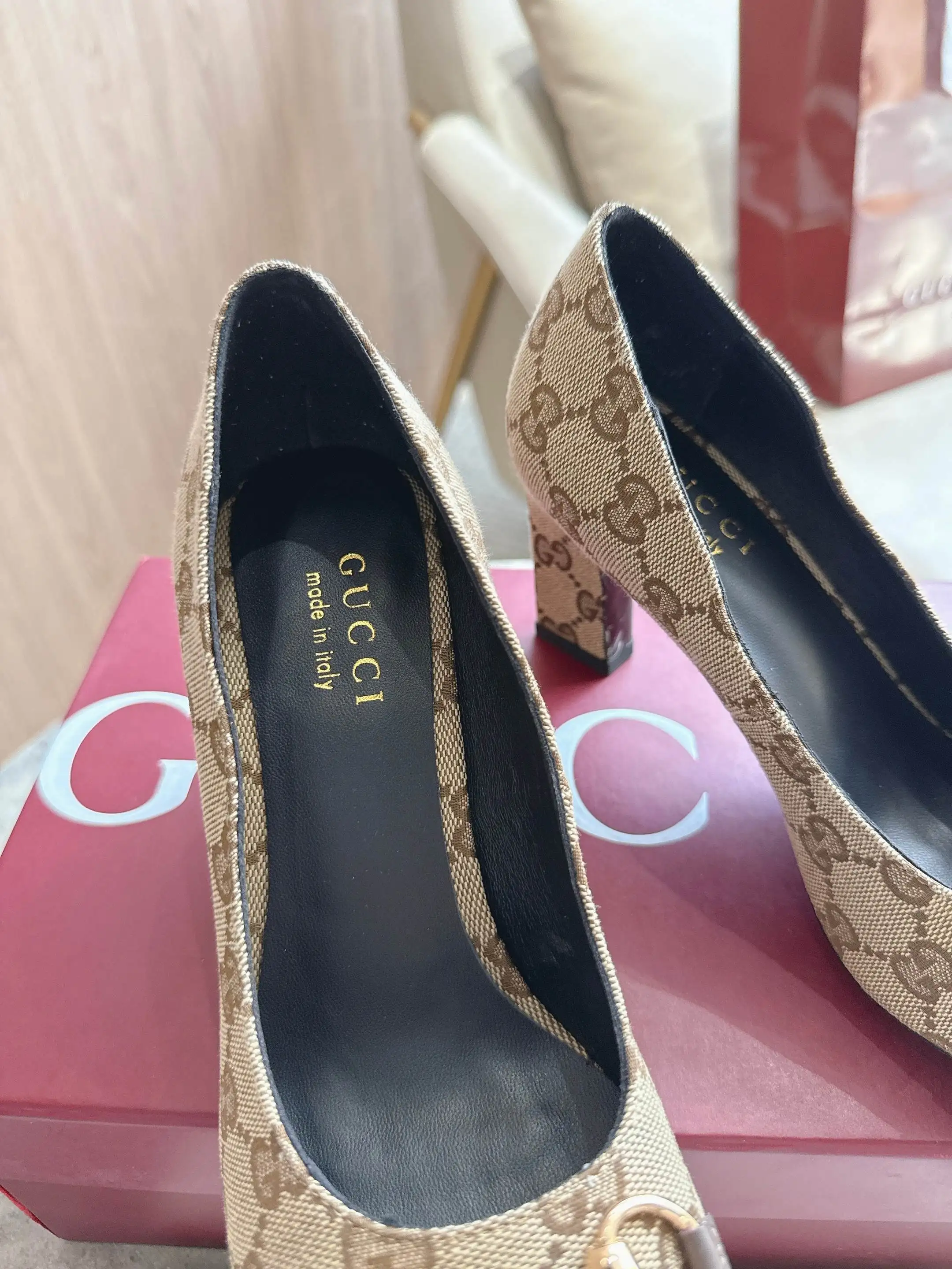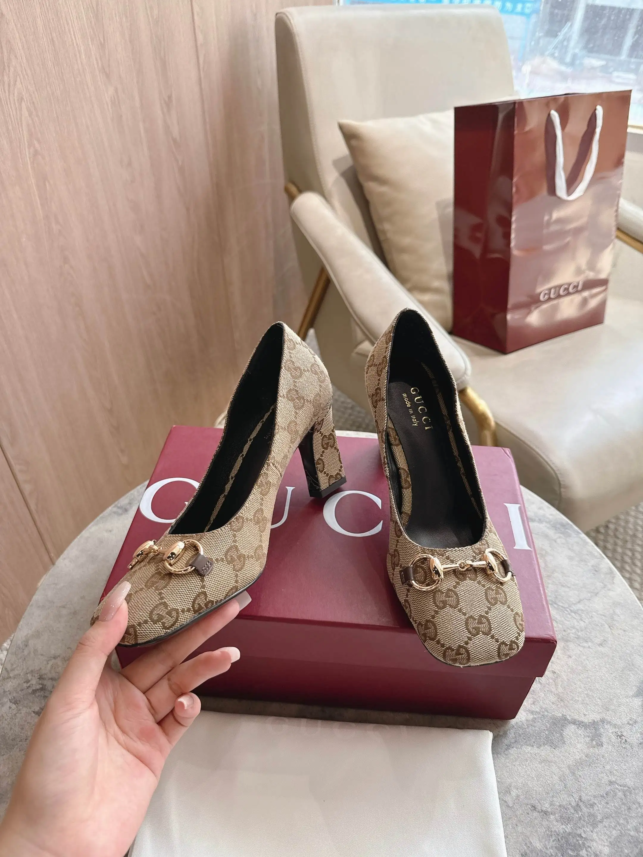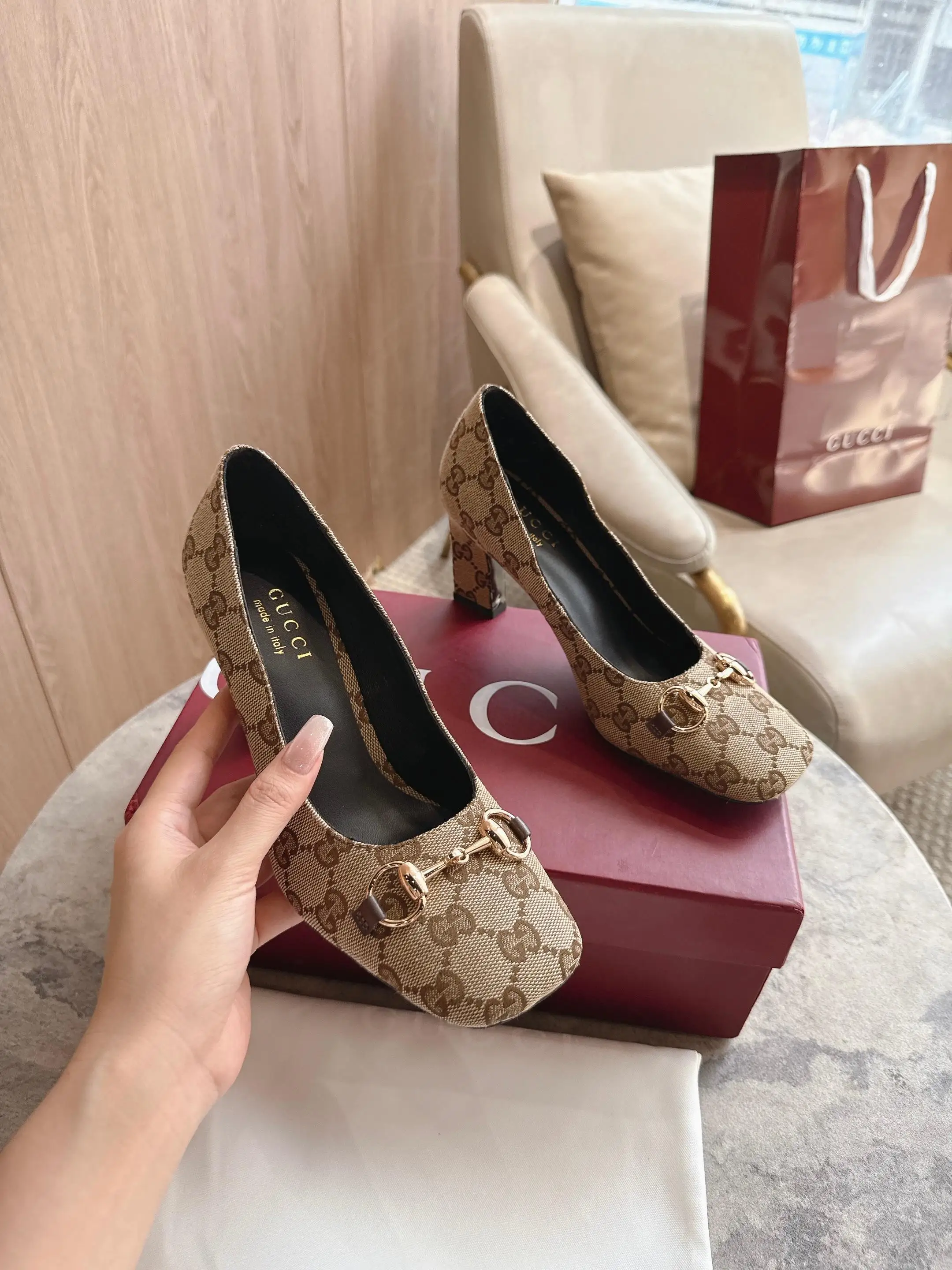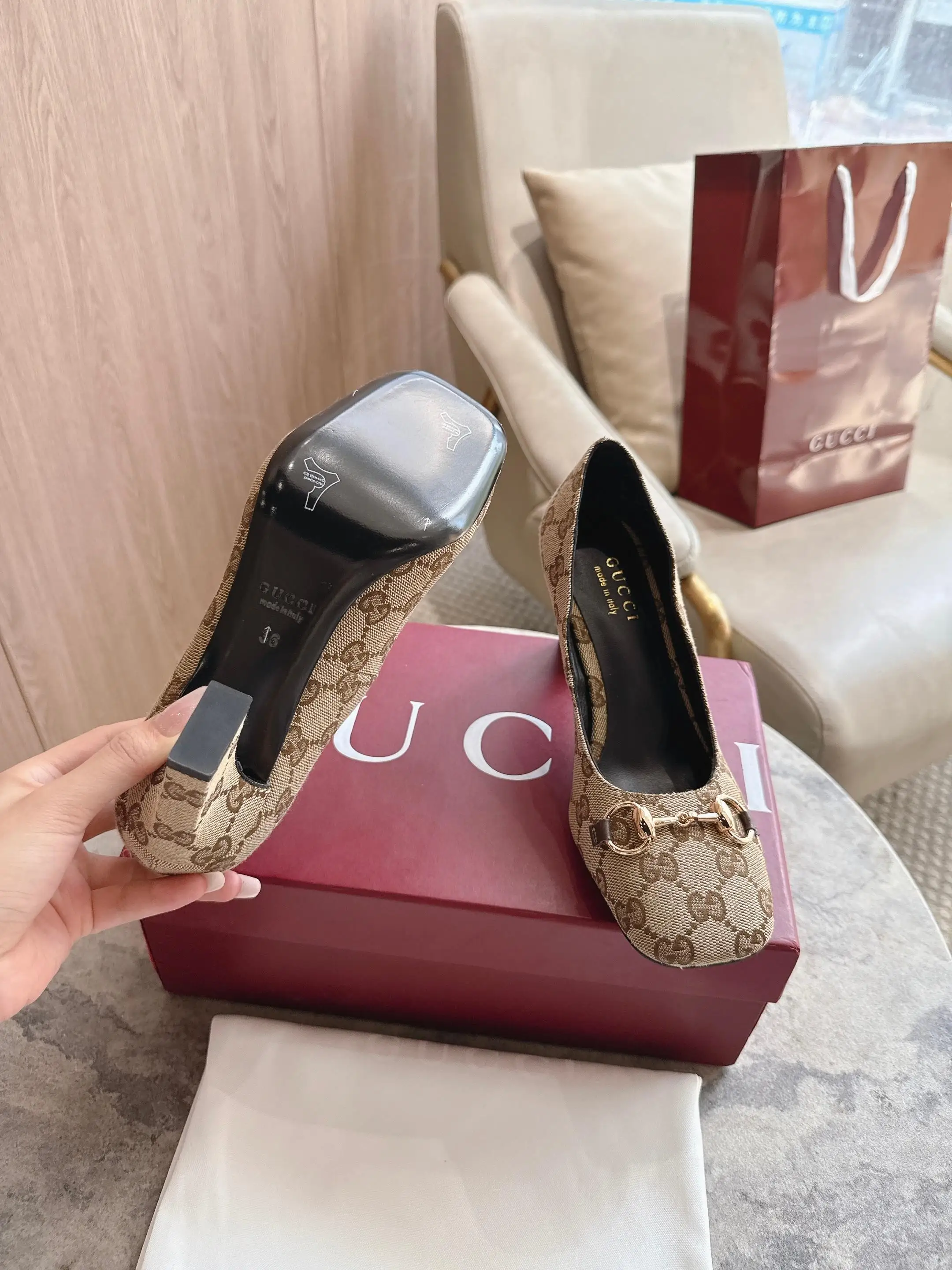 马衔扣和同款金属质感饰面 Made in Italy by Gucci 标识