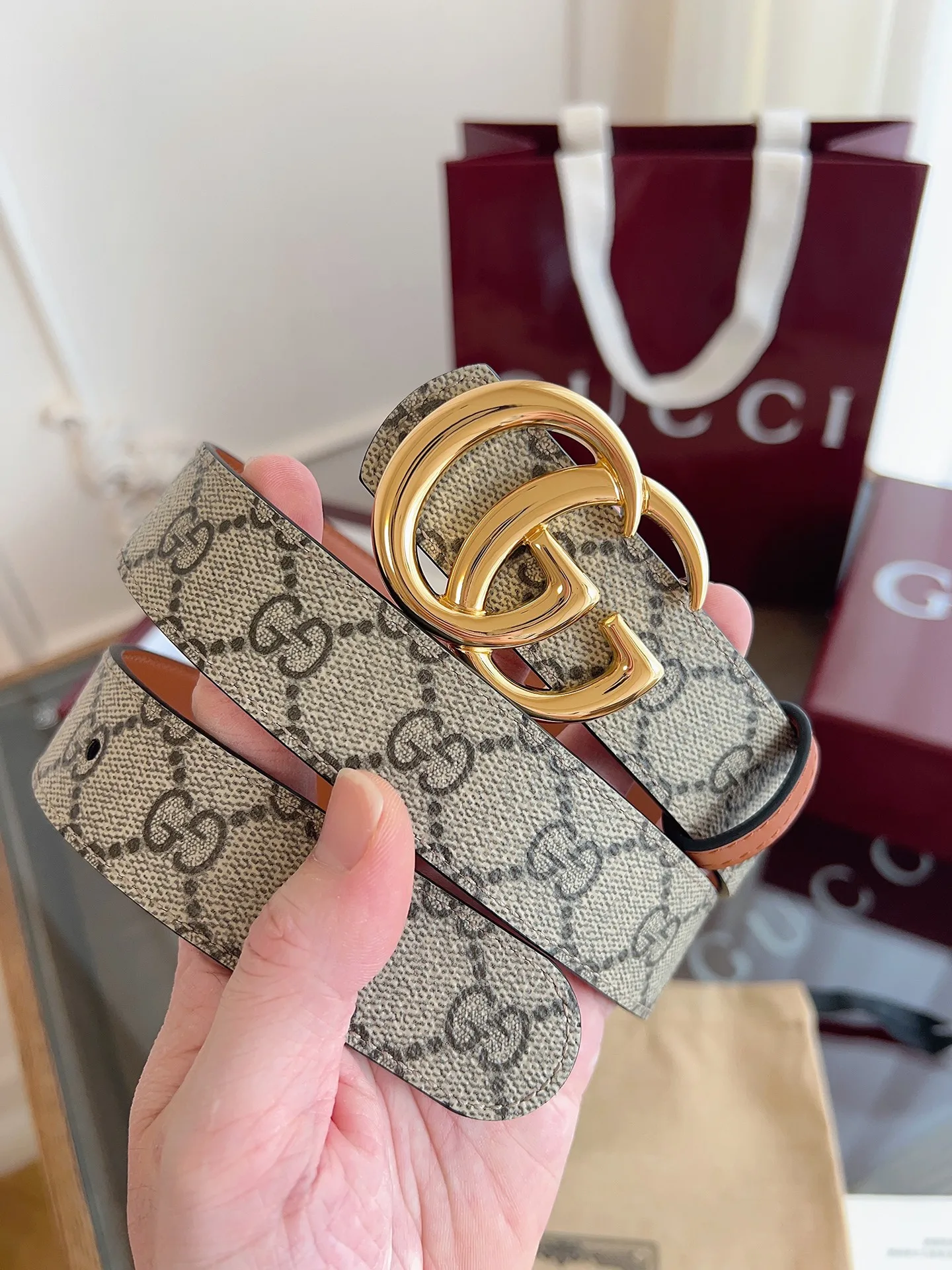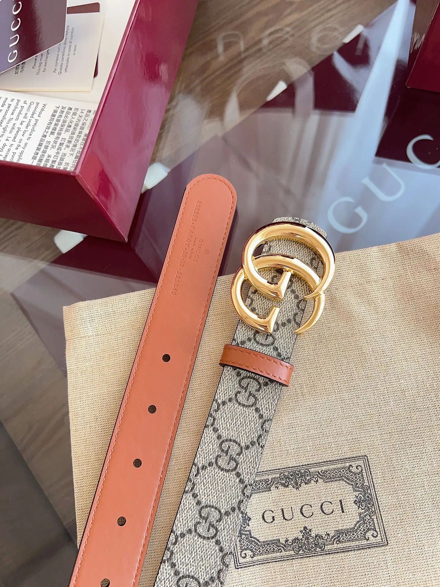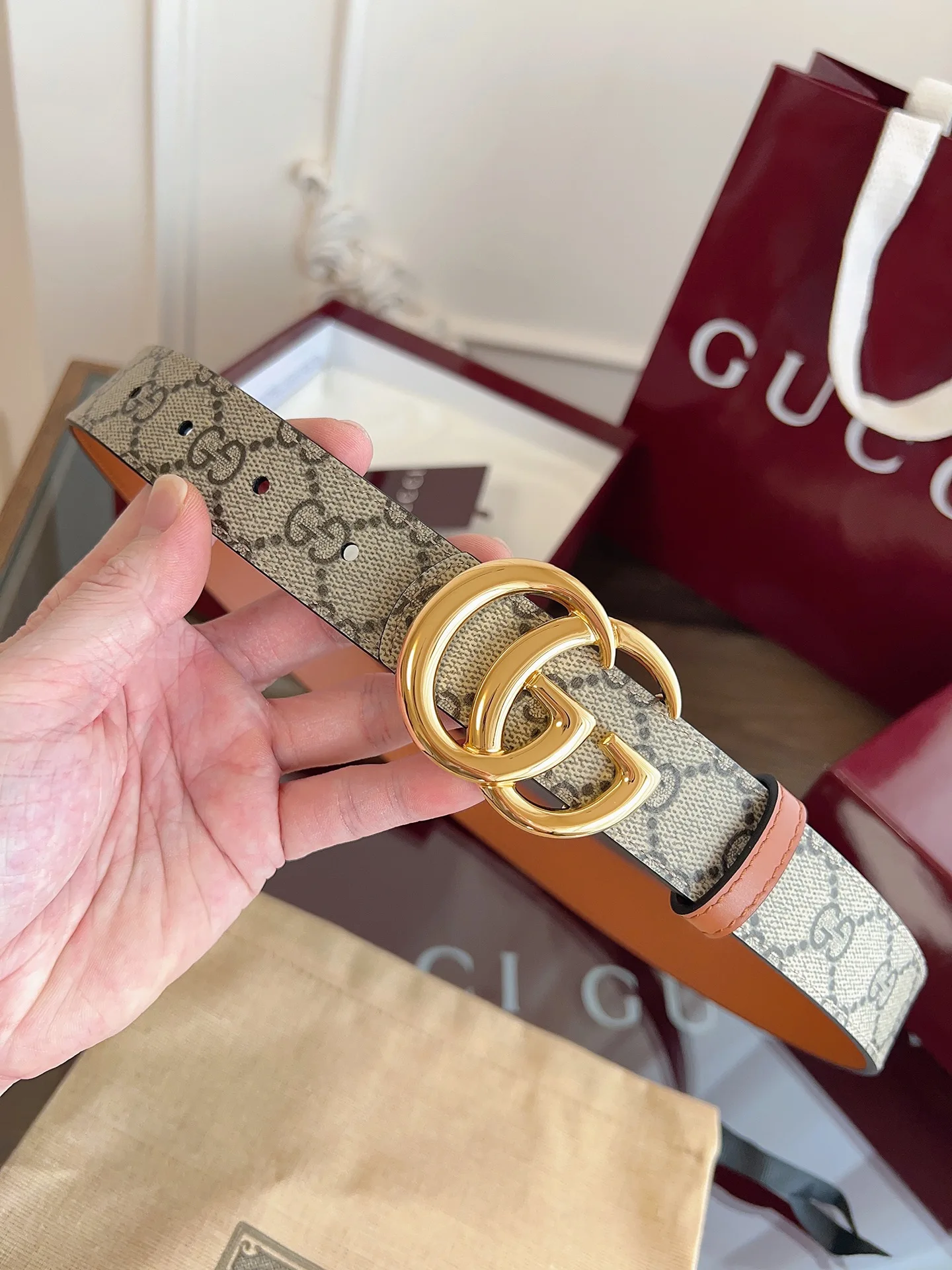绝美gucci G女式新款腰帶 專櫃同步 寬3.0厘米 帶身帆布杏老花-拼進口小牛皮棕色 精緻真空電鍍双G型鋼扣 雙面可用
