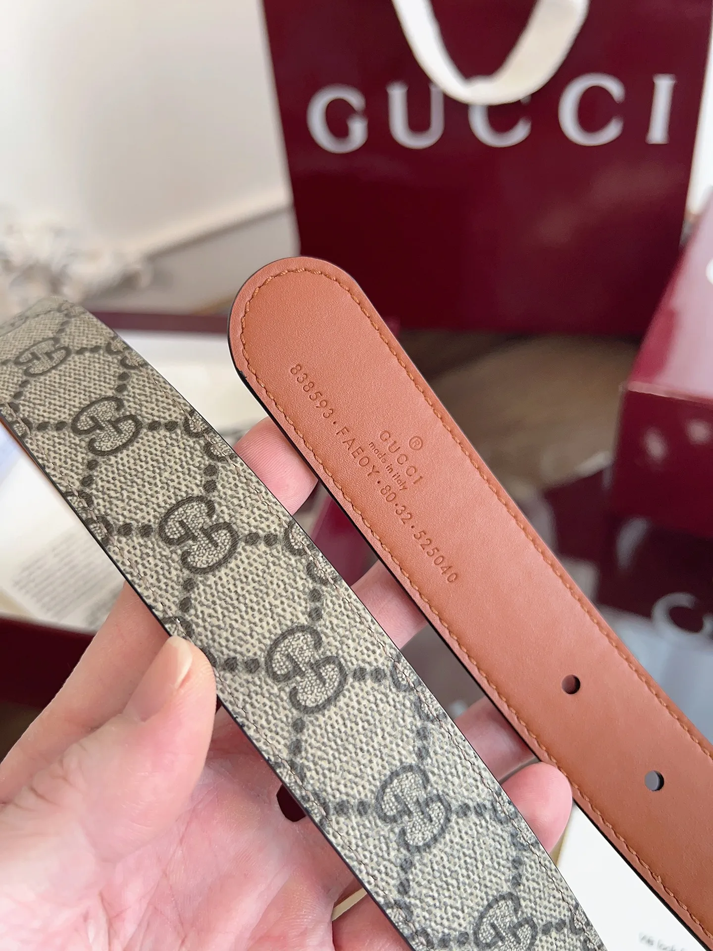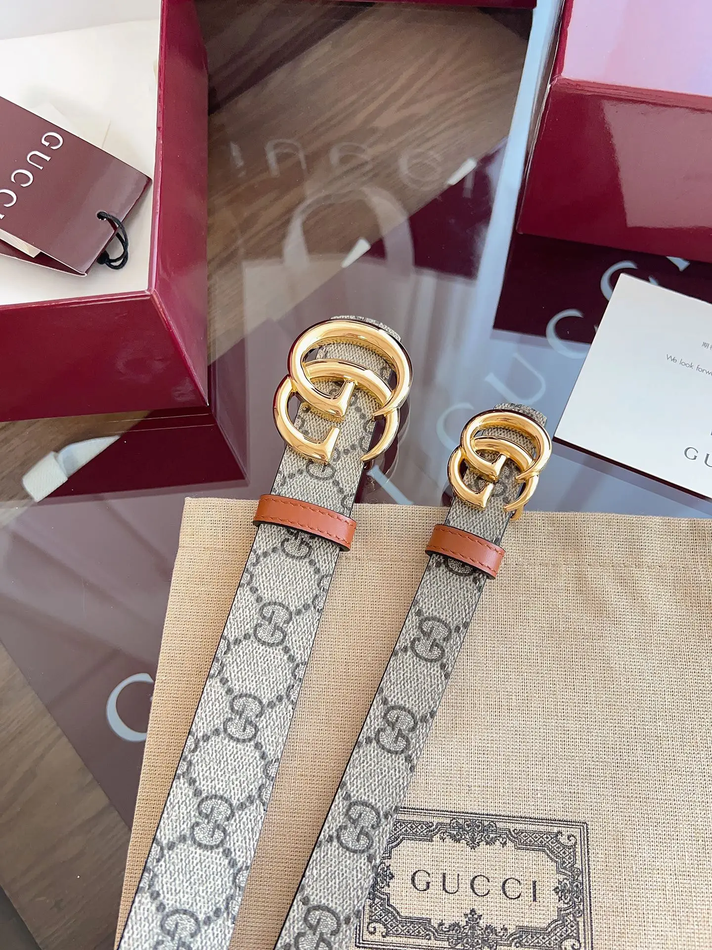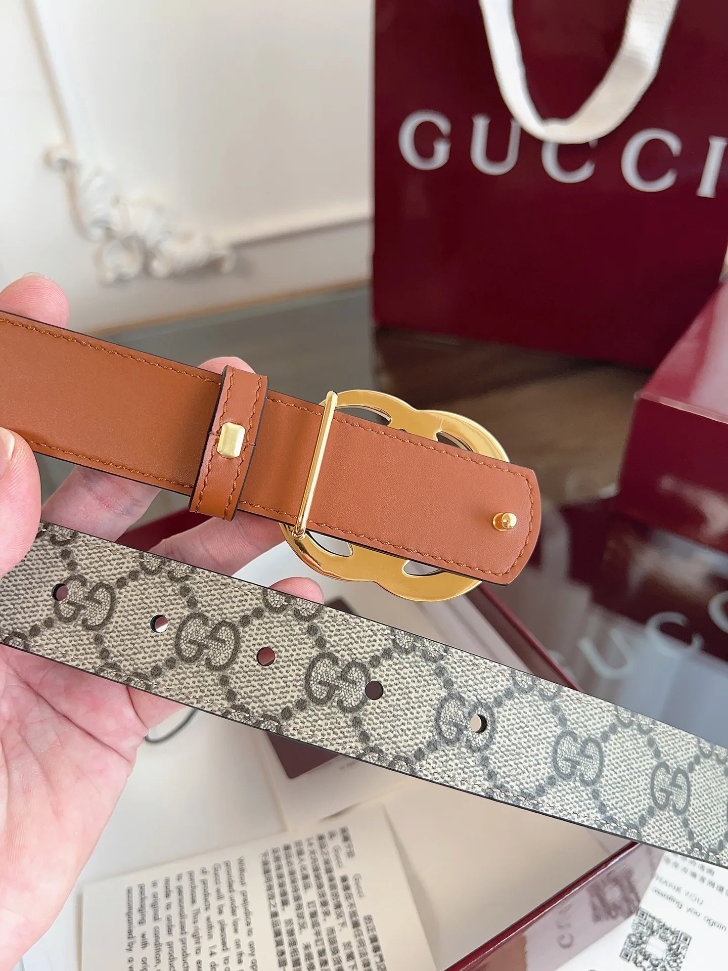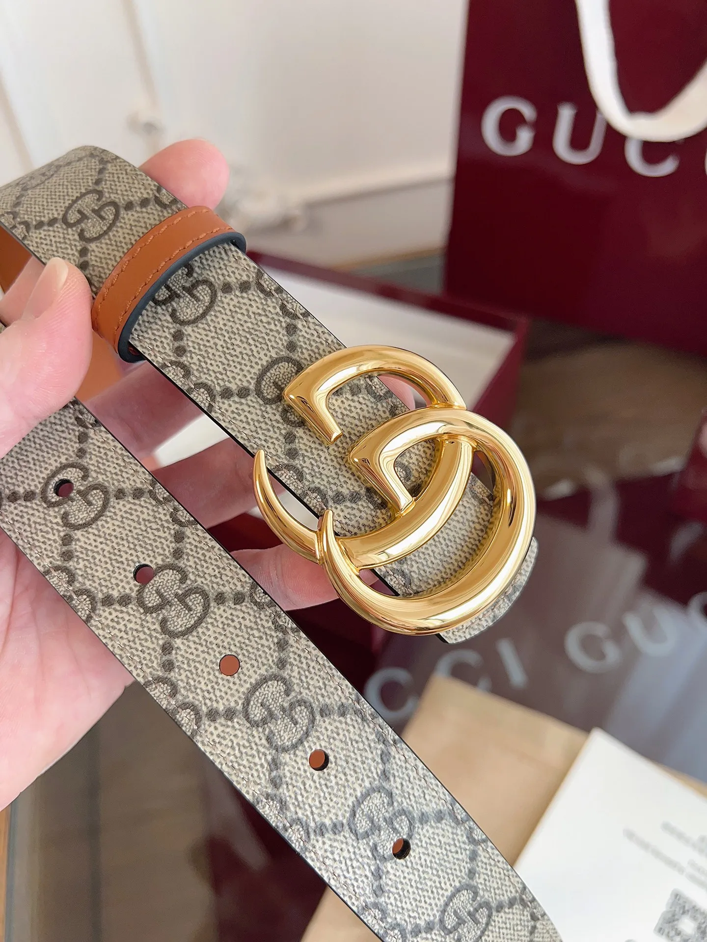 绝美gucci G女式新款腰帶 專櫃同步 寬3.0厘米 帶身帆布杏老花-拼進口小牛皮棕色 精緻真空電鍍双G型鋼扣 雙面可用