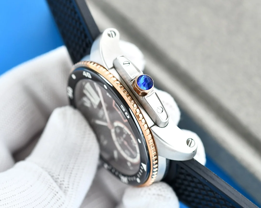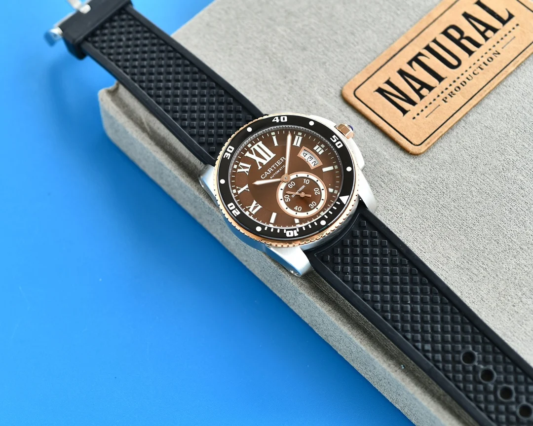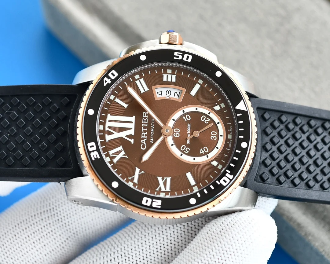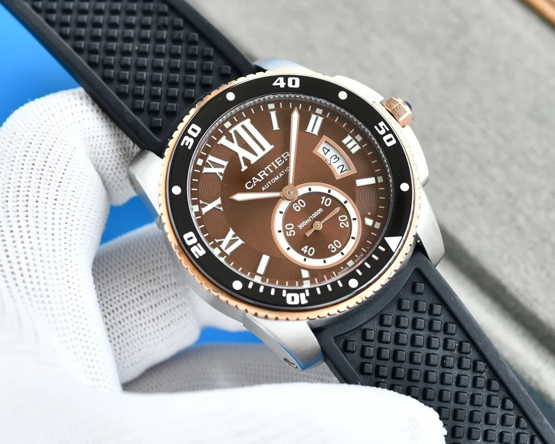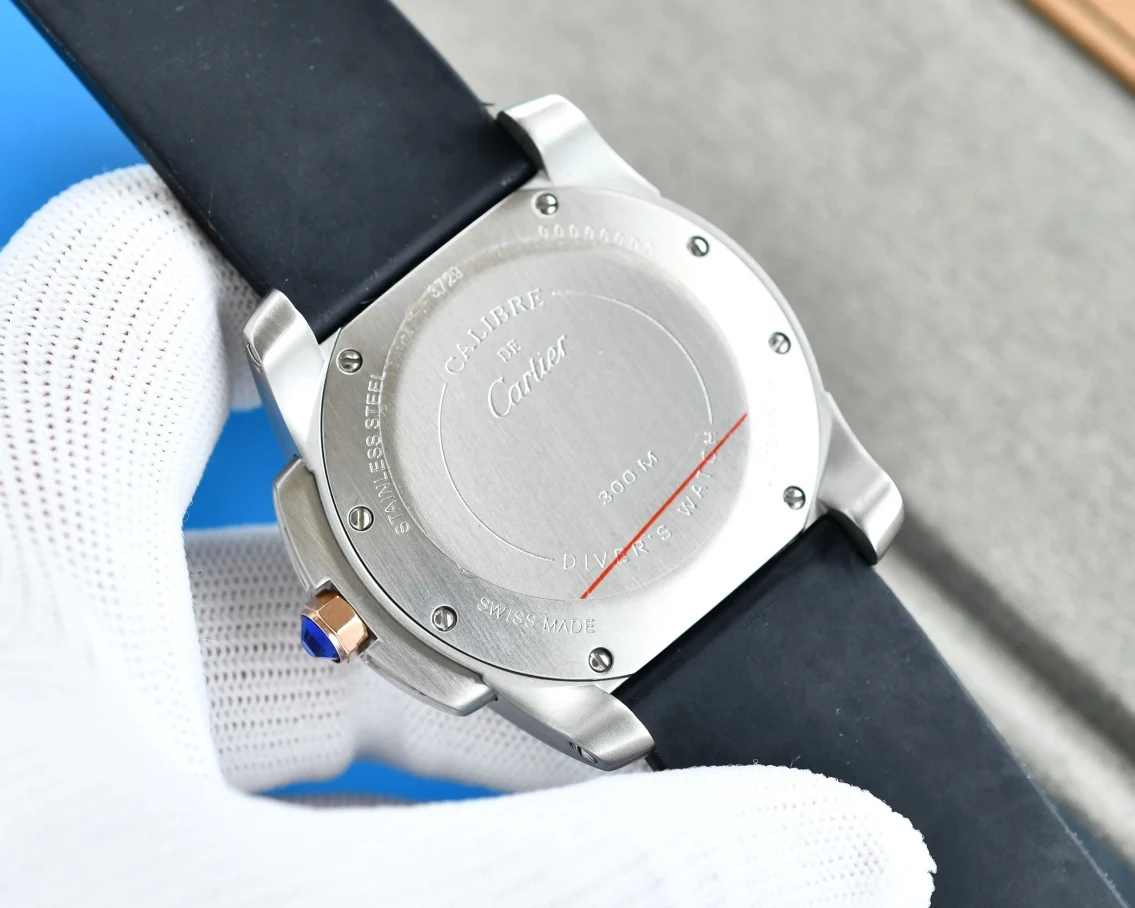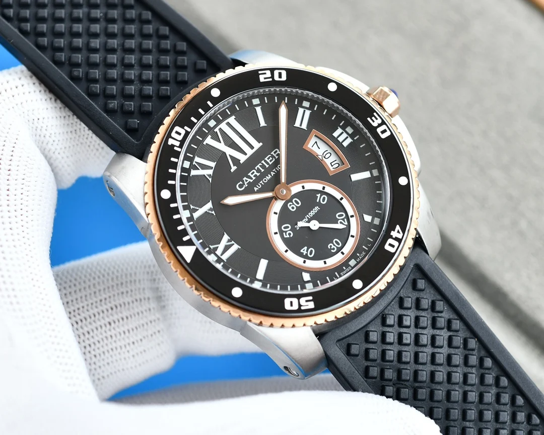 卡地亚卡利博CALIBRE DE CARTIER潜水系列 腕表堪称卡地亚新一代标志性杰作 316精钢表壳 陶瓷超夜光圈口 超强表盘夜光丁 日历与正品一致黑色底白字体显示 蓝宝石蓝光玻璃镜面 42x11mm 搭载Cal.1904-PS 自动机械机芯 进口天然橡胶表带 Super LumiNova夜光涂层三角时标 时尚与运动结合的潜水表硬朗而霸气 佩戴能突出男士魅力 彰显气质