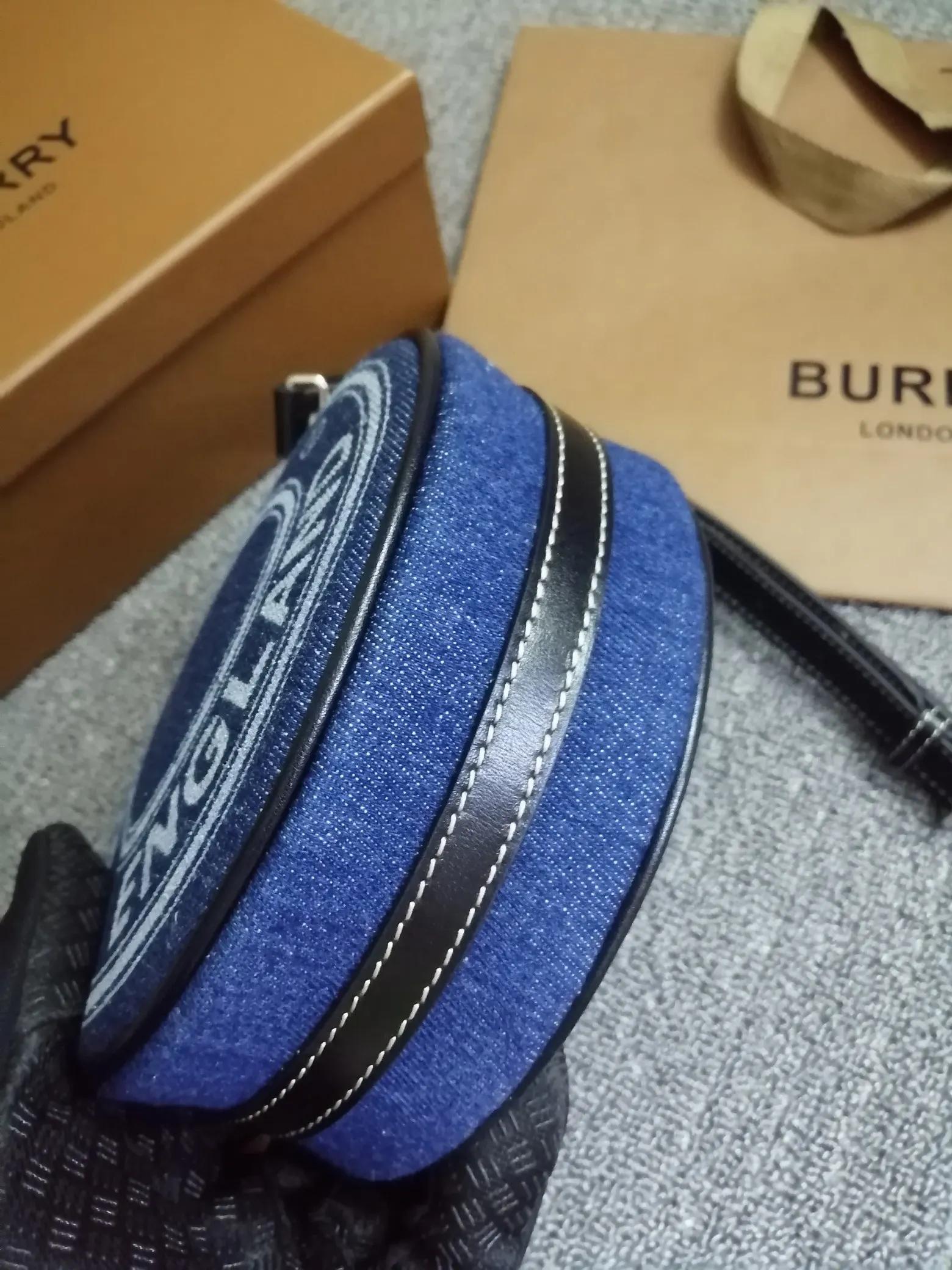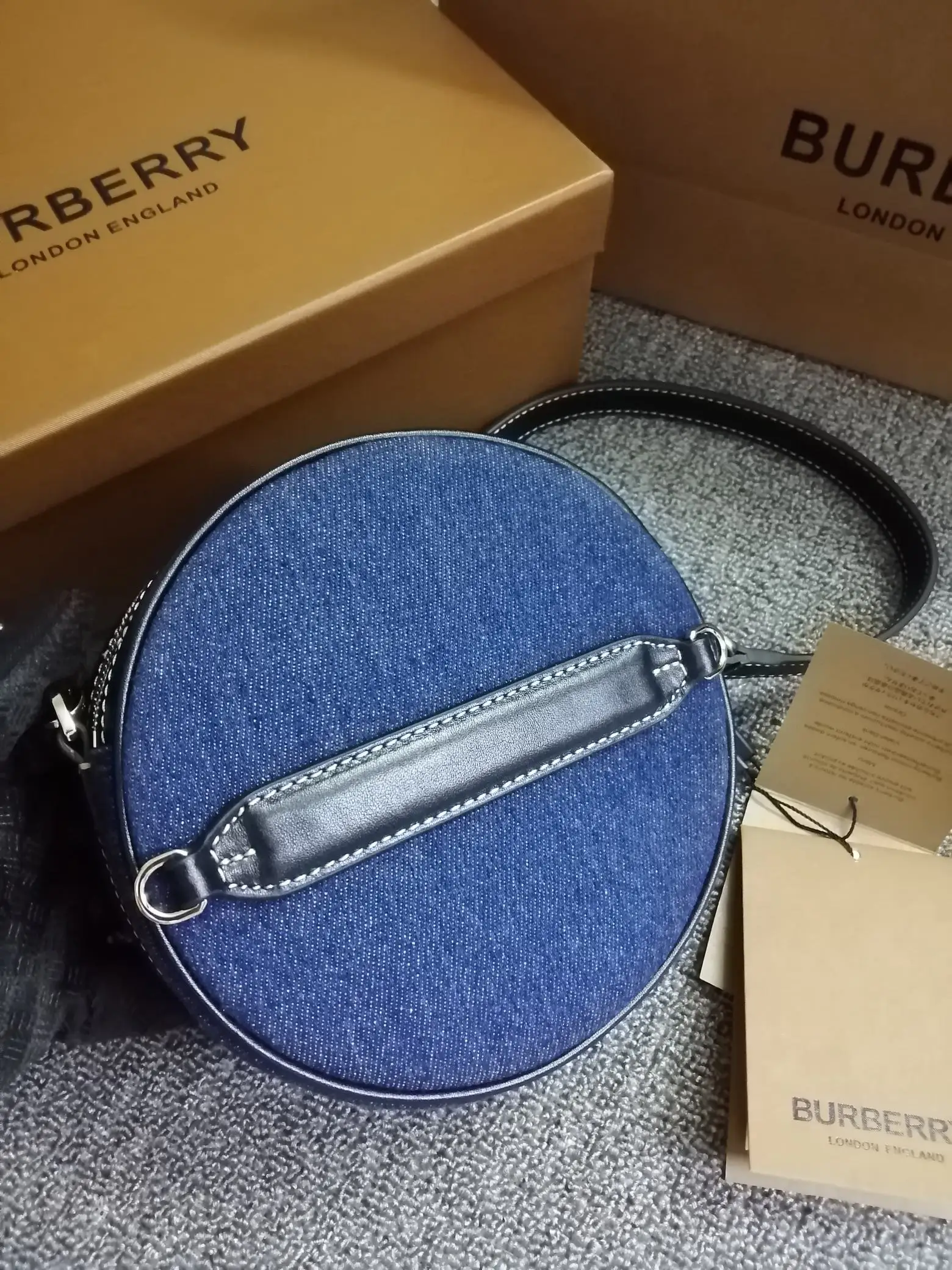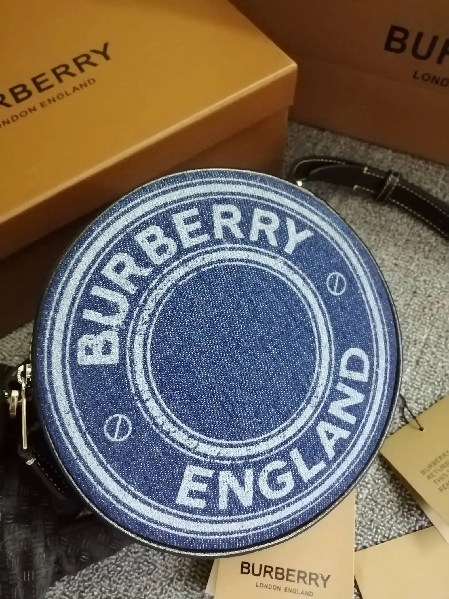 B家最新精巧的圆形 Louise - 路易丝包 选用饰有徽标图案的牛仔布与缉明线皮革精制而成 圆弧造型灵感来自品牌 1988 年典藏包款 包款可斜背 或卸下背带缔造手拿包造型 编号 90222