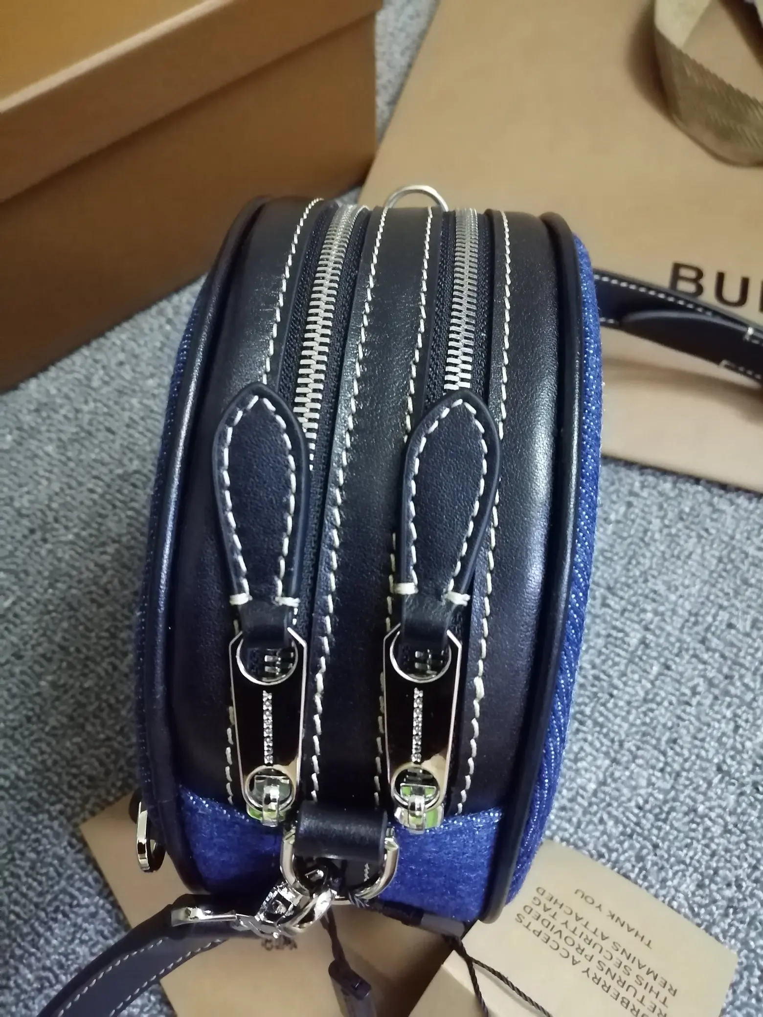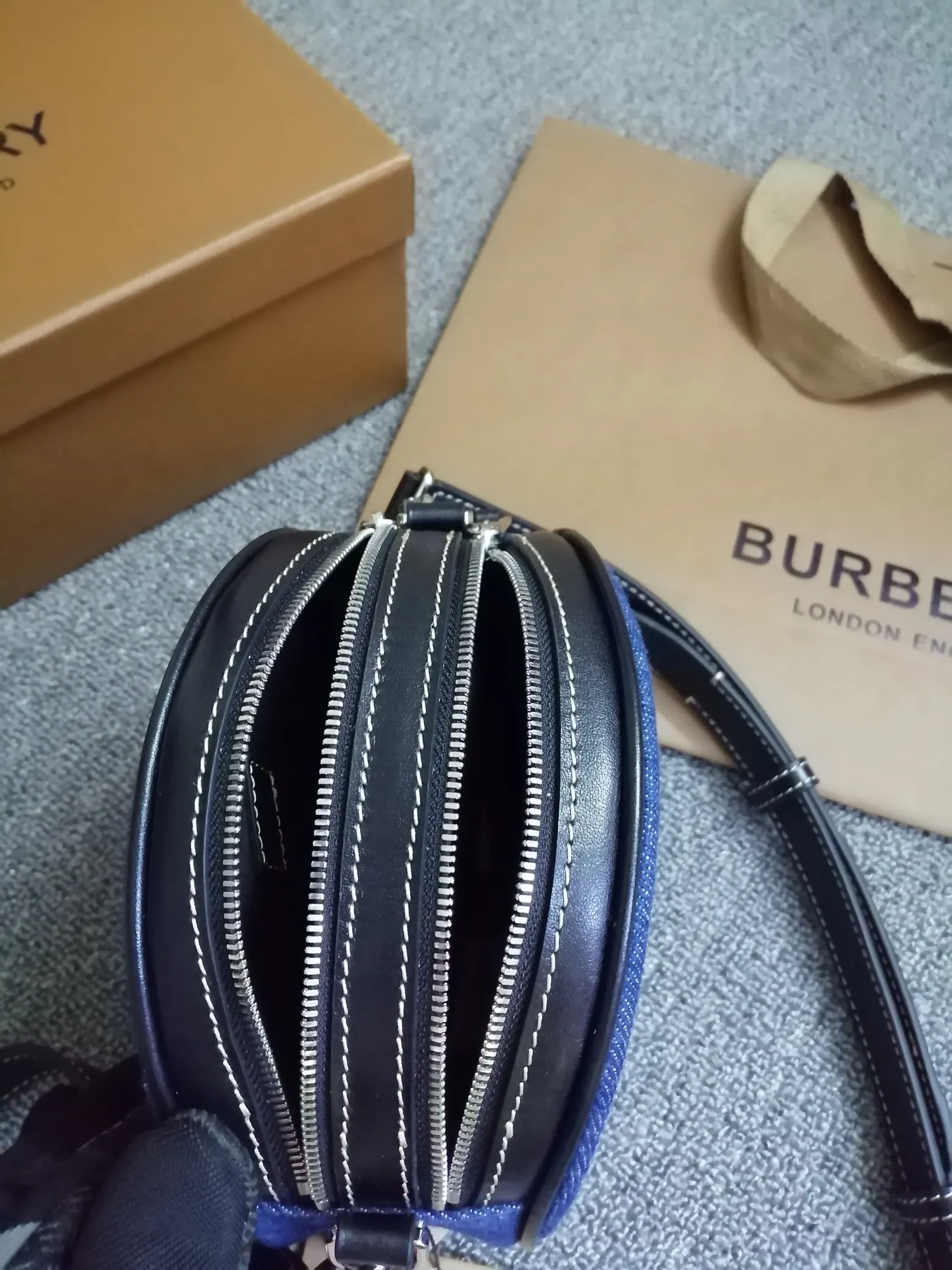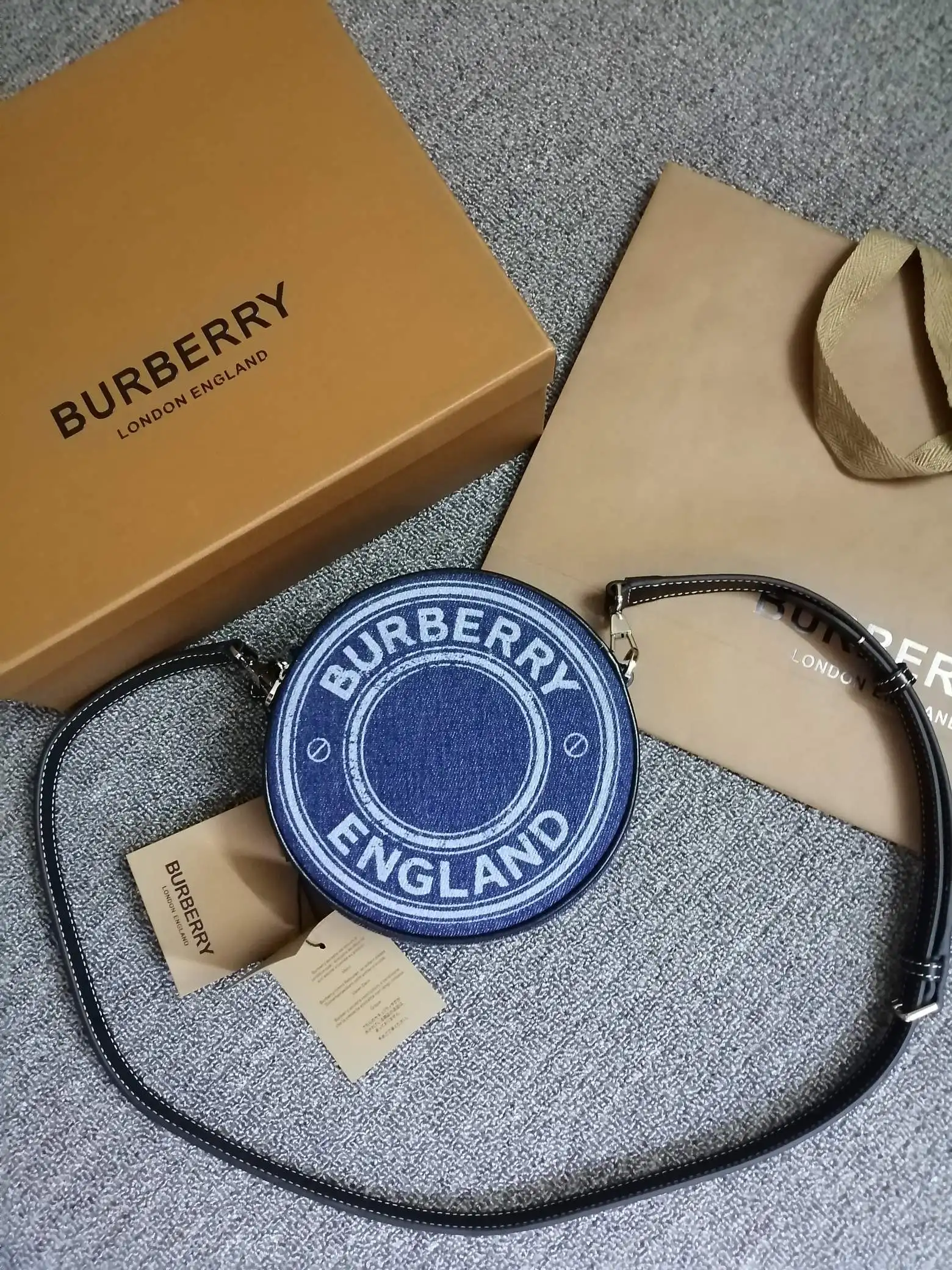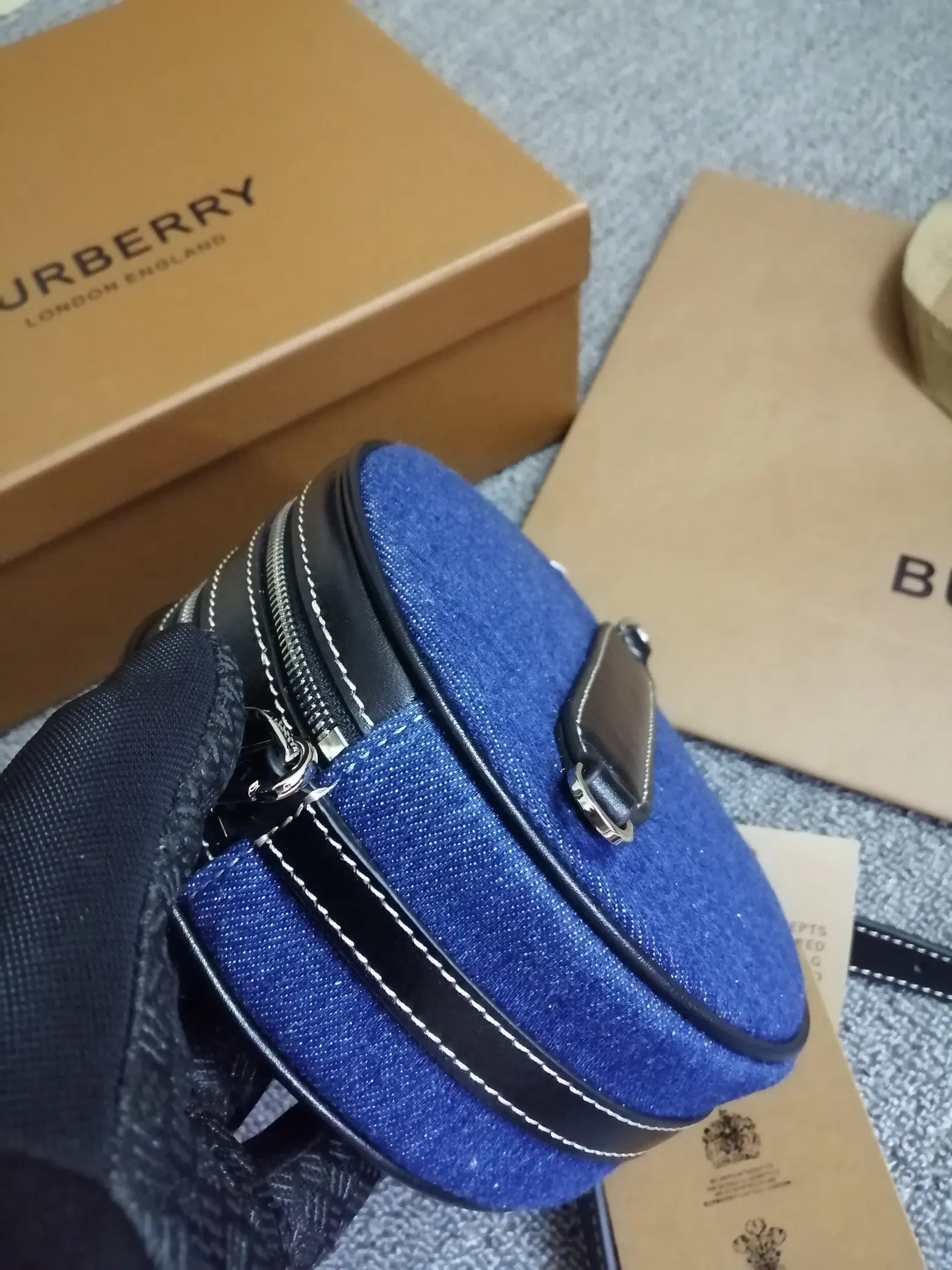 B家最新精巧的圆形 Louise - 路易丝包 选用饰有徽标图案的牛仔布与缉明线皮革精制而成 圆弧造型灵感来自品牌 1988 年典藏包款 包款可斜背 或卸下背带缔造手拿包造型 编号 90222