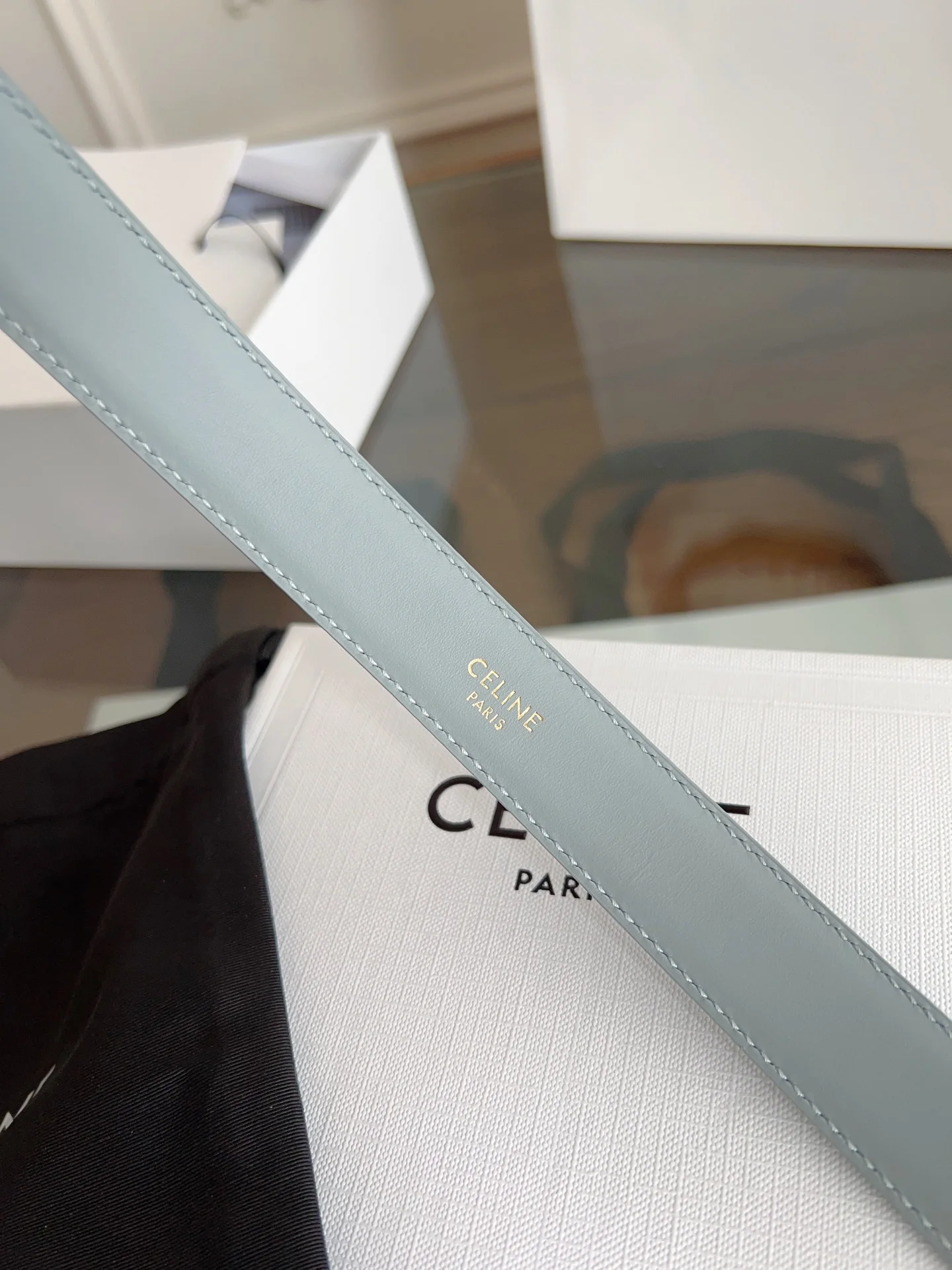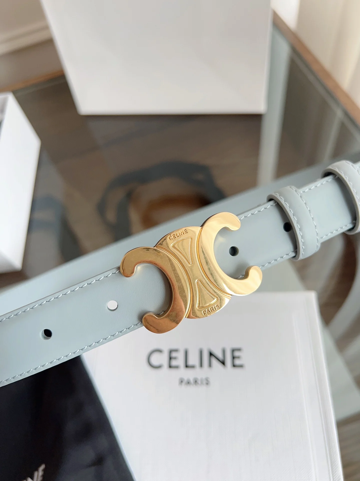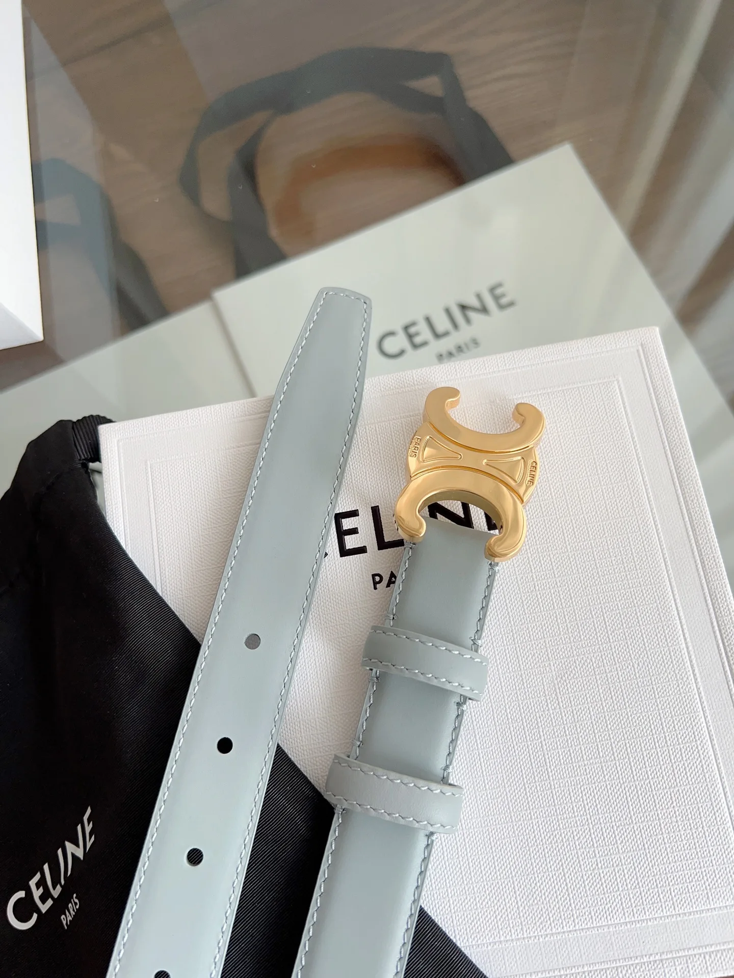 赛琳 CELINE女士皮带 小牛皮质感搭配独特凯旋门扣 颜色灰蓝色 宽2.5cm 低调中暗藏奢华 轻松点亮穿搭 手工缝制