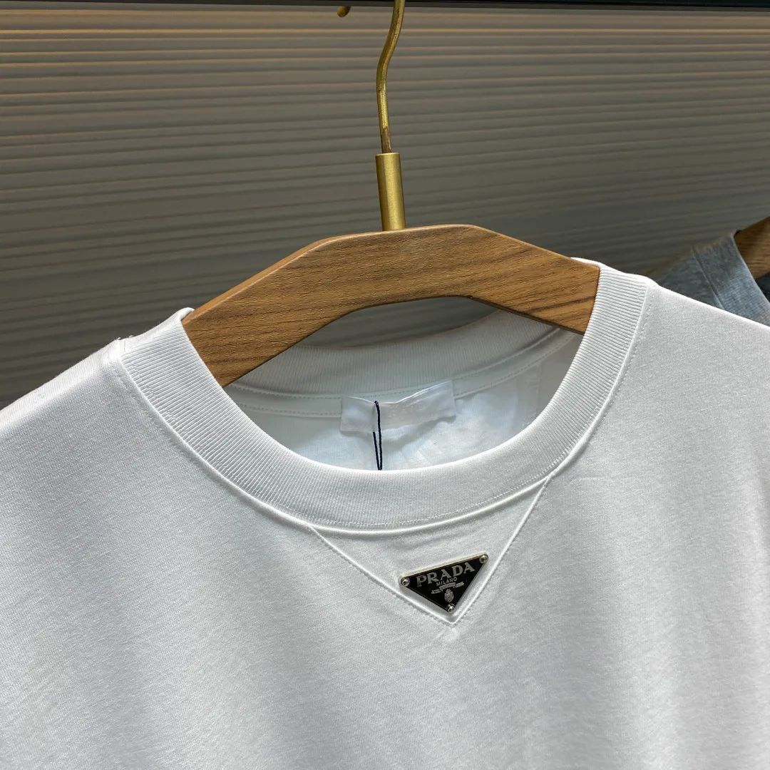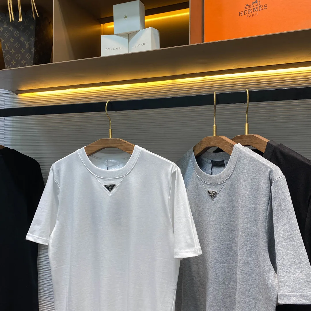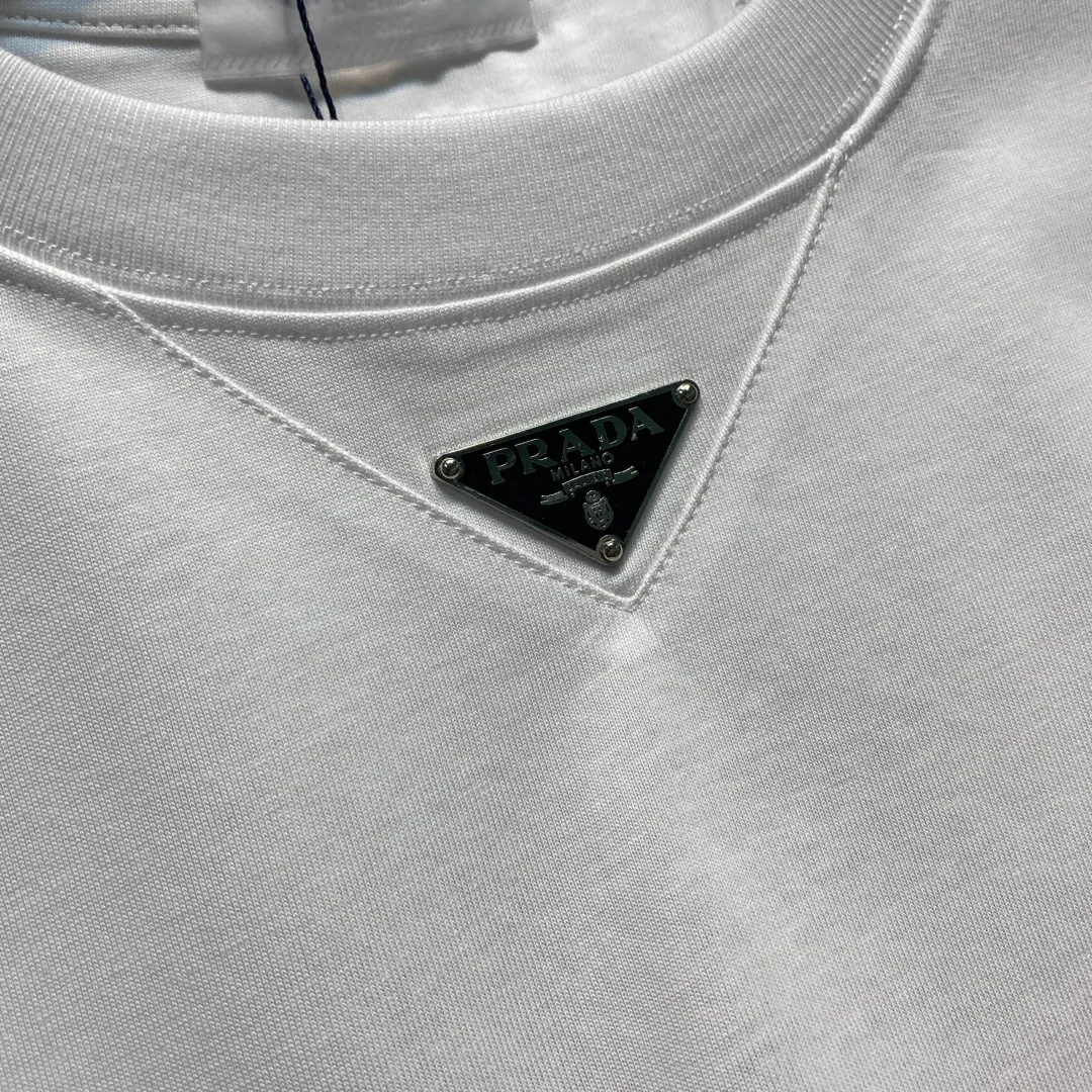 PRA26SS春夏新款平纹针织棉布基础圆领短Tee 男女同款领口下方金属三角标徽章休闲短袖T恤衫 男生体重130斤以内选择S码 130-143斤选择M码 143-156斤选择L码 156-170斤选择XL码 170-185斤选择XXL码
