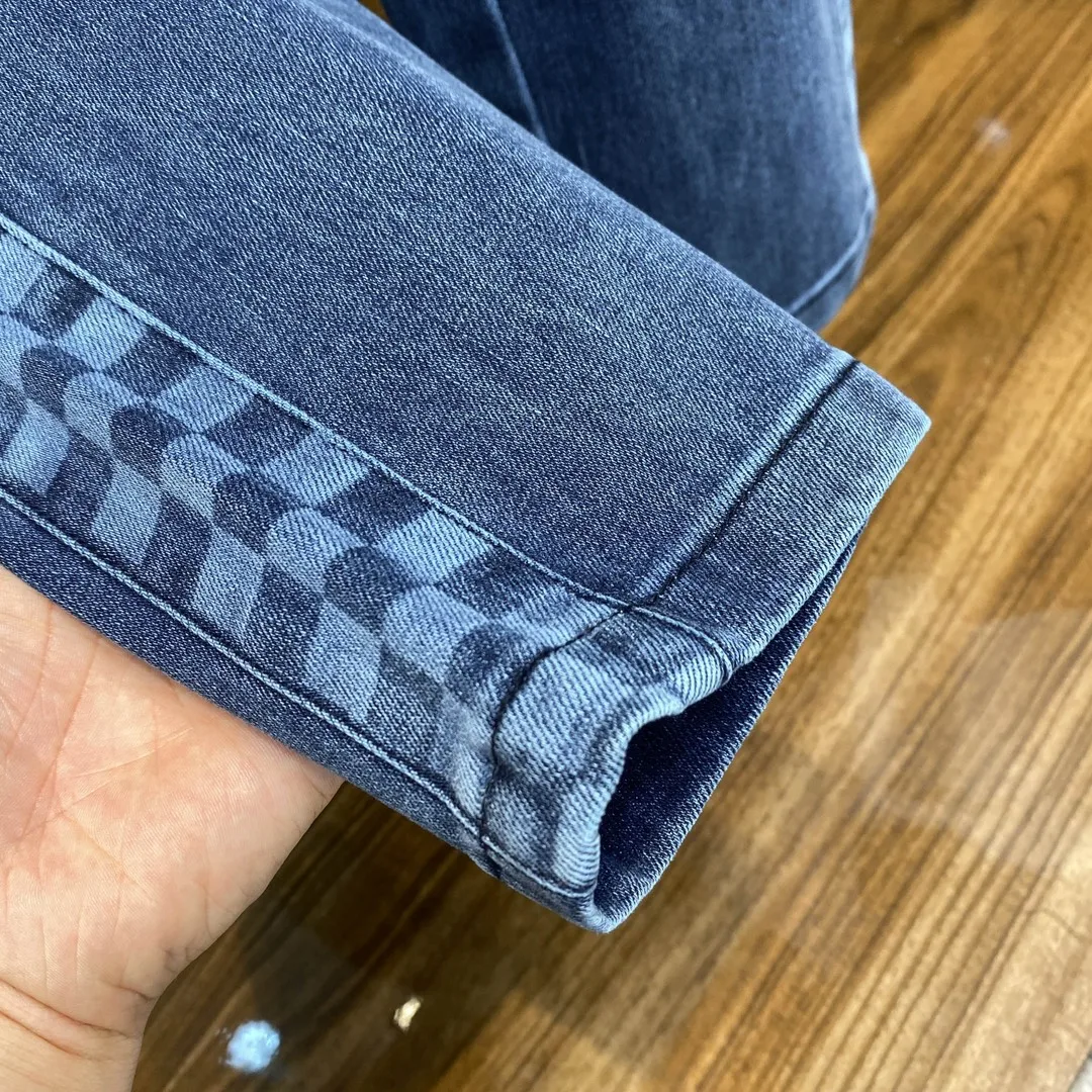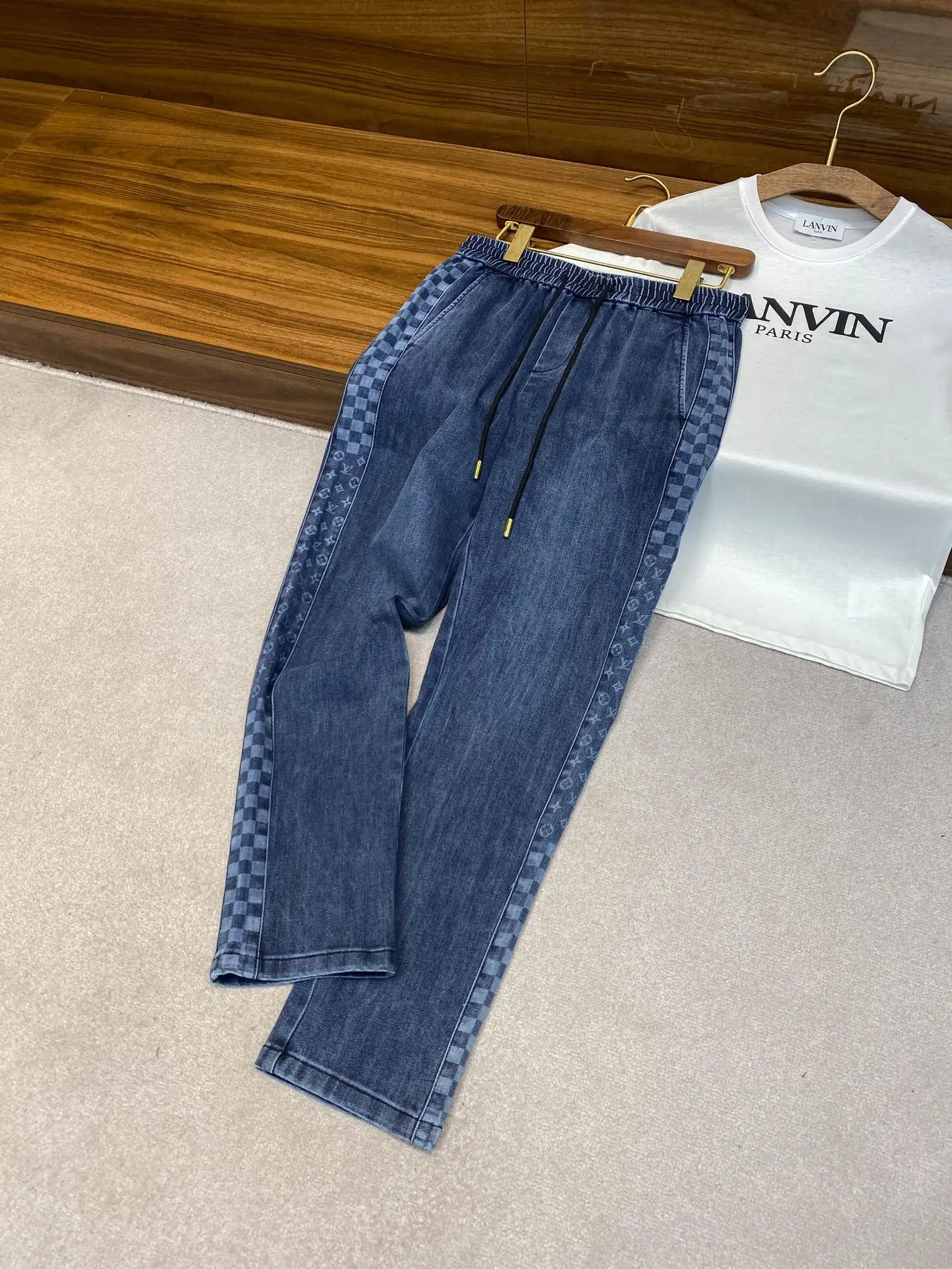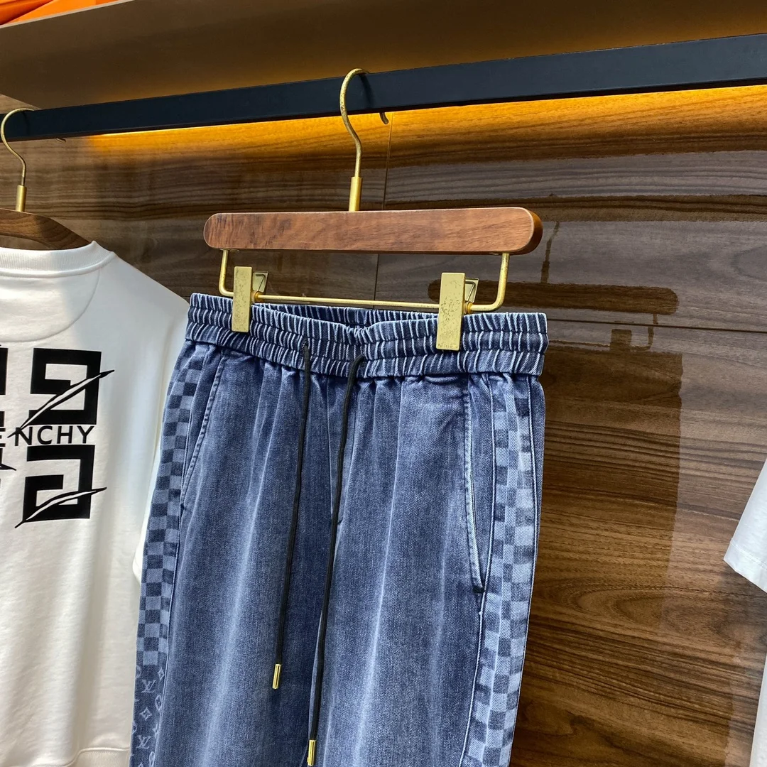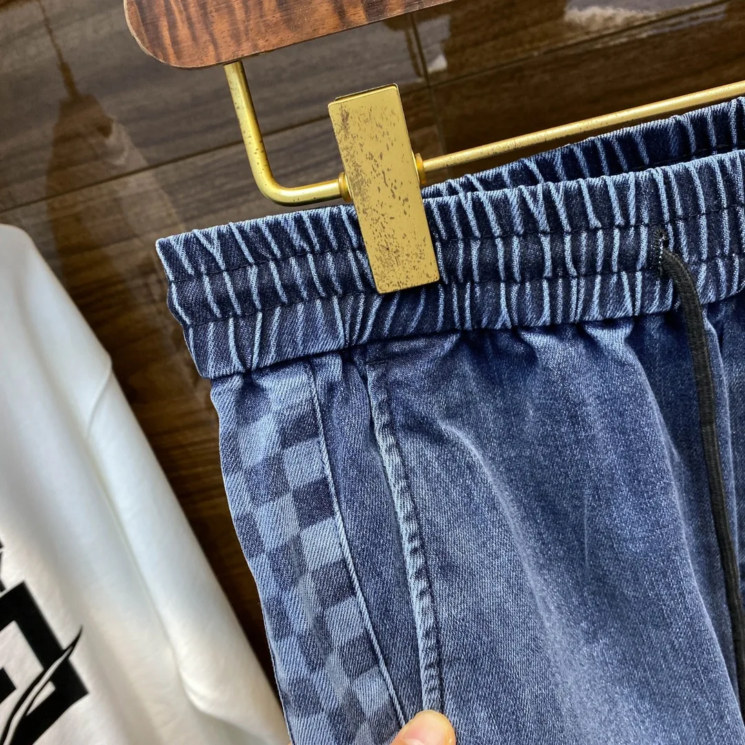 1V26 新款蓝色水洗抽绳牛仔裤 男女同款侧棋盘格老花图案休闲牛仔长裤 男生体重130斤以内选择M码 130-142斤选择L码 142-154斤选择XL码 154-168斤选择XXL码 168-183斤选择3XL码