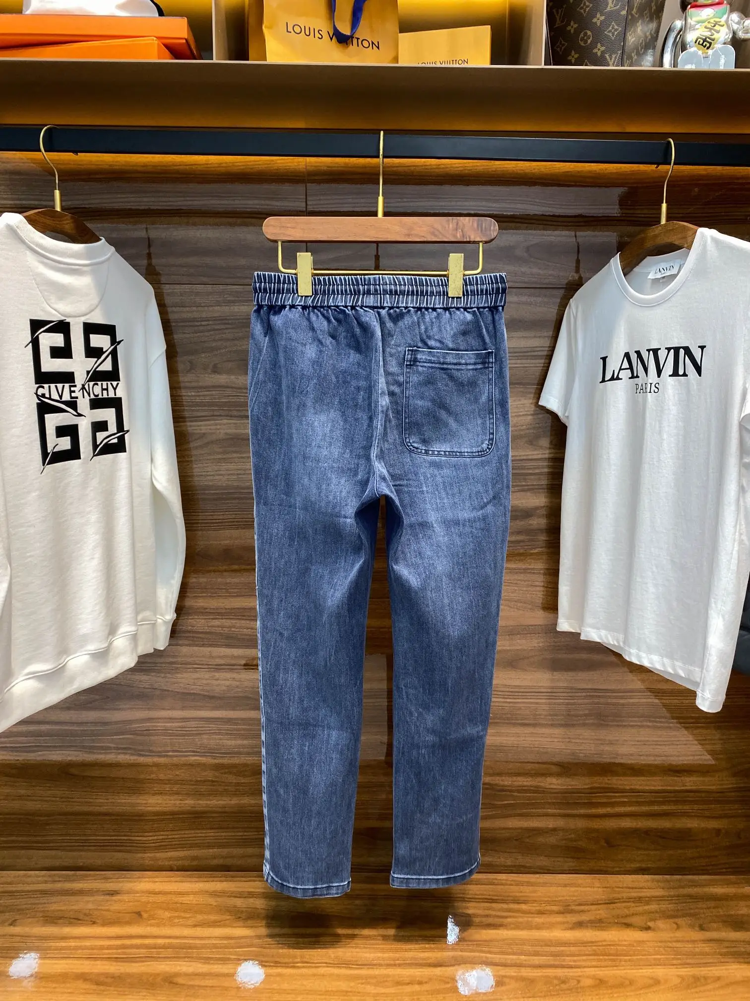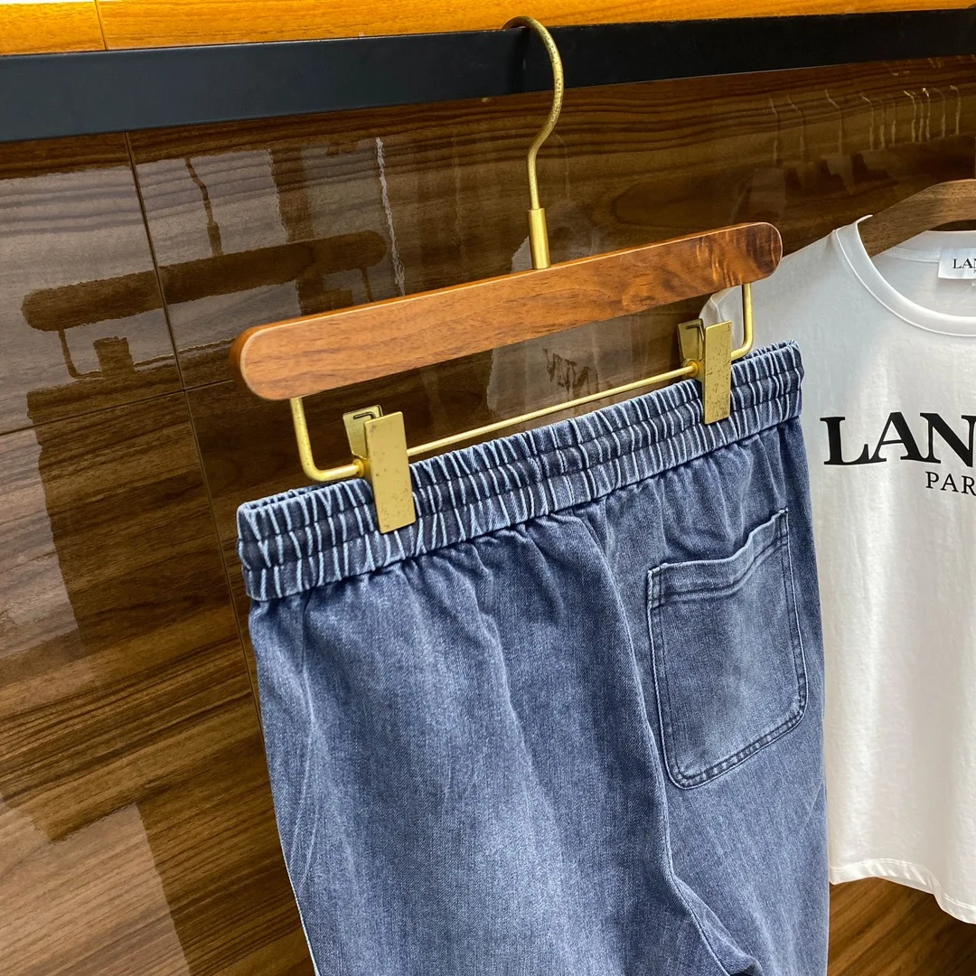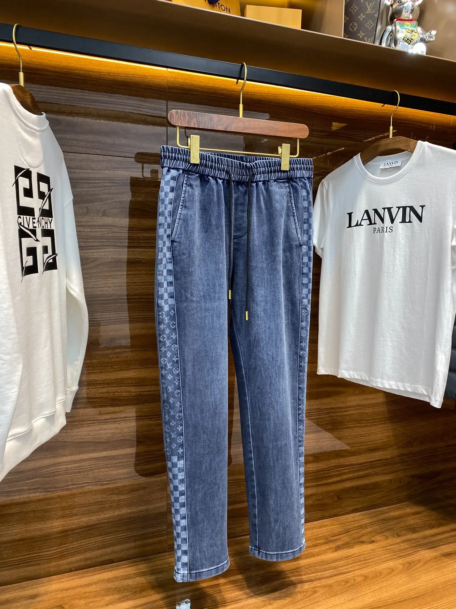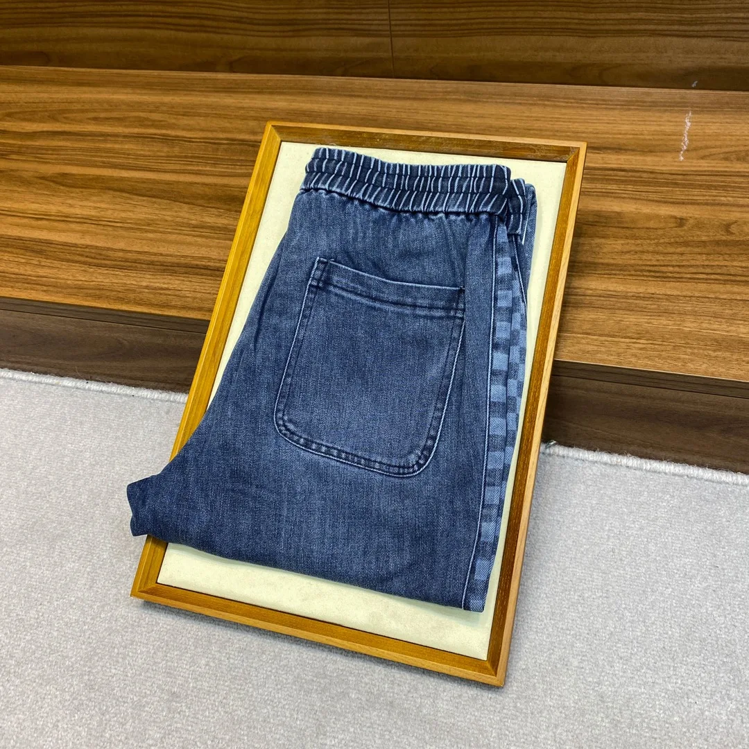 1V26 新款蓝色水洗抽绳牛仔裤 男女同款侧棋盘格老花图案休闲牛仔长裤 男生体重130斤以内选择M码 130-142斤选择L码 142-154斤选择XL码 154-168斤选择XXL码 168-183斤选择3XL码